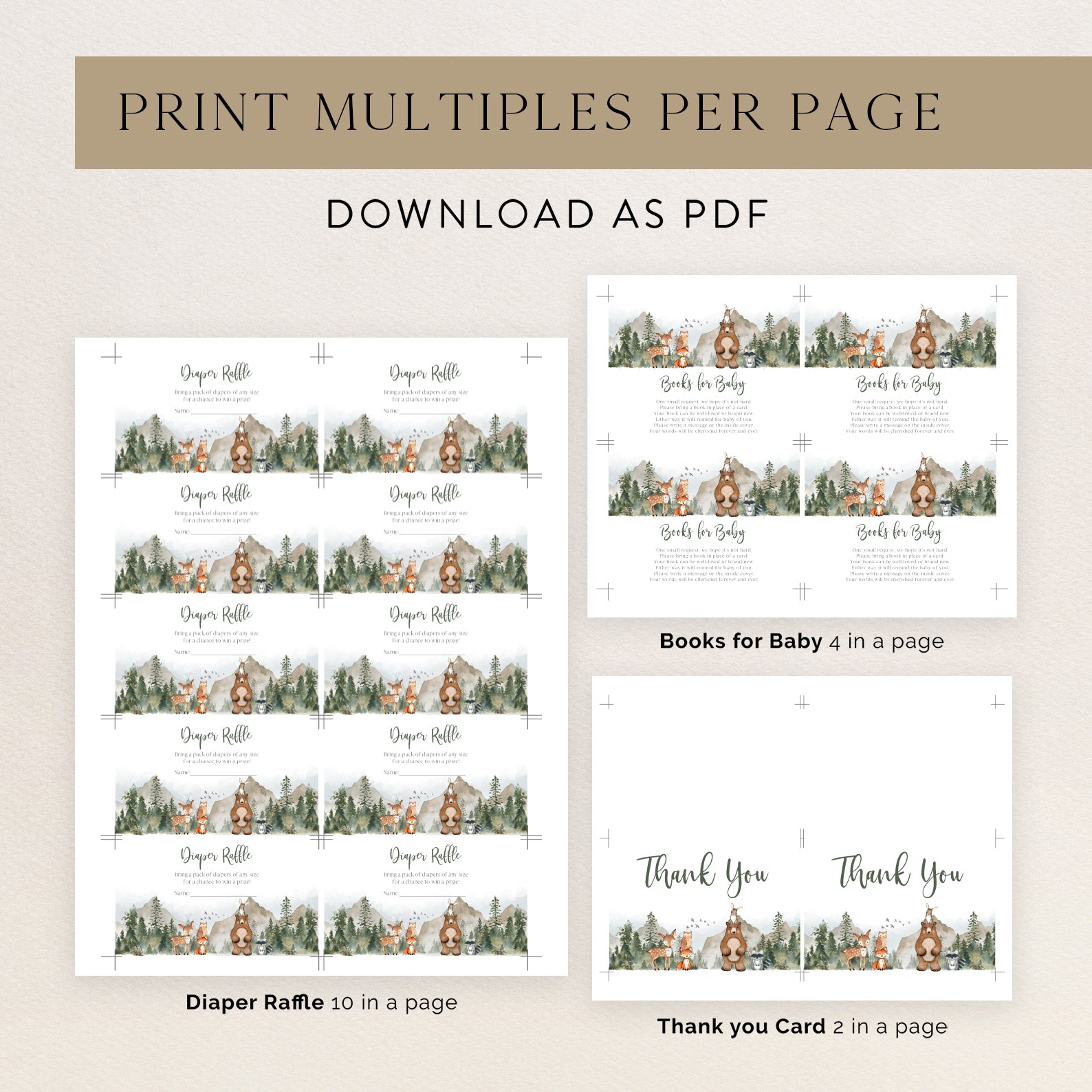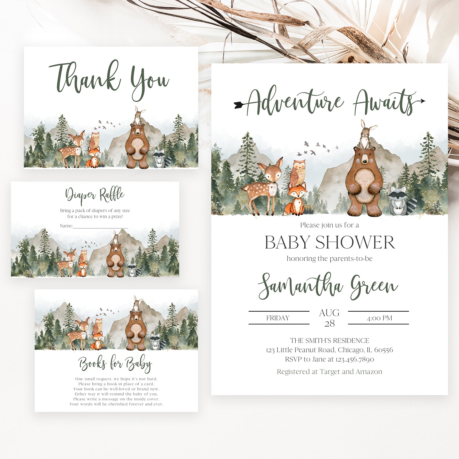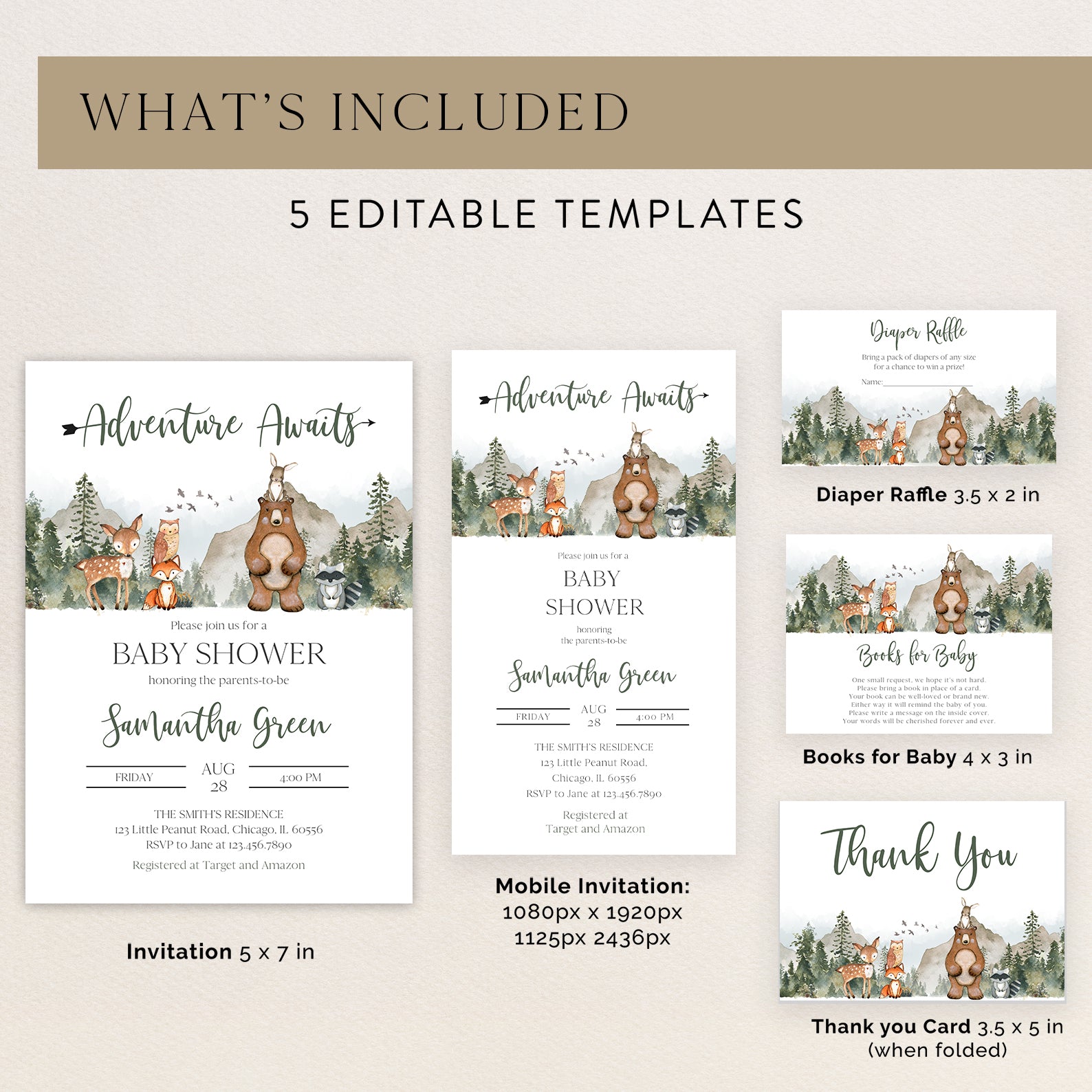 - Purchase this Adventure Awaits Baby Shower Invite Bundle with Woodland Animals template