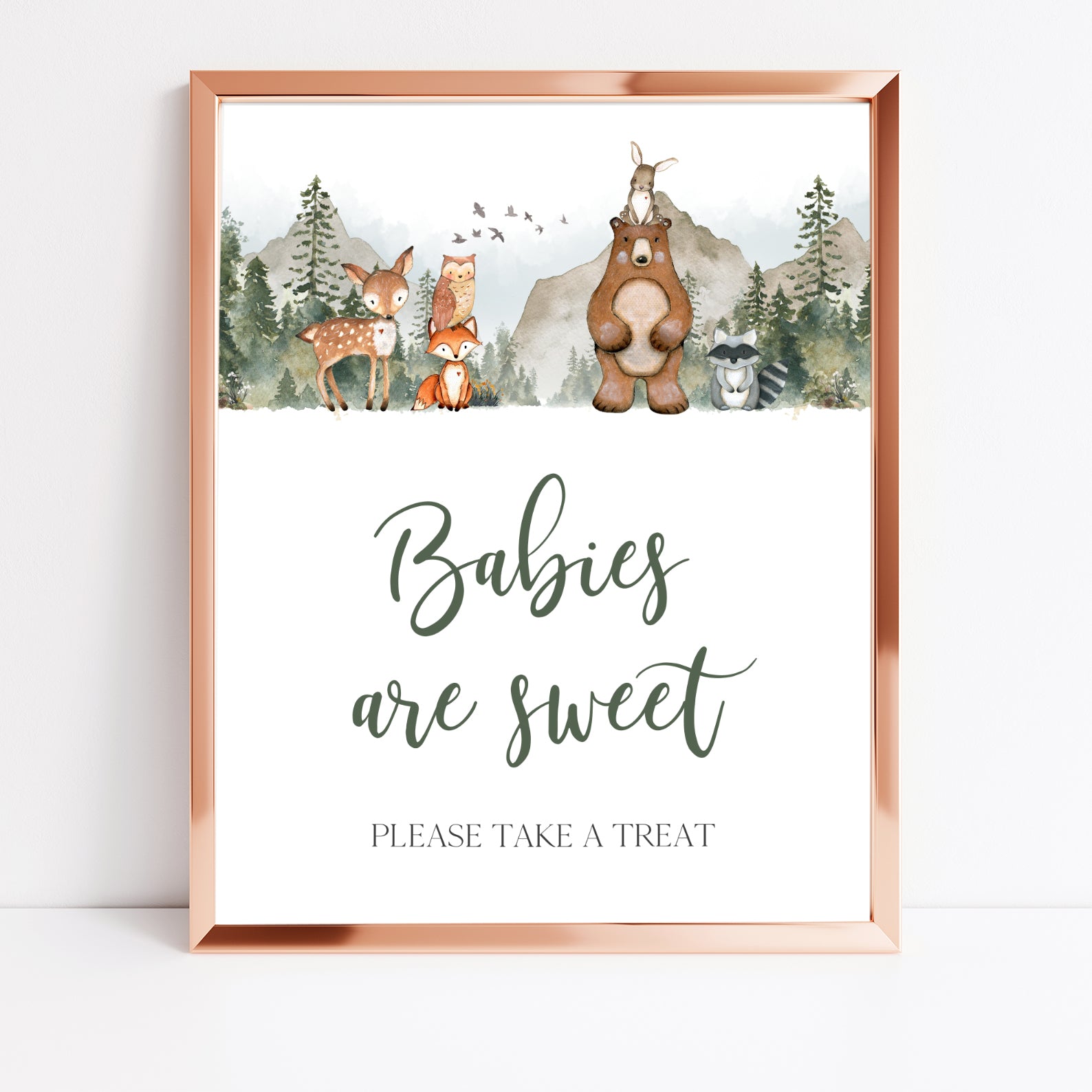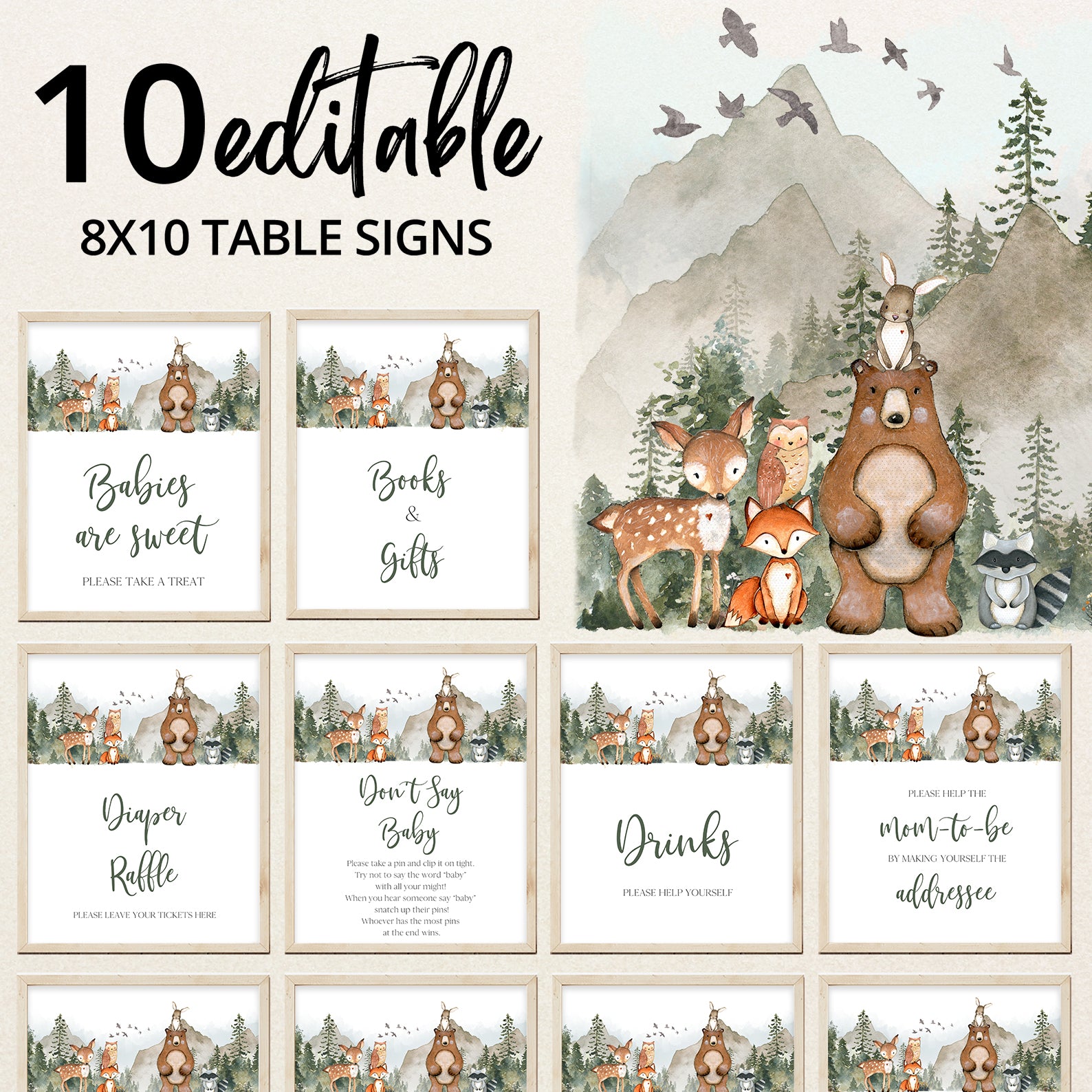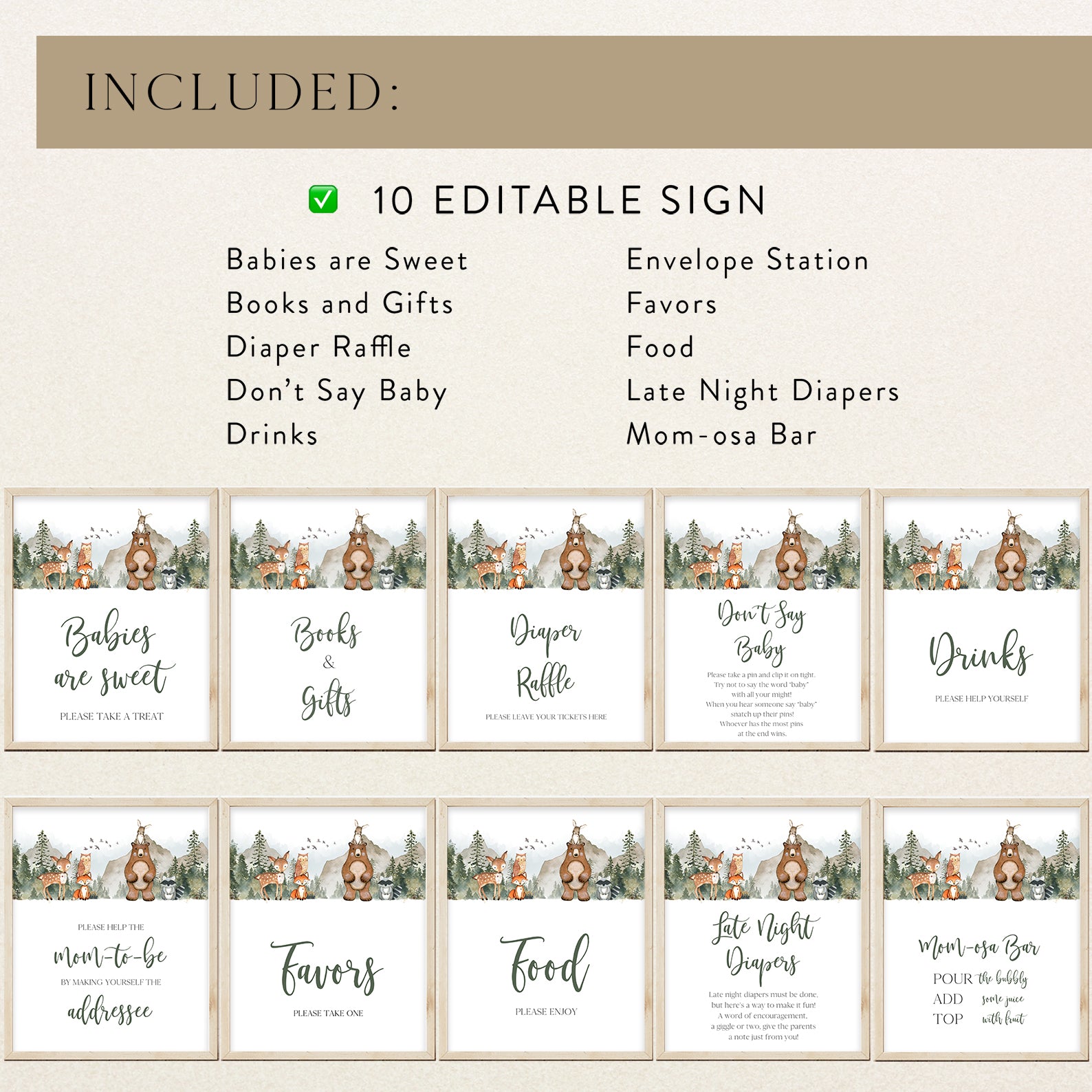 Add a charming touch to your celebration with our editable "Adventure Awaits" woodland table sign bundle! Featuring lush forest greenery and playful woodland animals, this set includes ten themed signs: Babies Are Sweet, Books and Gifts, Diaper Raffle, Don’t Say Baby, Drinks, Envelope Station, Favors, Food, Late Night Diapers, and Mom-osa Bar. Perfectly coordinated with the woodland baby shower theme, these signs bring both style and function to your setup.