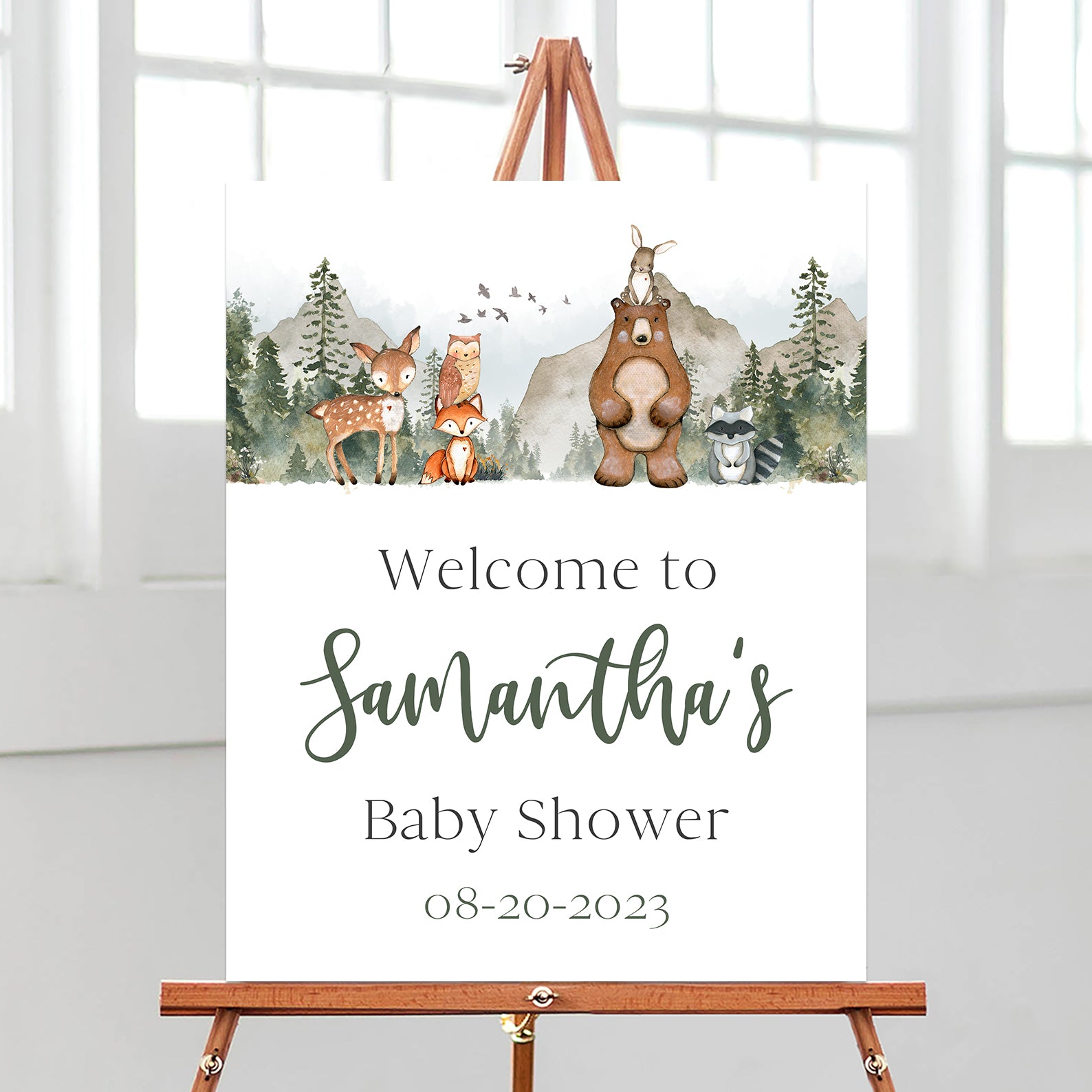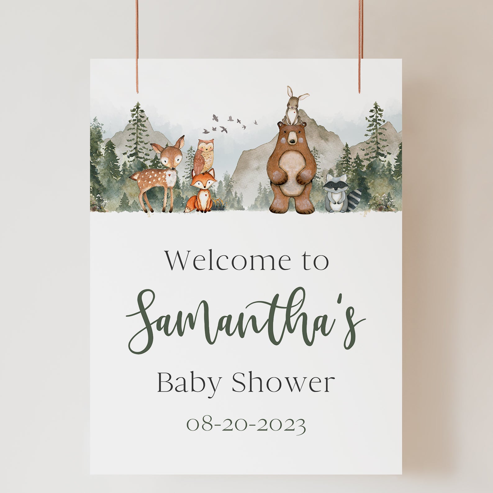 - Purchase this Adventure Awaits Baby Shower Welcome Sign with Woodland Animals template