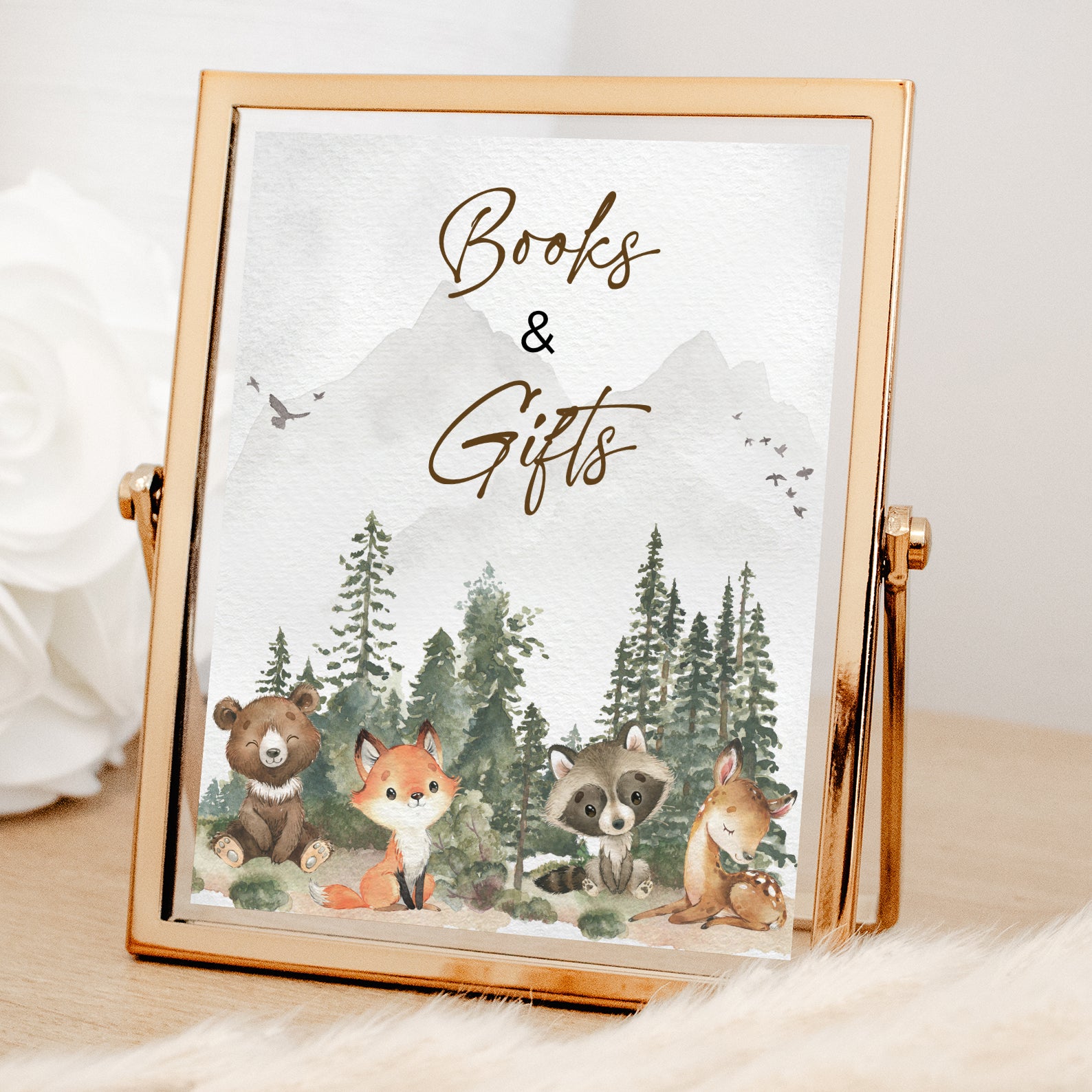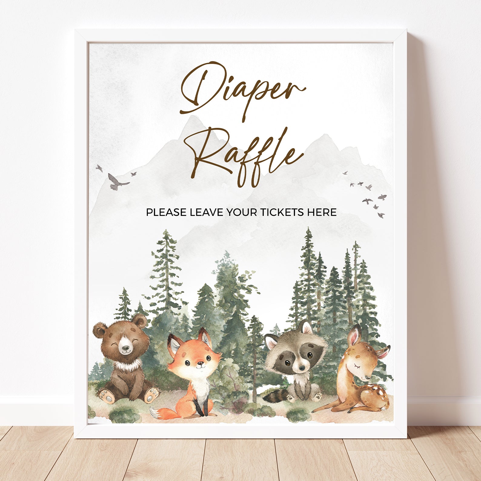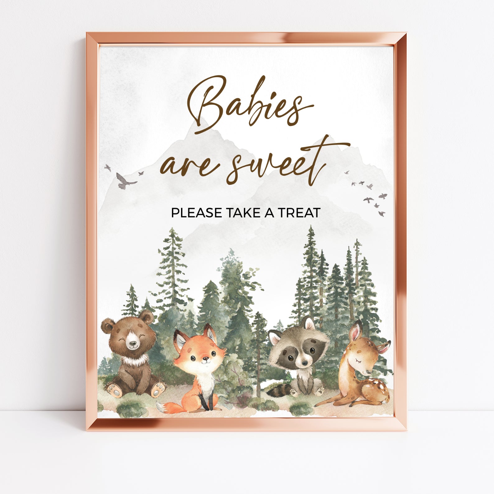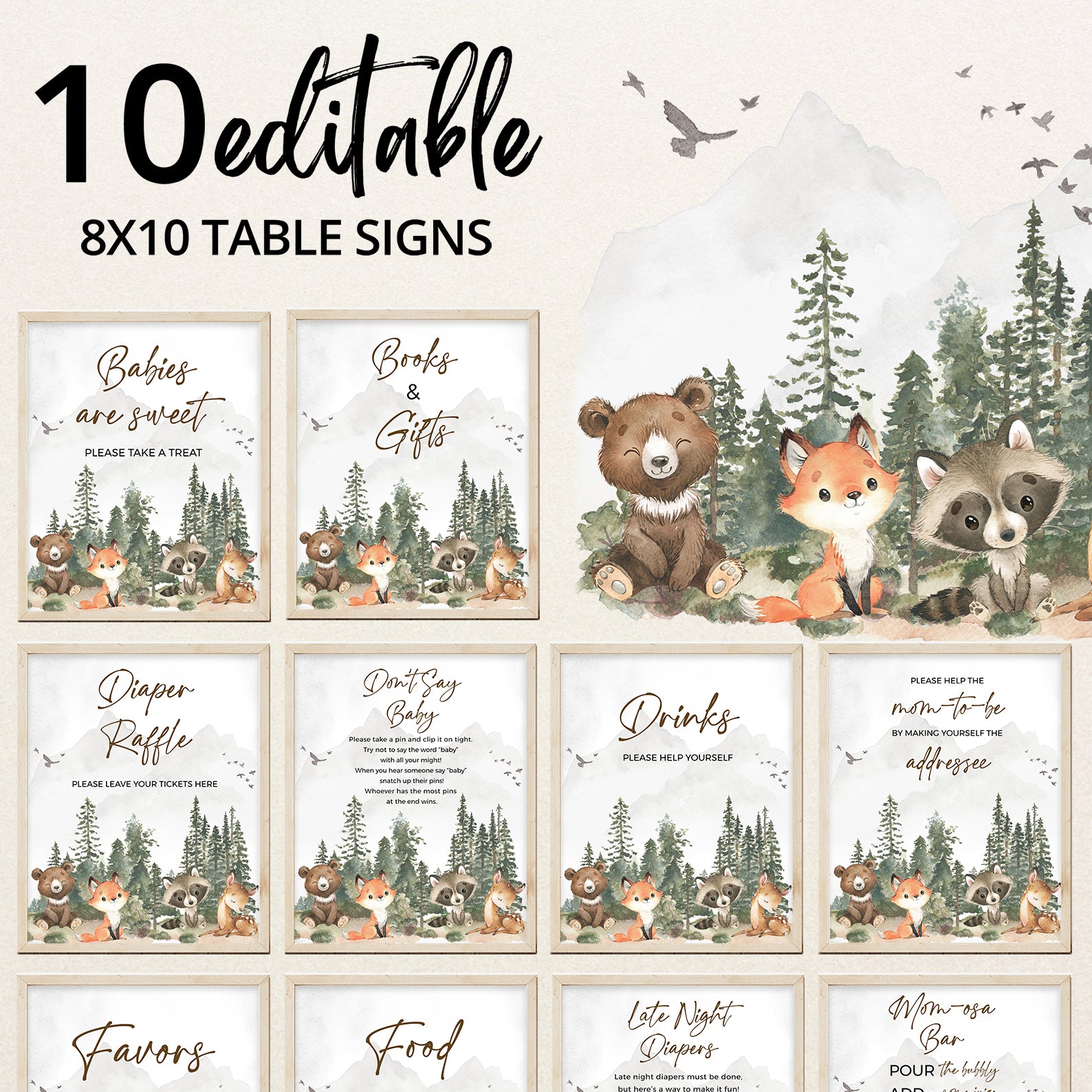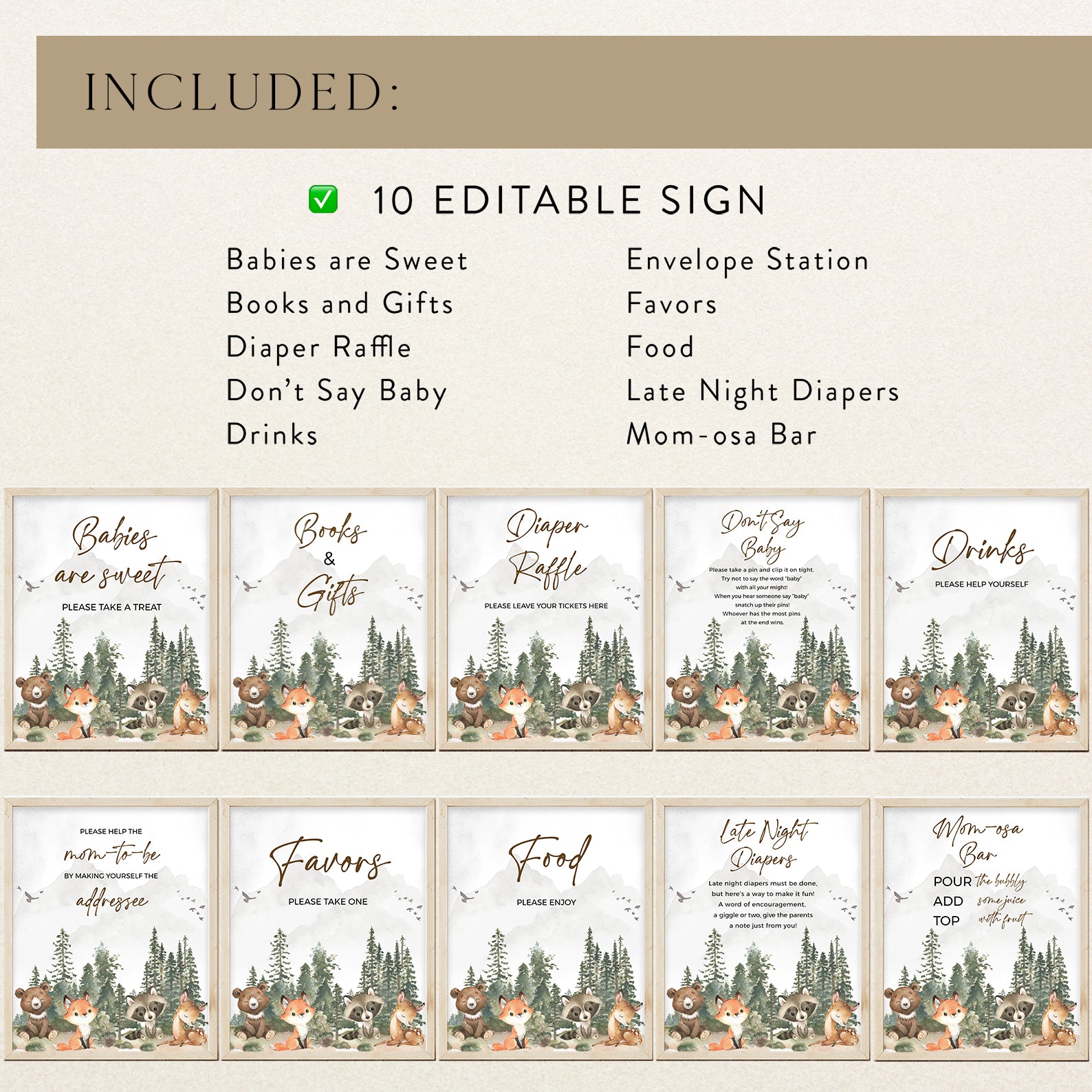 Enhance your baby shower with woodland-themed table signs, each adorned with adorable animals and greenery. This editable set of ten includes: Babies Are Sweet, Books and Gifts, Diaper Raffle, Don’t Say Baby, Drinks, Envelope Station, Favors, Food, Late Night Diapers, and Mom-osa Bar. A charming way to guide guests while adding rustic woodland detail, these signs bring organization and a cohesive look to your adventure-filled celebration.