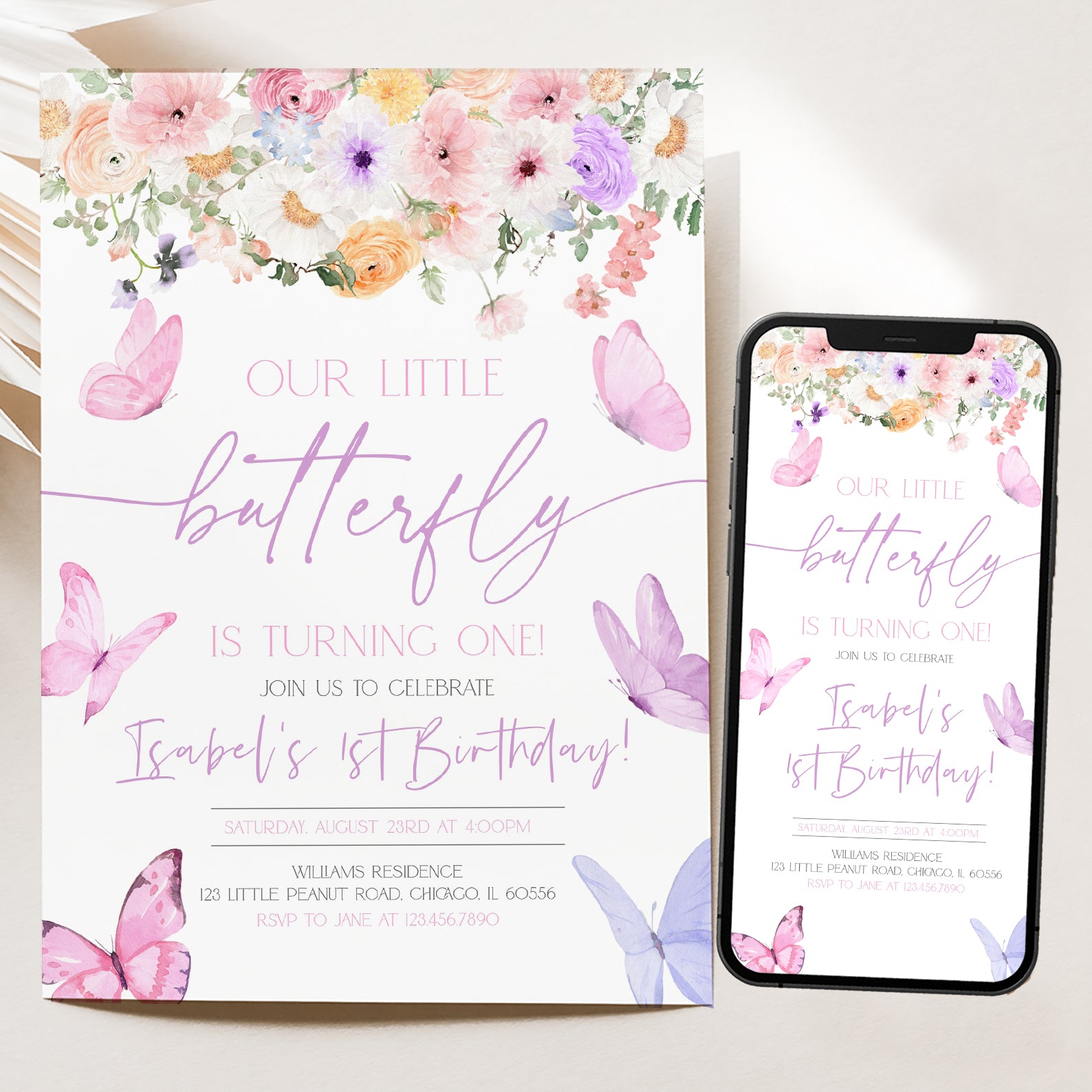 Celebrate your little one's special day with our enchanting Spring Birthday Digital Invitation! Adorned with a charming floral top border and delightful pink and purple butterflies fluttering on both sides, this invitation captures the essence of springtime joy. Perfect for inviting friends and family to a whimsical birthday party, it’s easy to customize and send, ensuring your celebration is as vibrant and magical as the season itself. Make your child's birthday unforgettable with this beautiful digital invite!