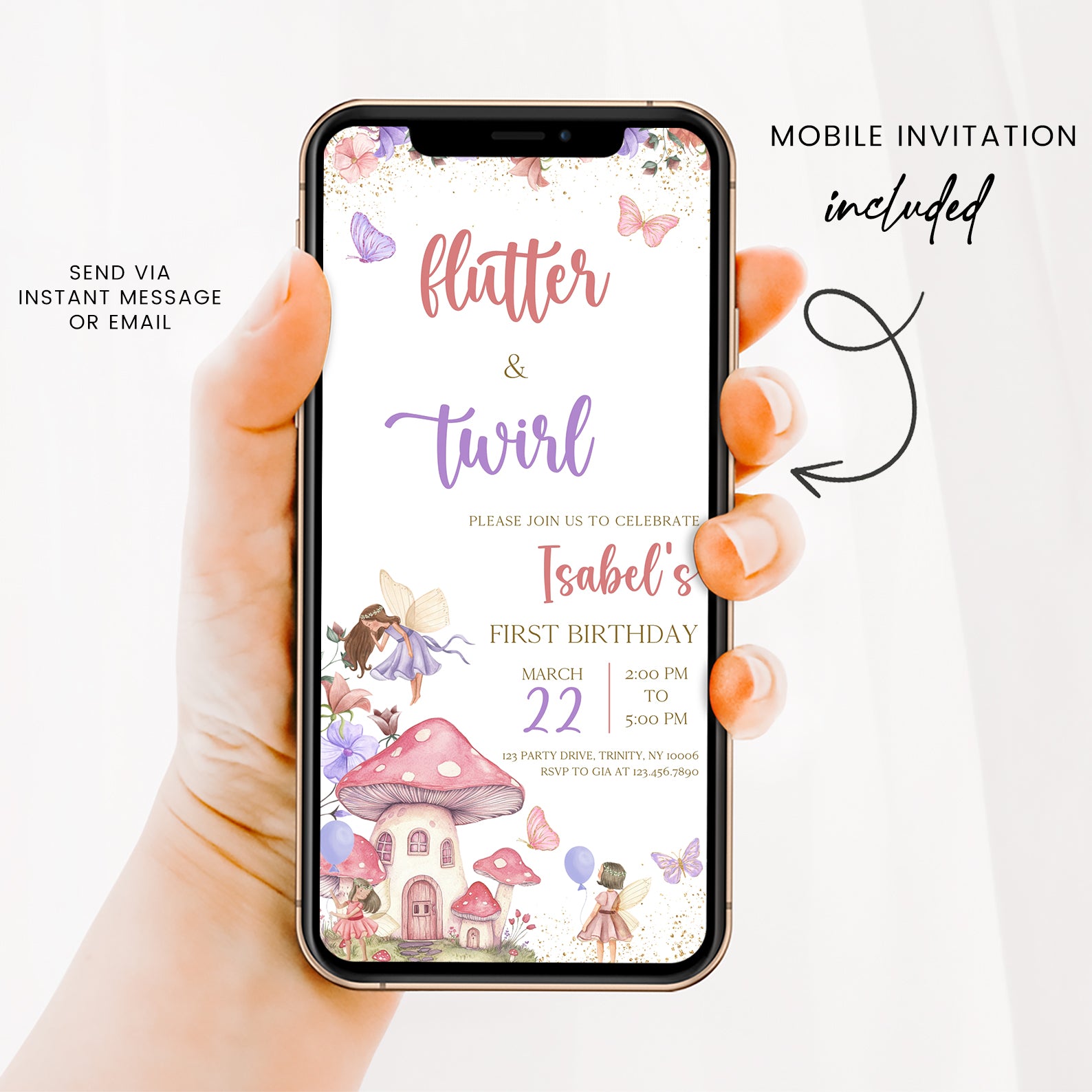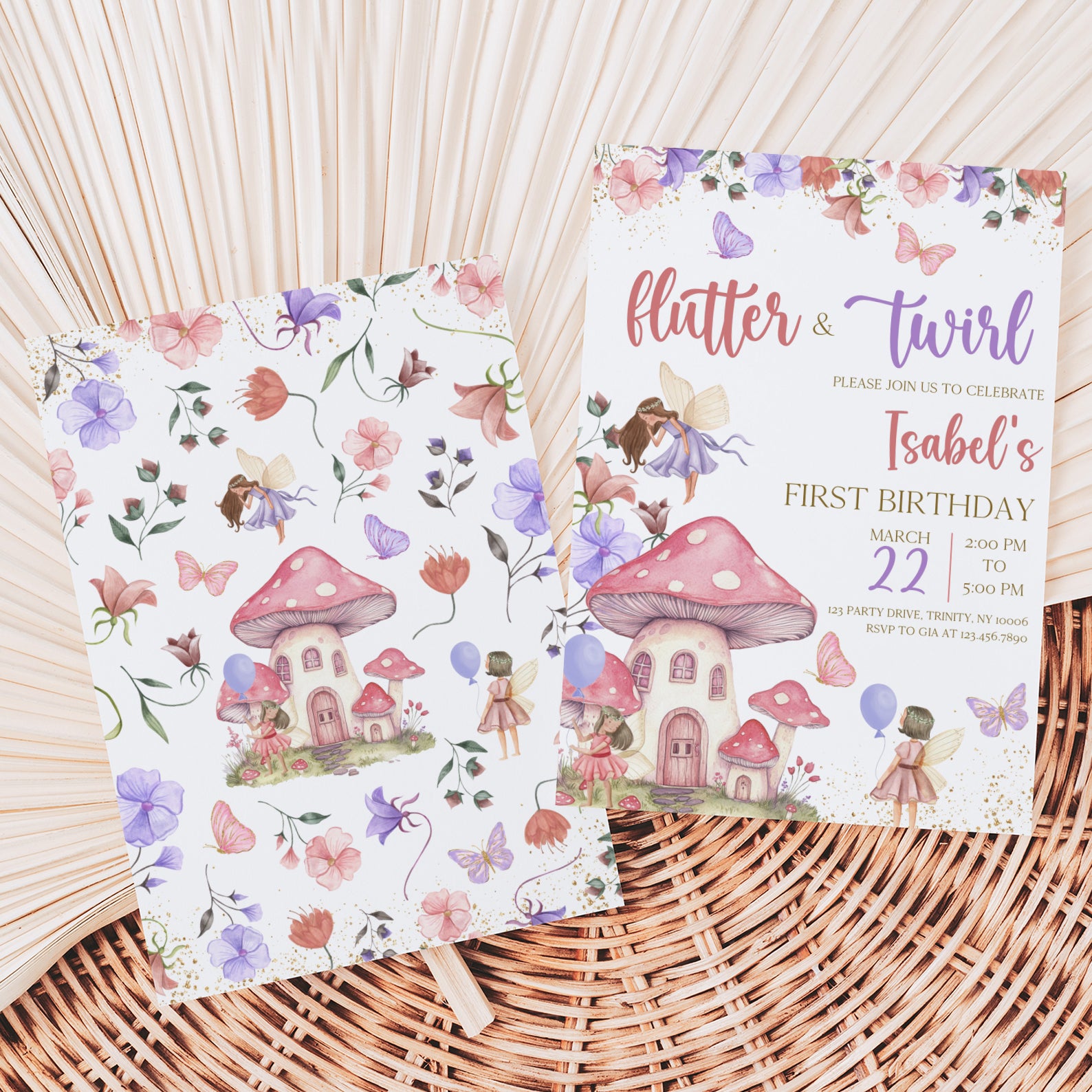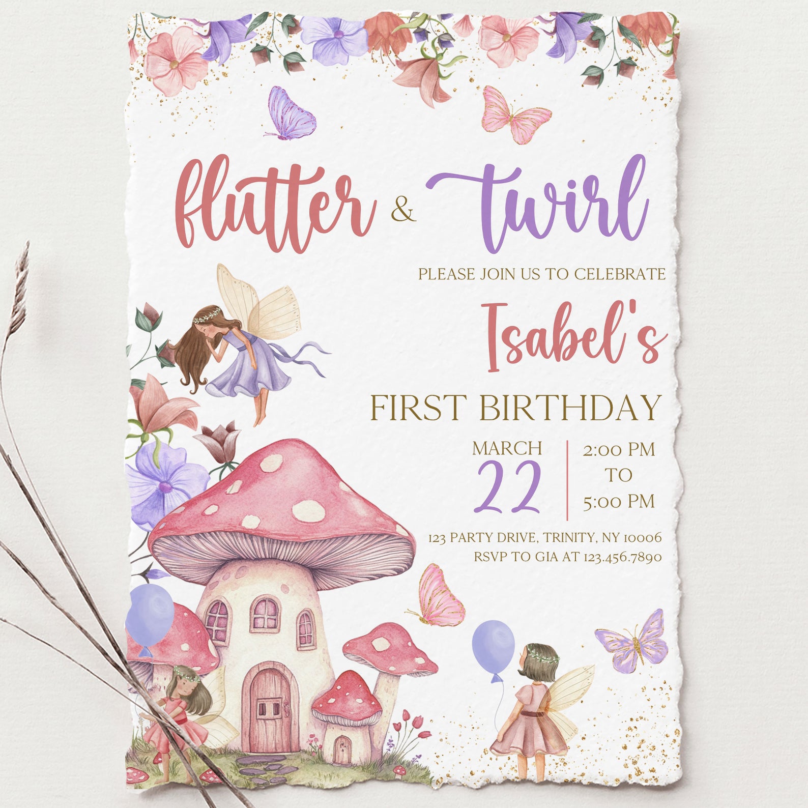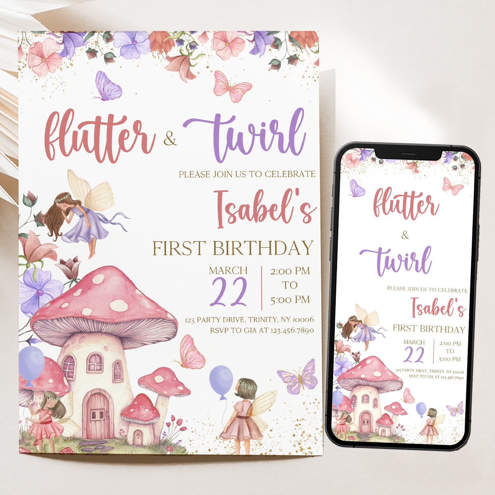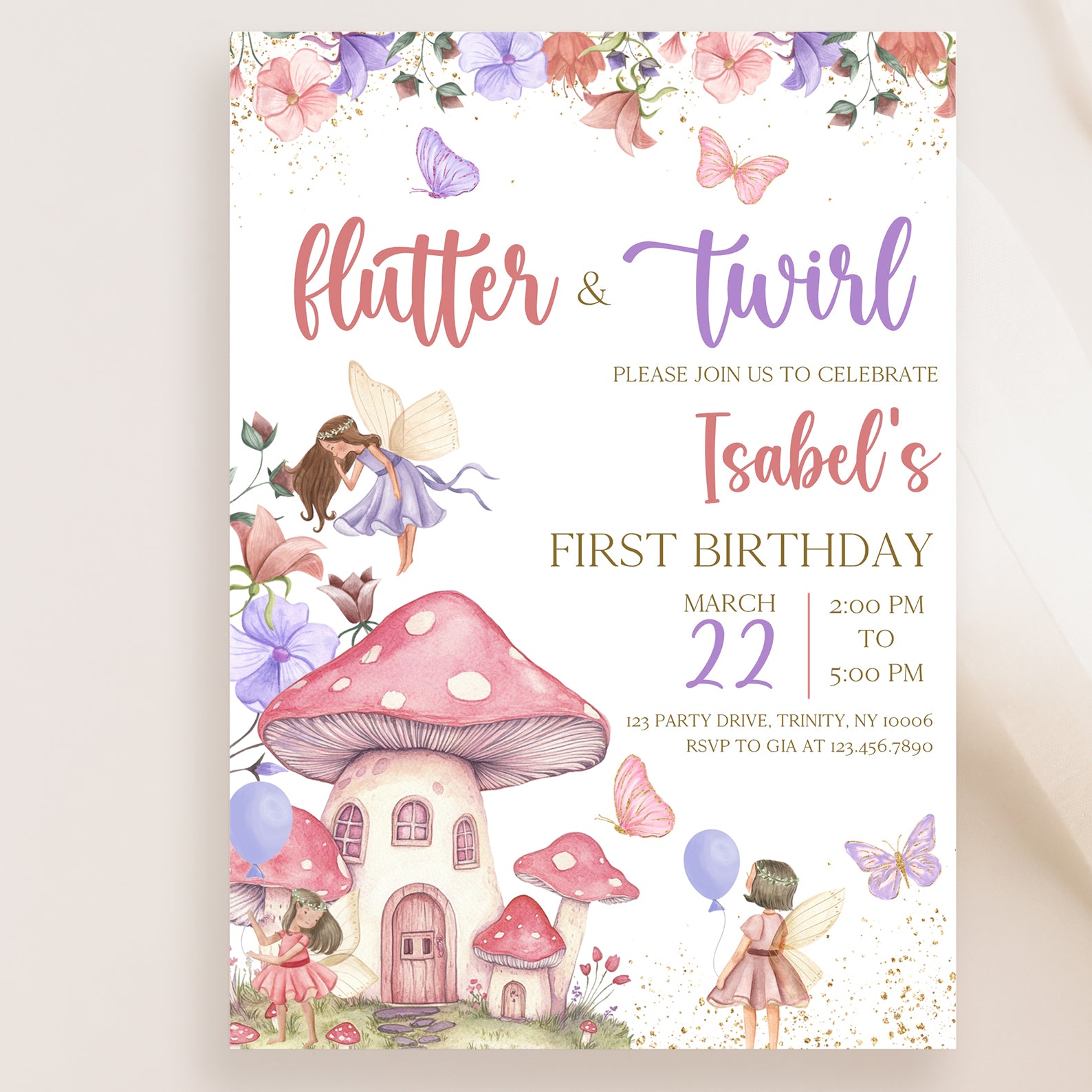 Celebrate your little one's special day with this enchanting digital birthday invitation! Designed in a charming pink and purple theme, it features whimsical florals, shimmering gold accents, and fluttering butterflies. At the bottom, playful fairies surround a magical mushroom house, each holding a purple balloon, creating a dreamy atmosphere for a celebration full of joy and wonder.