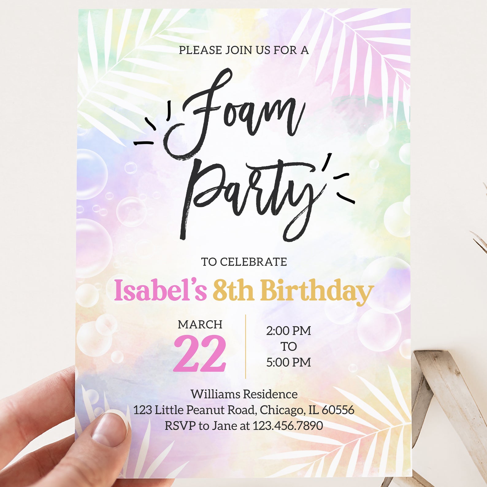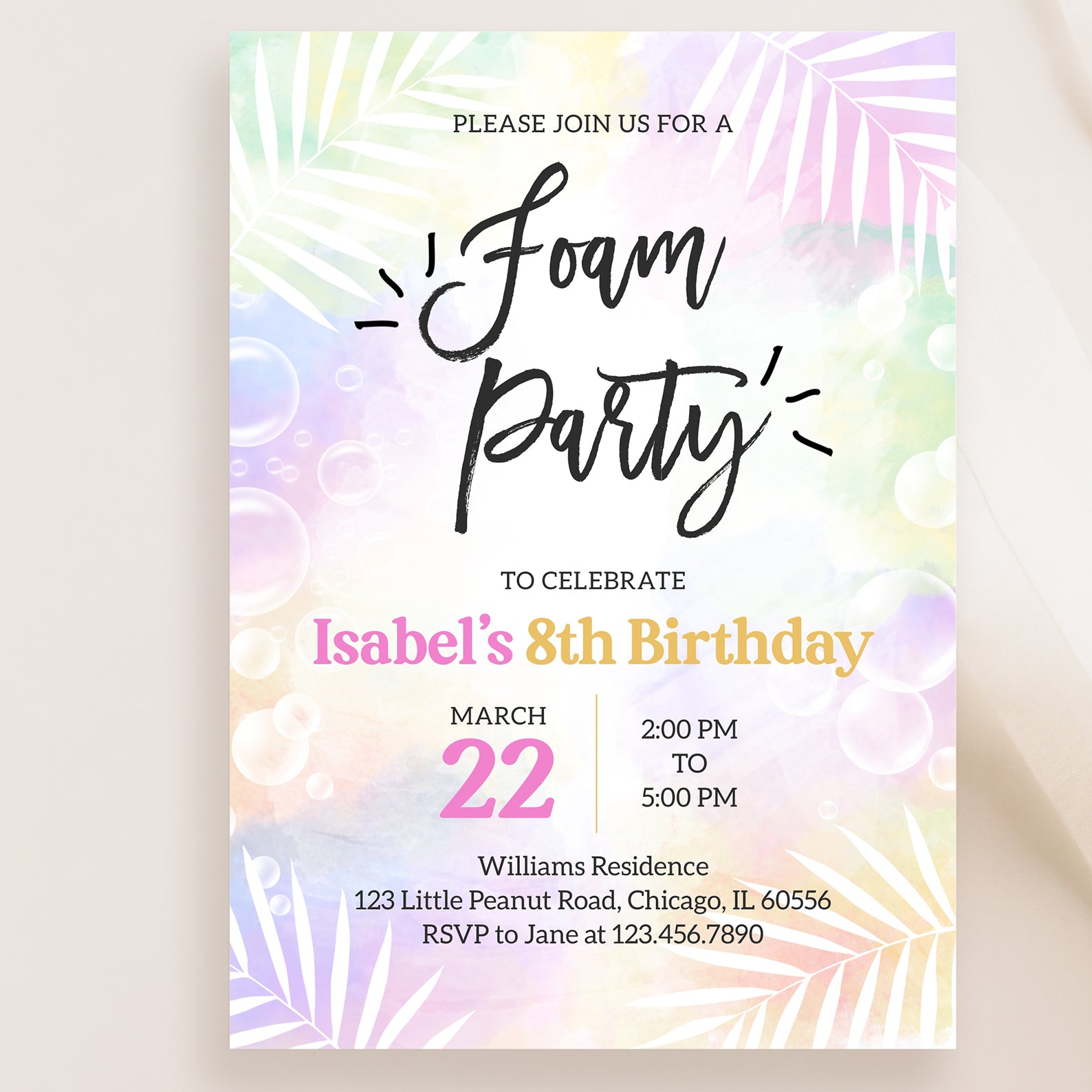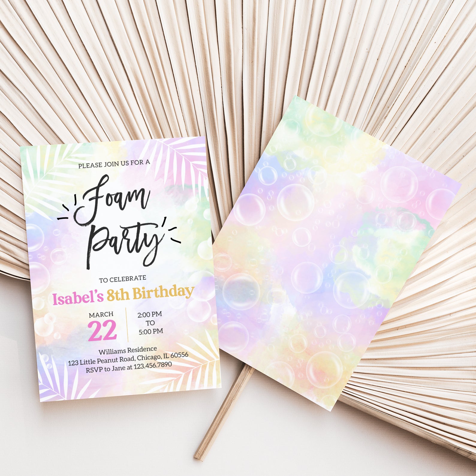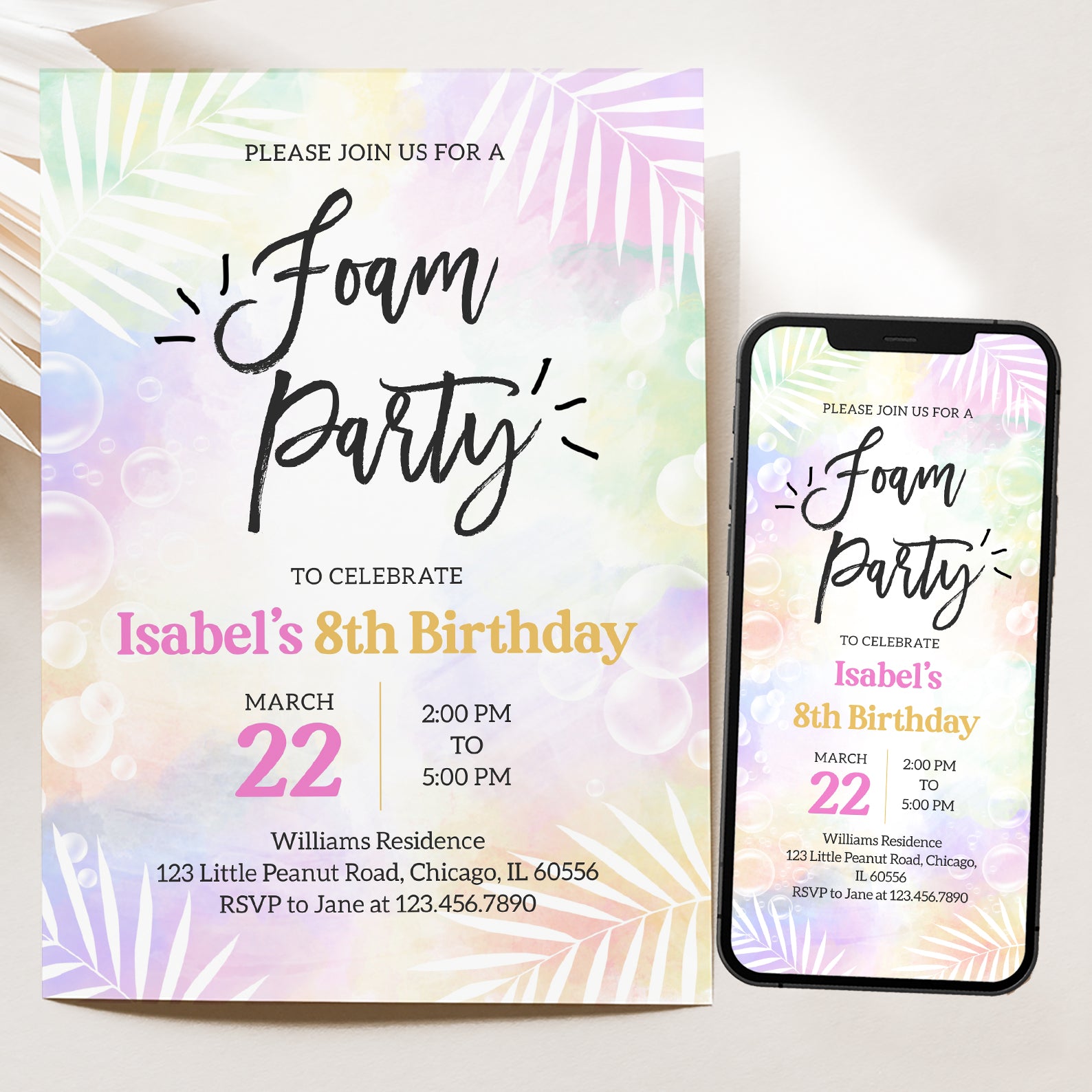 Celebrate spring in style with our vibrant digital invitation for a foam party birthday bash! Featuring a soft, colorful background adorned with playful bubbles and elegant white palm leaves, this invitation sets the perfect tone for a fun-filled celebration. Easy to customize and share, it’s the ideal way to invite friends and family to join in the bubbly festivities!