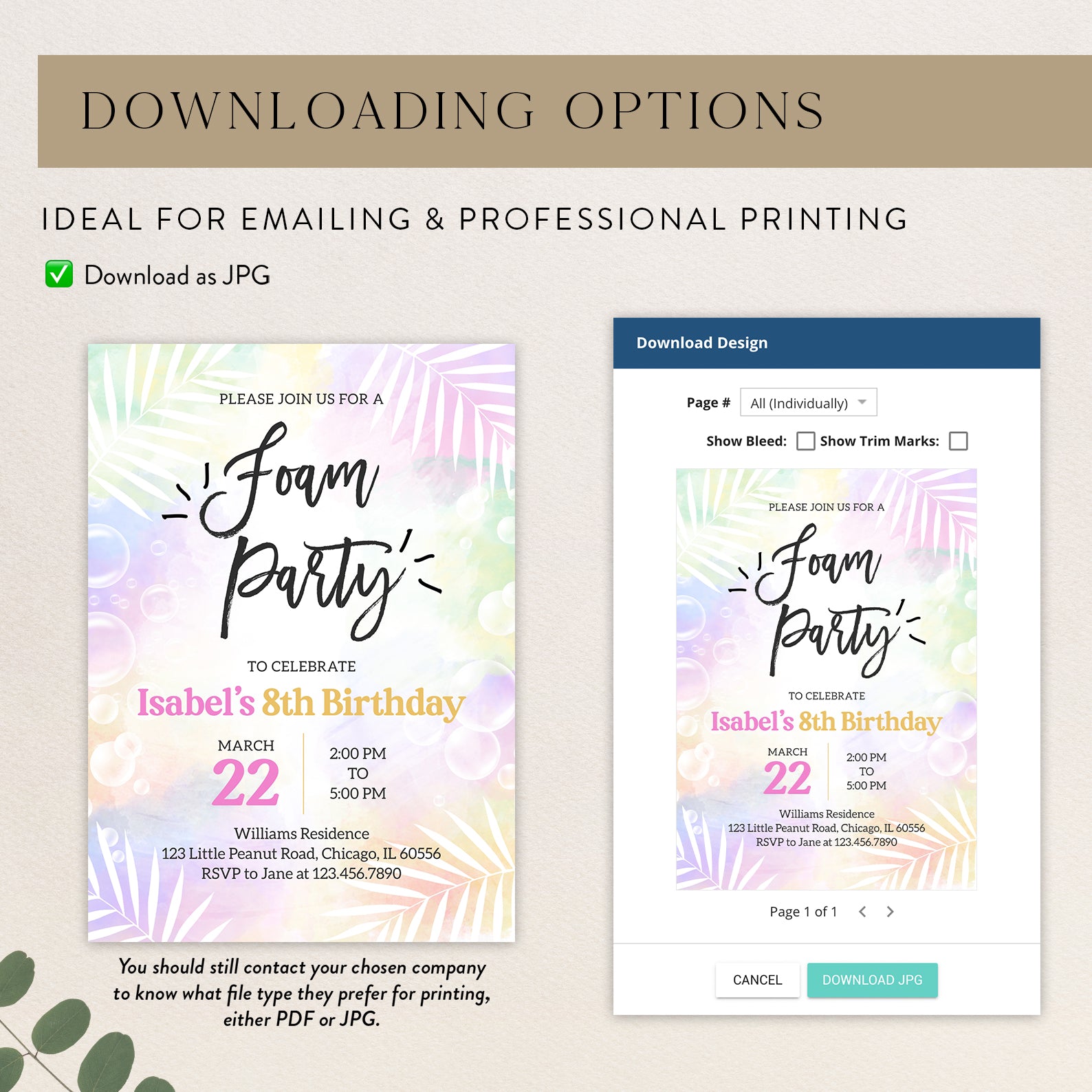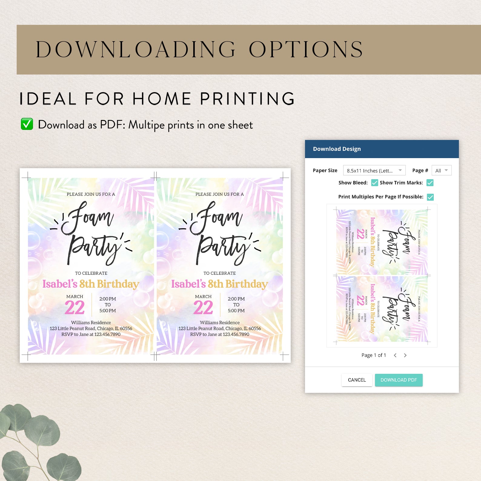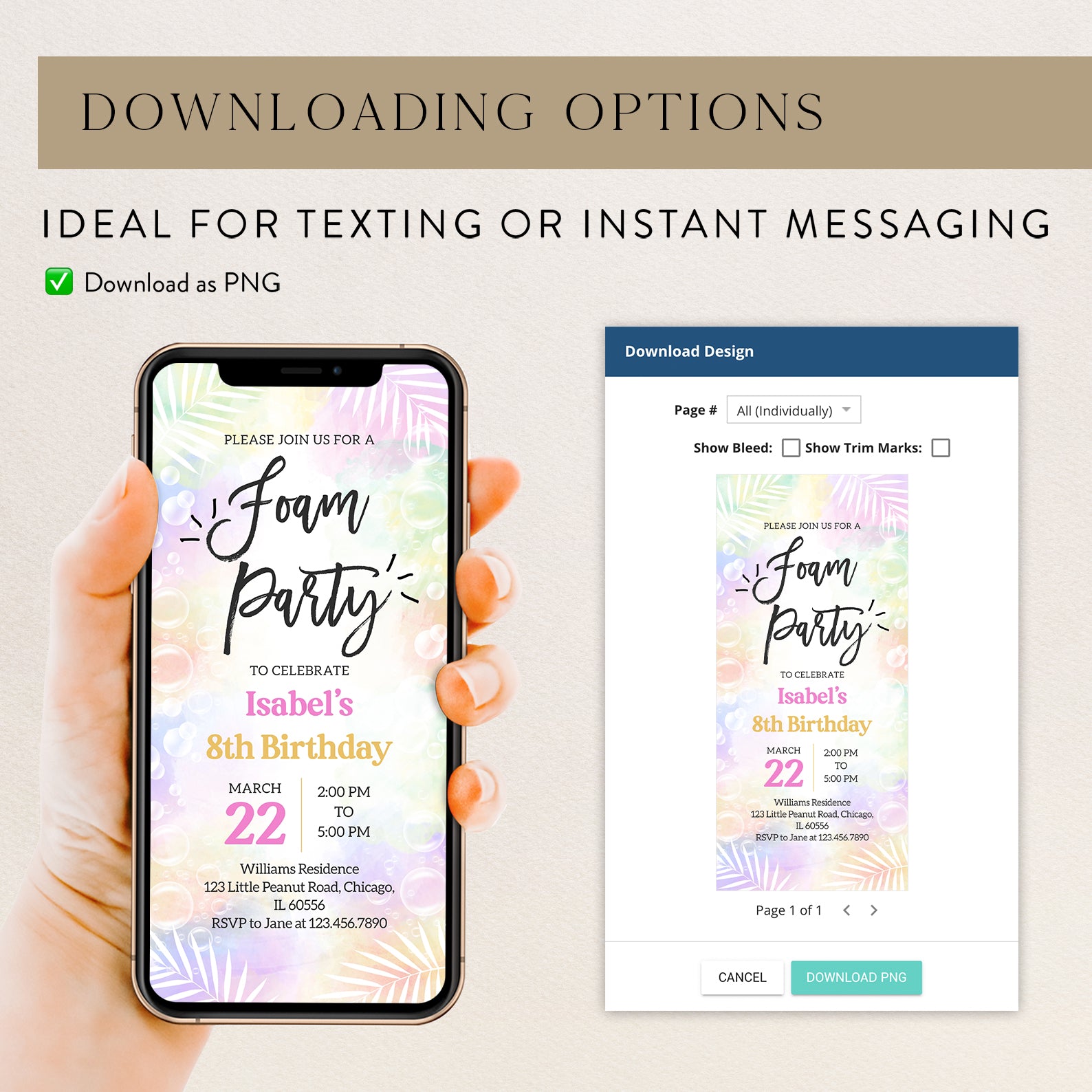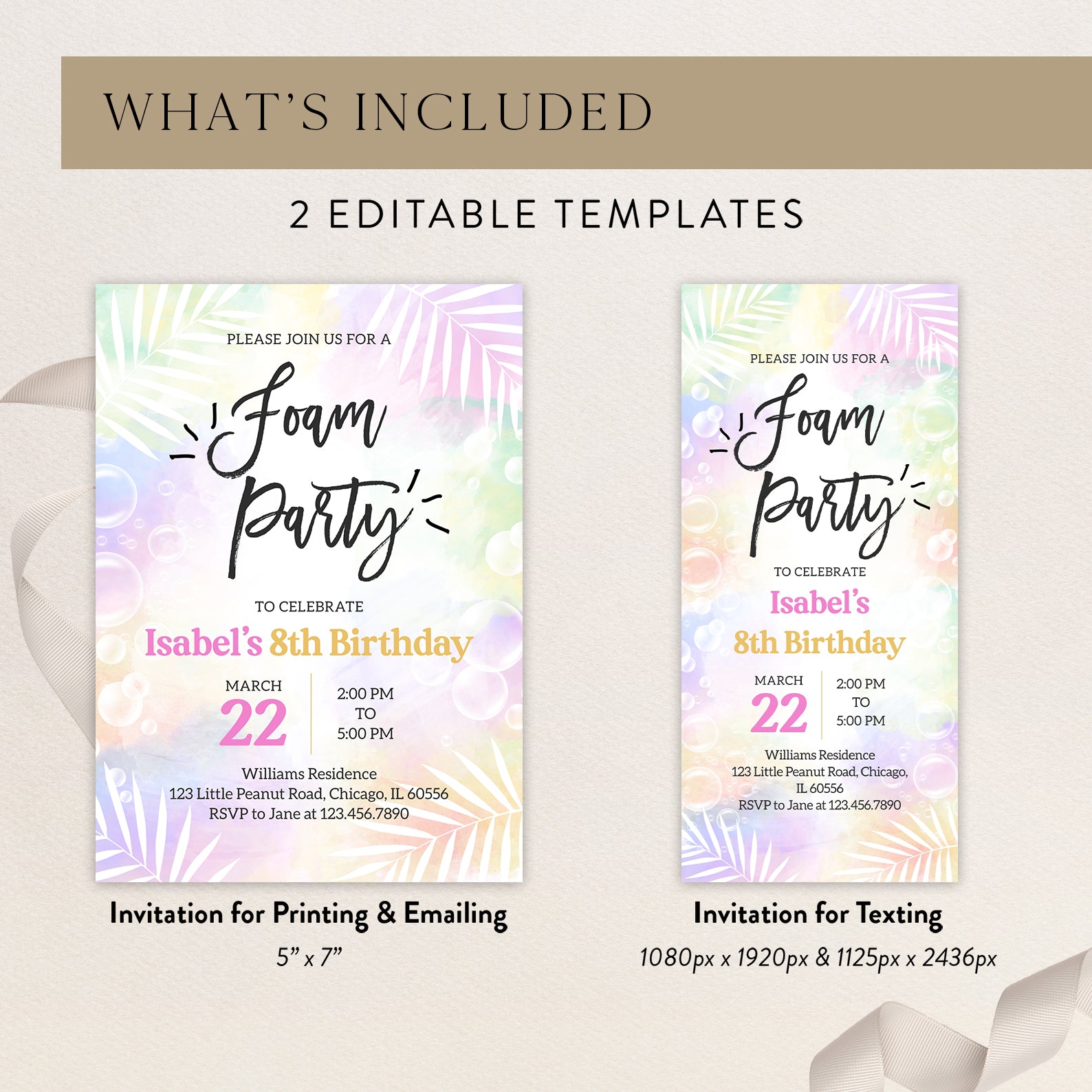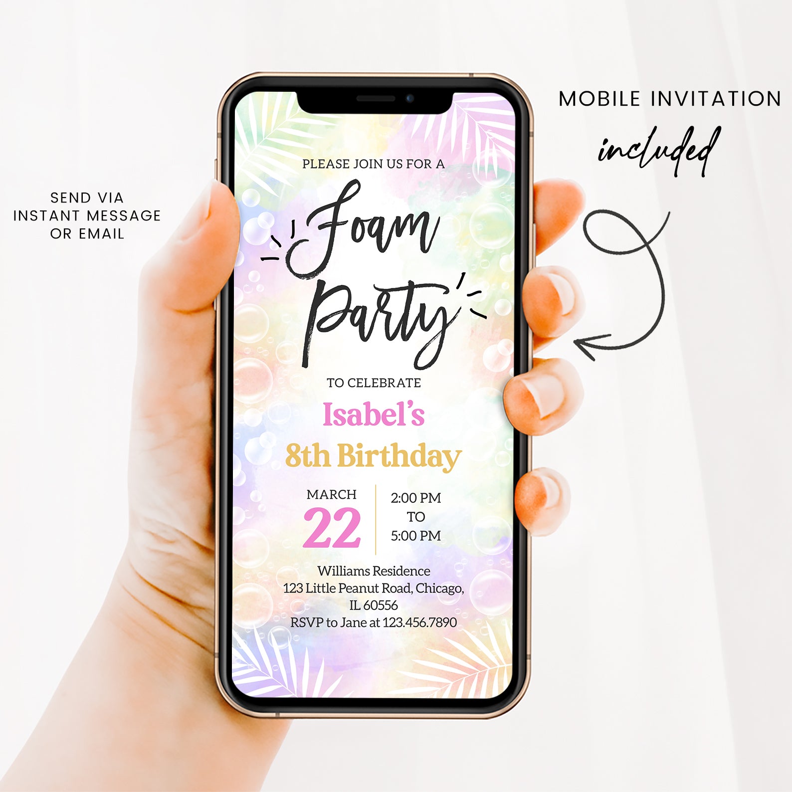 Celebrate spring in style with our vibrant digital invitation for a foam party birthday bash! Featuring a soft, colorful background adorned with playful bubbles and elegant white palm leaves, this invitation sets the perfect tone for a fun-filled celebration. Easy to customize and share, it’s the ideal way to invite friends and family to join in the bubbly festivities!