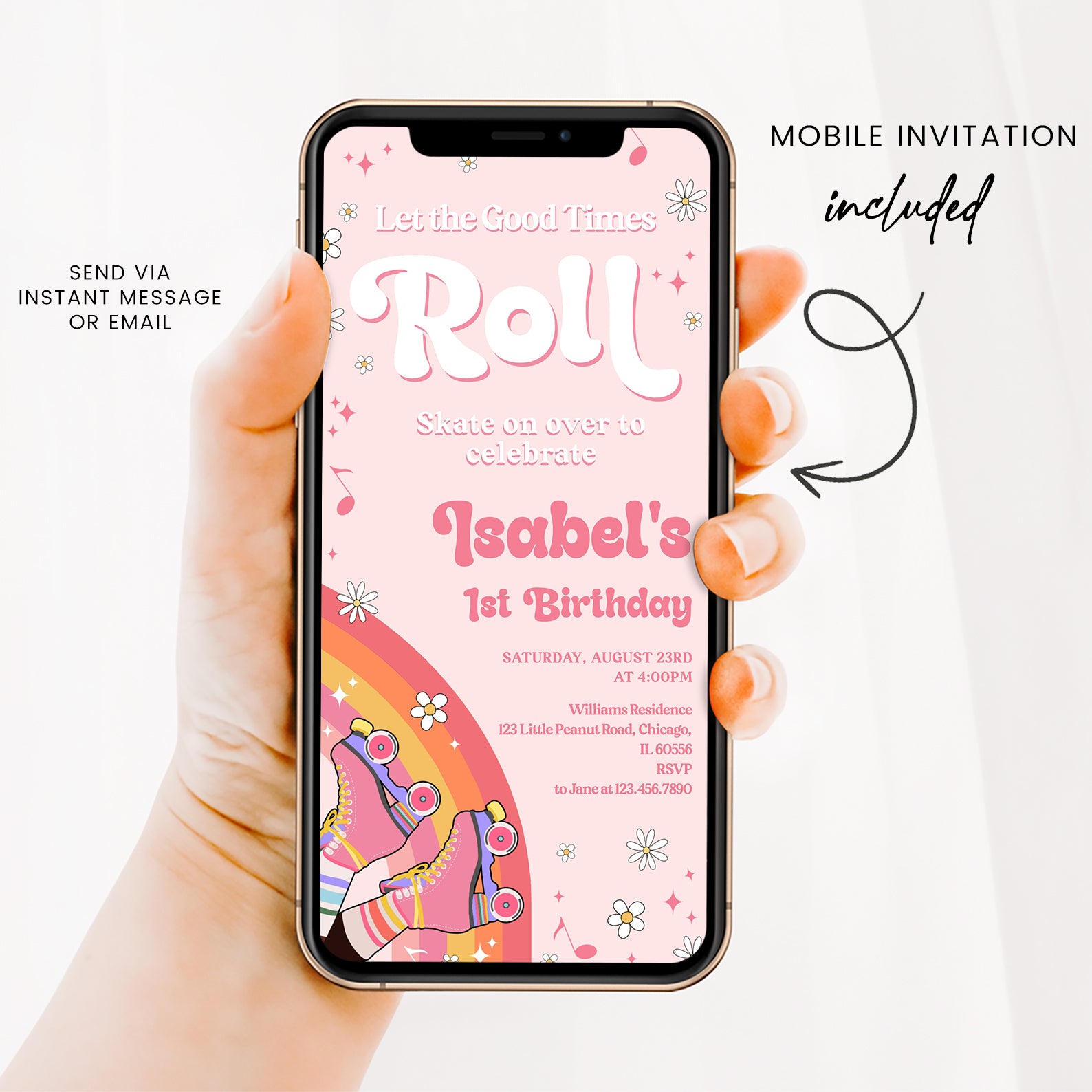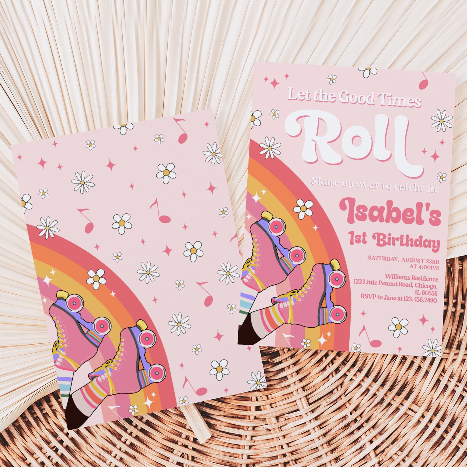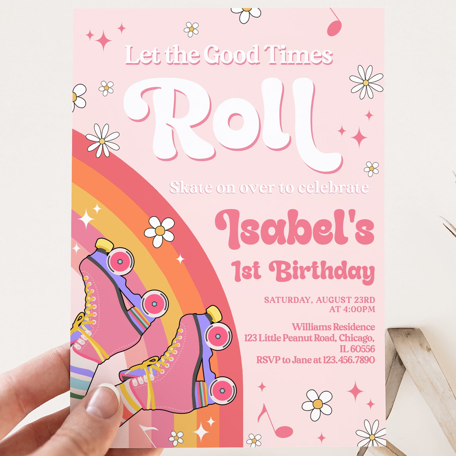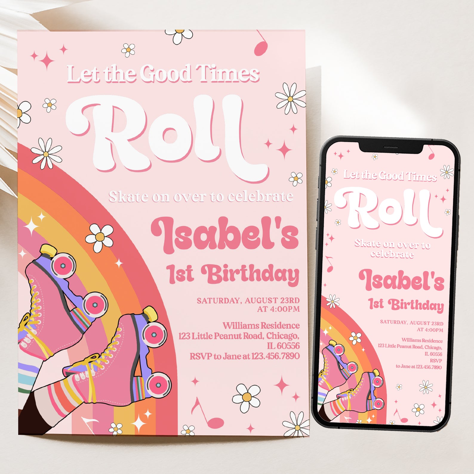 Get ready to roll into a fabulous birthday celebration with our vibrant Spring Birthday Digital Invitation! Featuring a playful design of colorful roller skates set against a soft pink background, this invitation bursts with joy through its rainbow hues of red, orange, yellow, and pink. Adorned with cheerful white daisies, whimsical musical notes, and sparkling pink diamond stars, it perfectly captures the spirit of fun and festivity. Make your special day unforgettable by inviting friends and family with this eye-catching digital invite that sets the tone for a lively celebration!