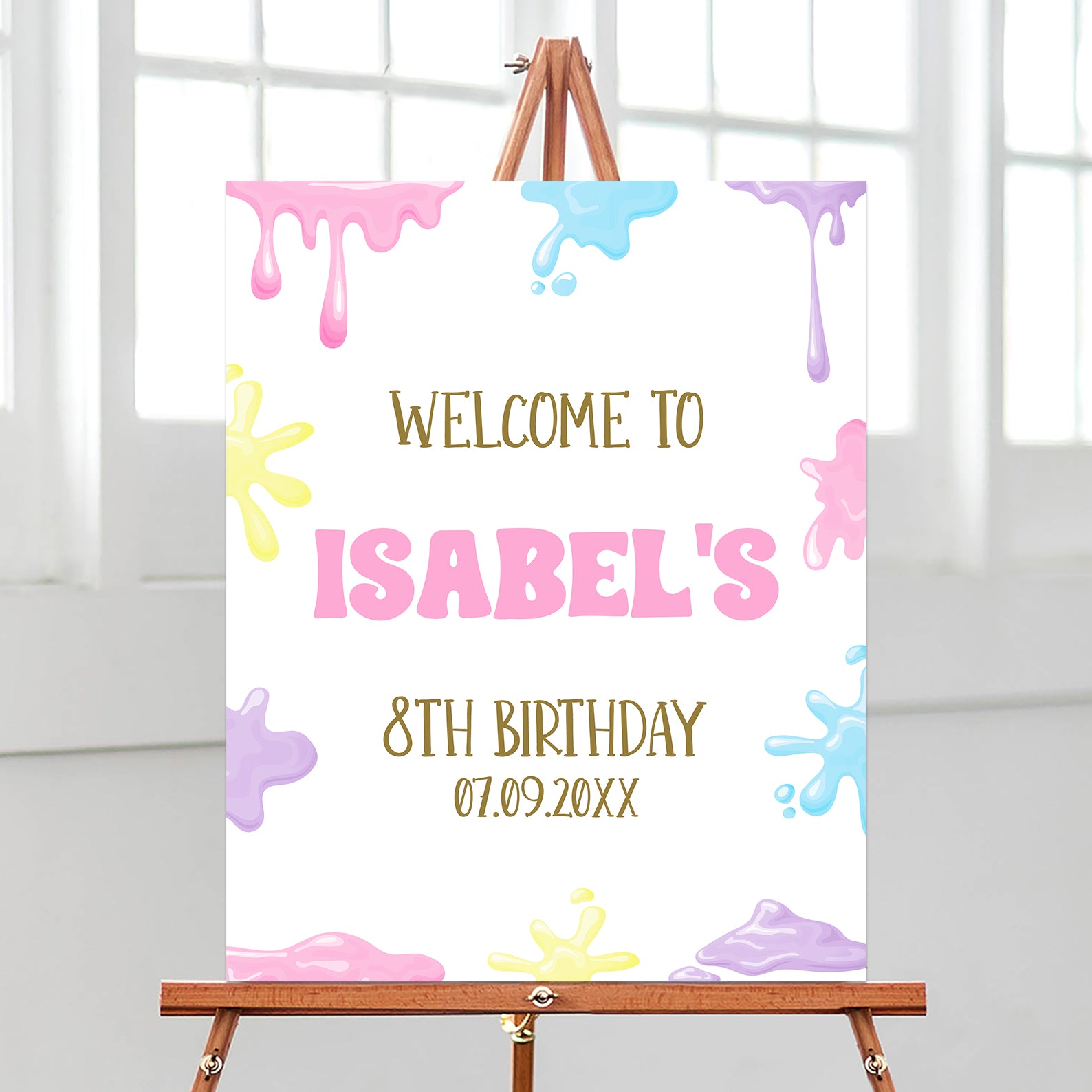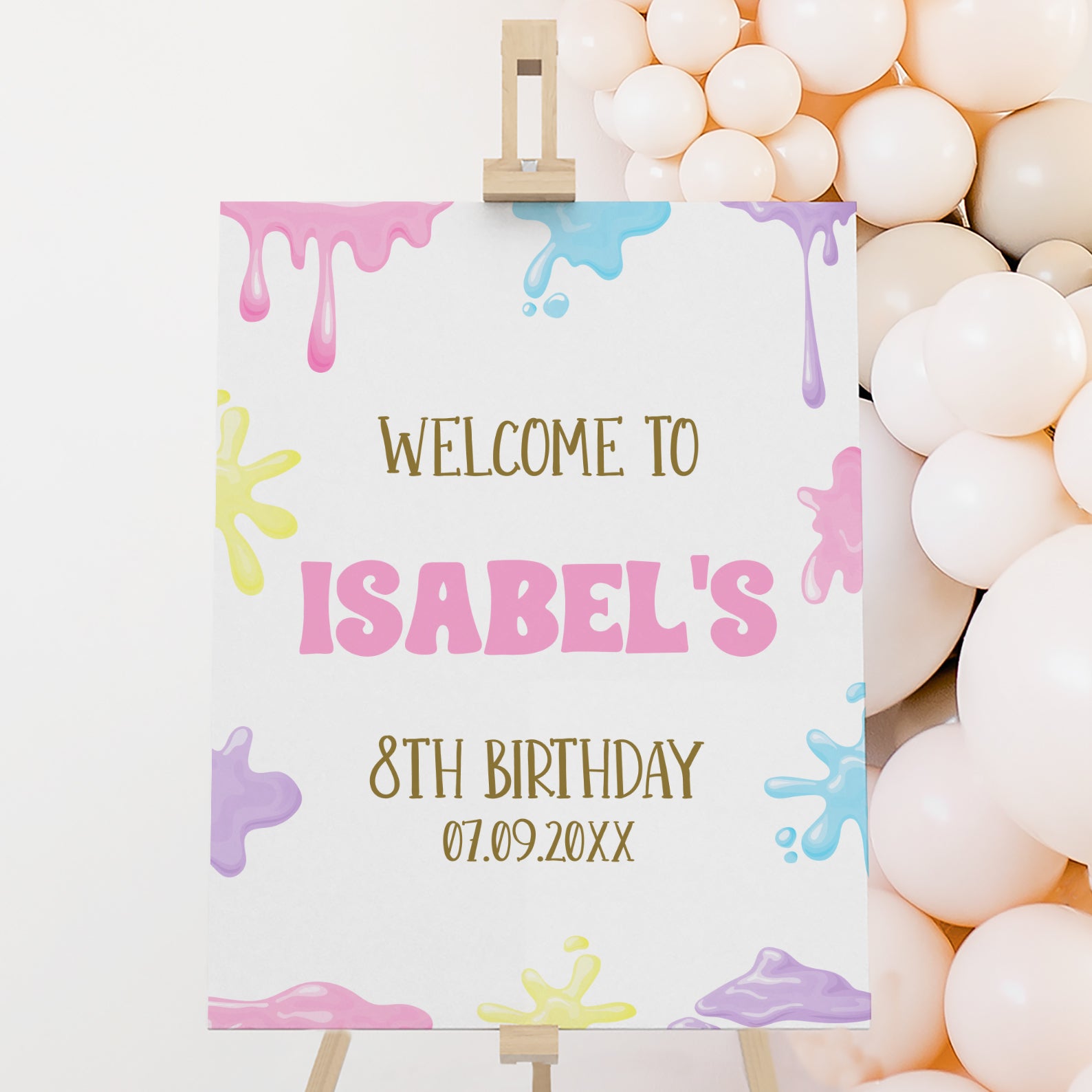 Kick off your child’s slime-filled 8th birthday bash with this playful digital welcome sign! Featuring bright, colorful slimes dripping across the design, this fun sign instantly sets the mood for a messy and magical celebration. With a bold, cheerful layout and splashes of vibrant color, it’s the perfect way to greet guests and guide them into a day of squishy creativity. Display it at the party entrance, near the activity table, or by the dessert station to bring the theme to life. Easy to download and print, this editable sign adds a gooey touch of fun to your child’s special day!