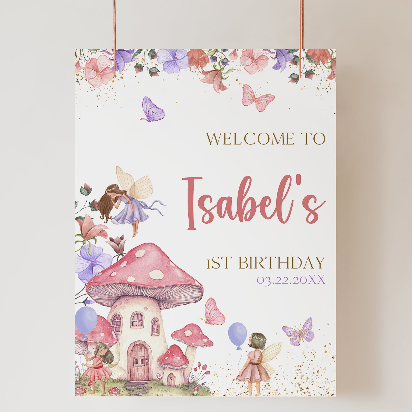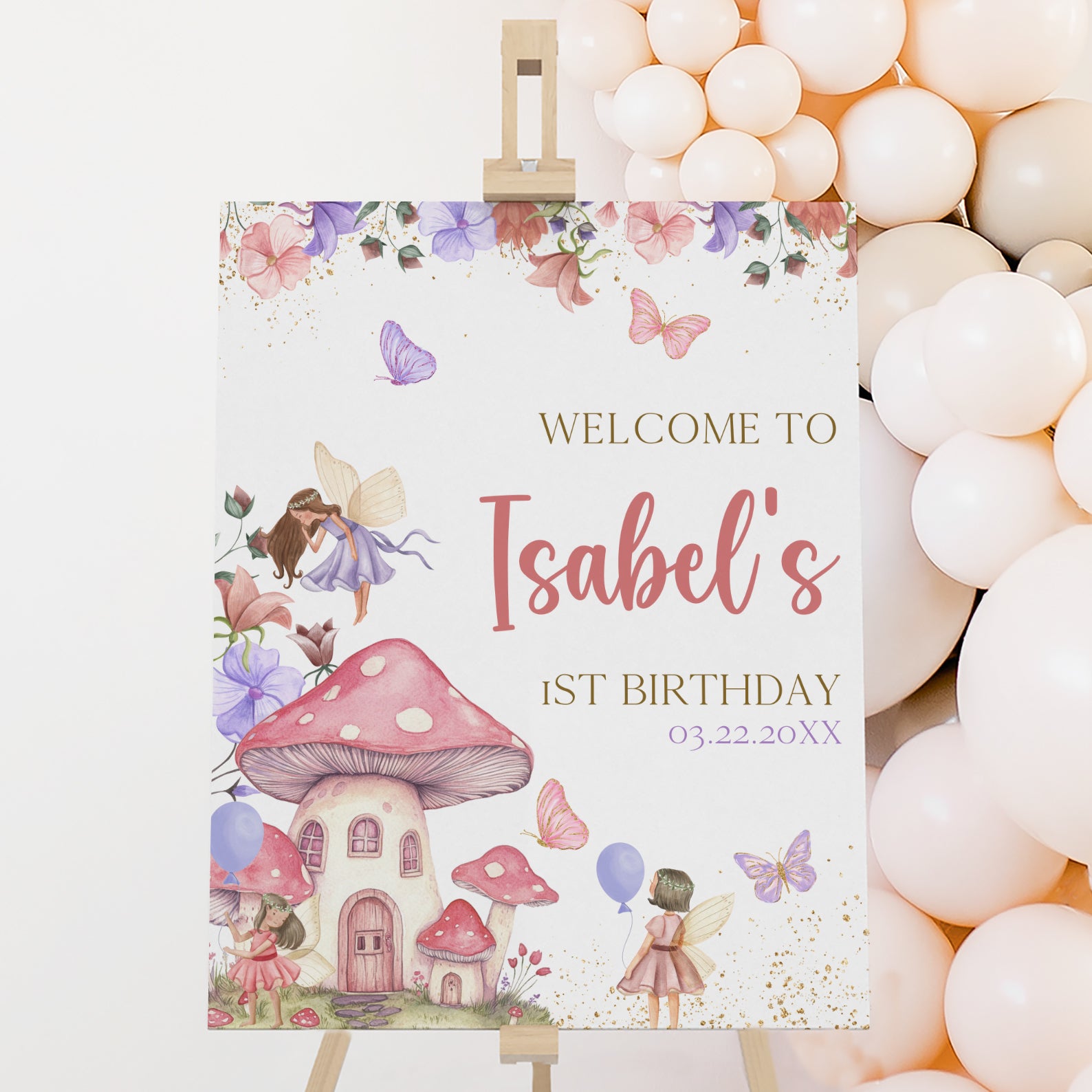 Welcome guests to a magical celebration with this enchanting spring birthday welcome sign! Designed in a charming pink and purple theme, it features delicate florals, shimmering gold accents, and fluttering butterflies. At the bottom, playful fairies gather around a whimsical mushroom house, each holding a purple balloon, setting a dreamy scene for a celebration filled with joy and wonder. Perfect for adding a touch of fairy-tale magic to your little one's special day!