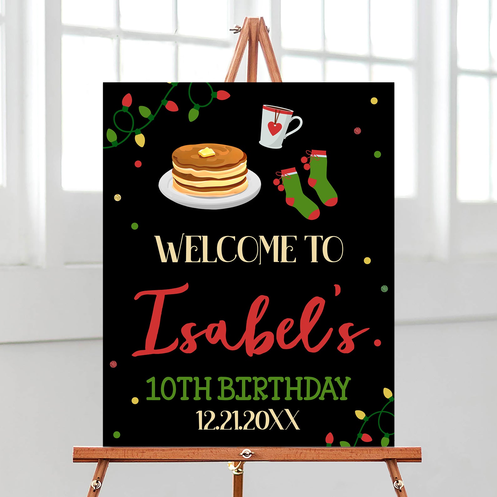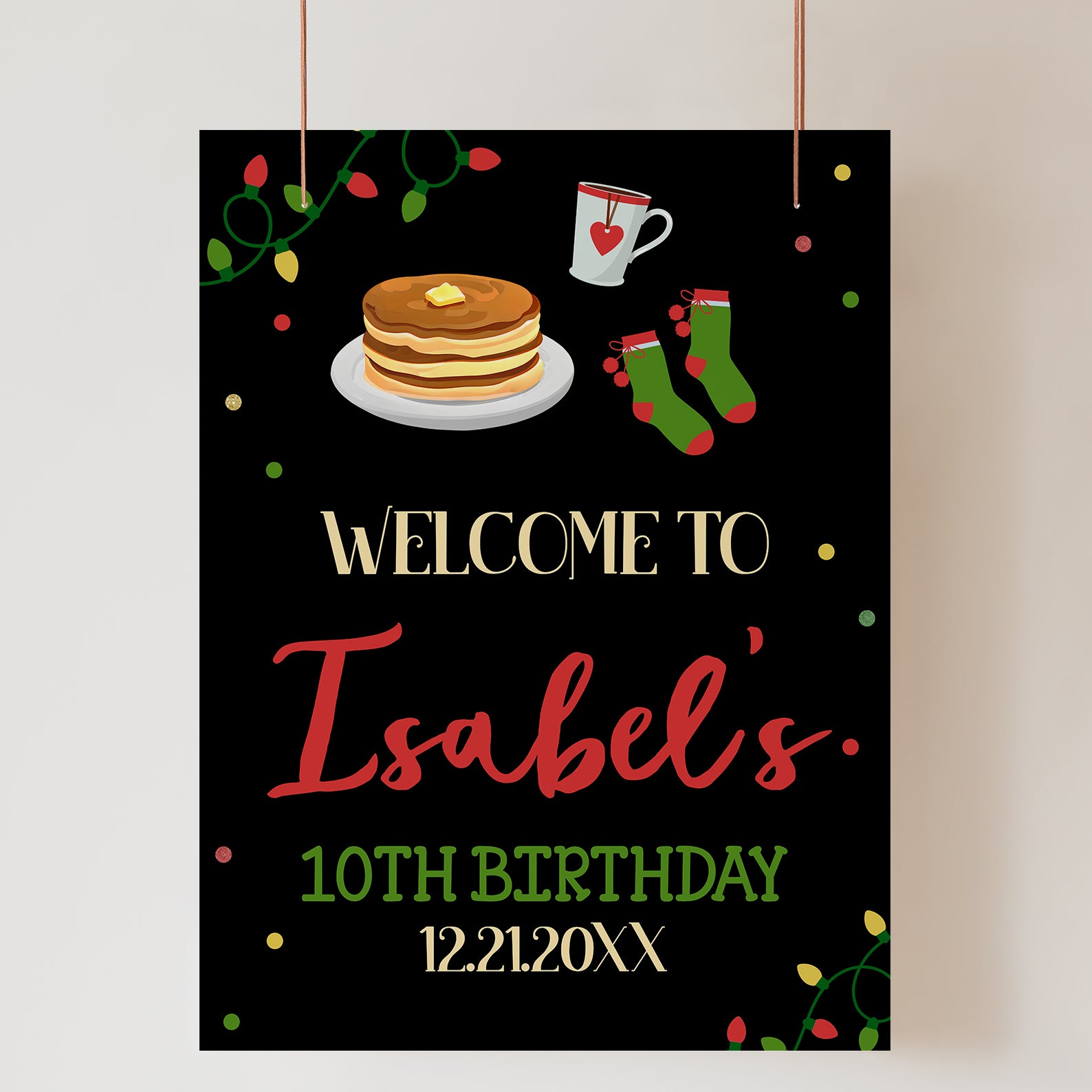 Start your cozy celebration with our Winter Birthday Welcome Sign, perfect for your child’s 10th birthday! Set against a sleek black background, this charming design features fluffy stacks of pancakes, a warm mug of hot chocolate, and festive green and red socks, all glowing under twinkling Christmas lights. Ideal for a pancakes and pajamas party, this sign adds a warm, inviting touch that greets guests with festive cheer from the moment they arrive.