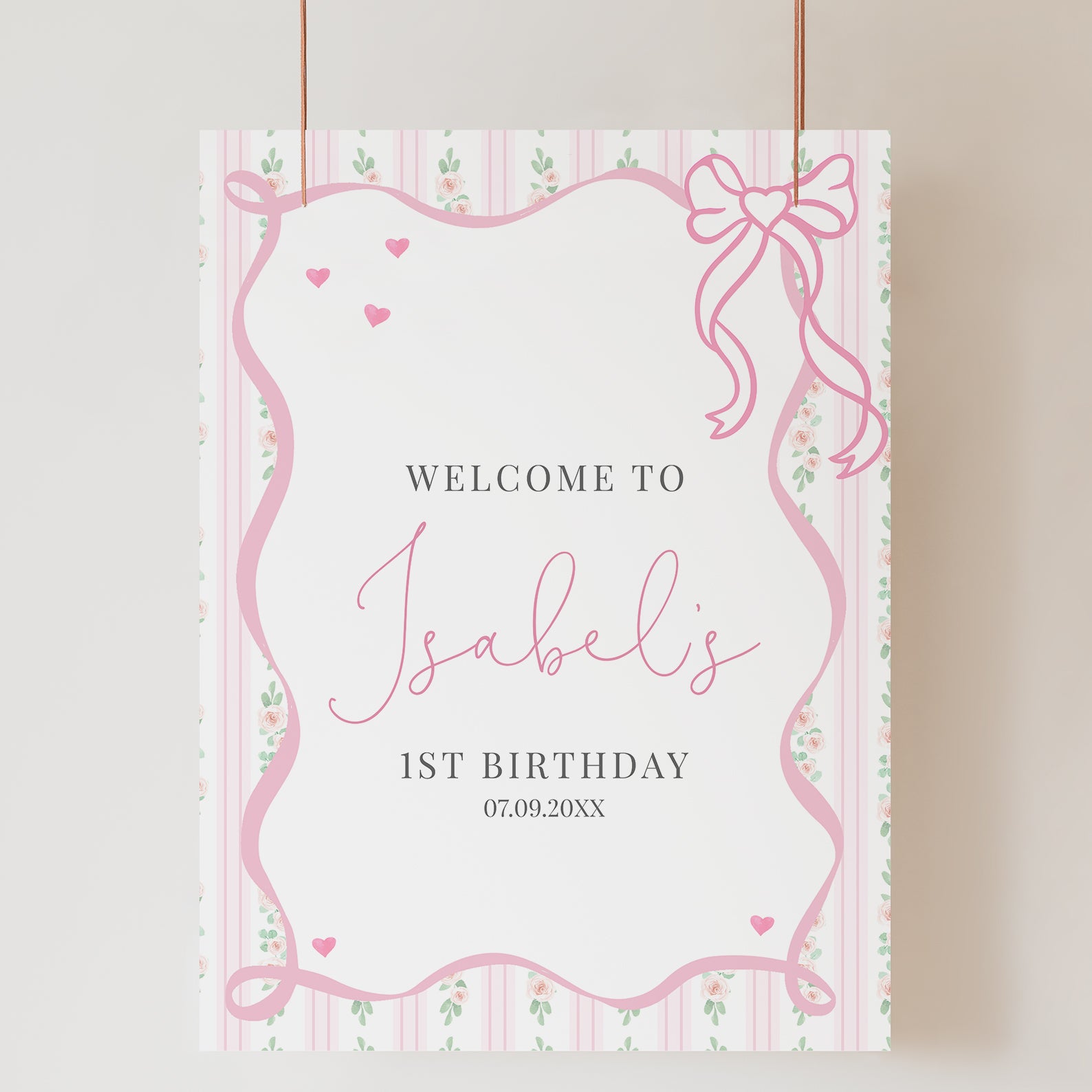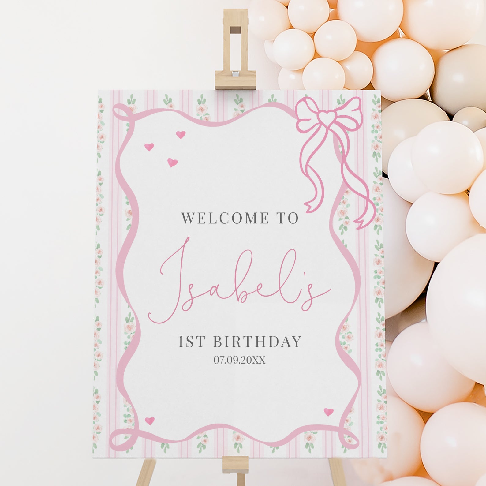 - Purchase this Pink Floral First Birthday Welcome Sign: Coquette Ribbon Theme template