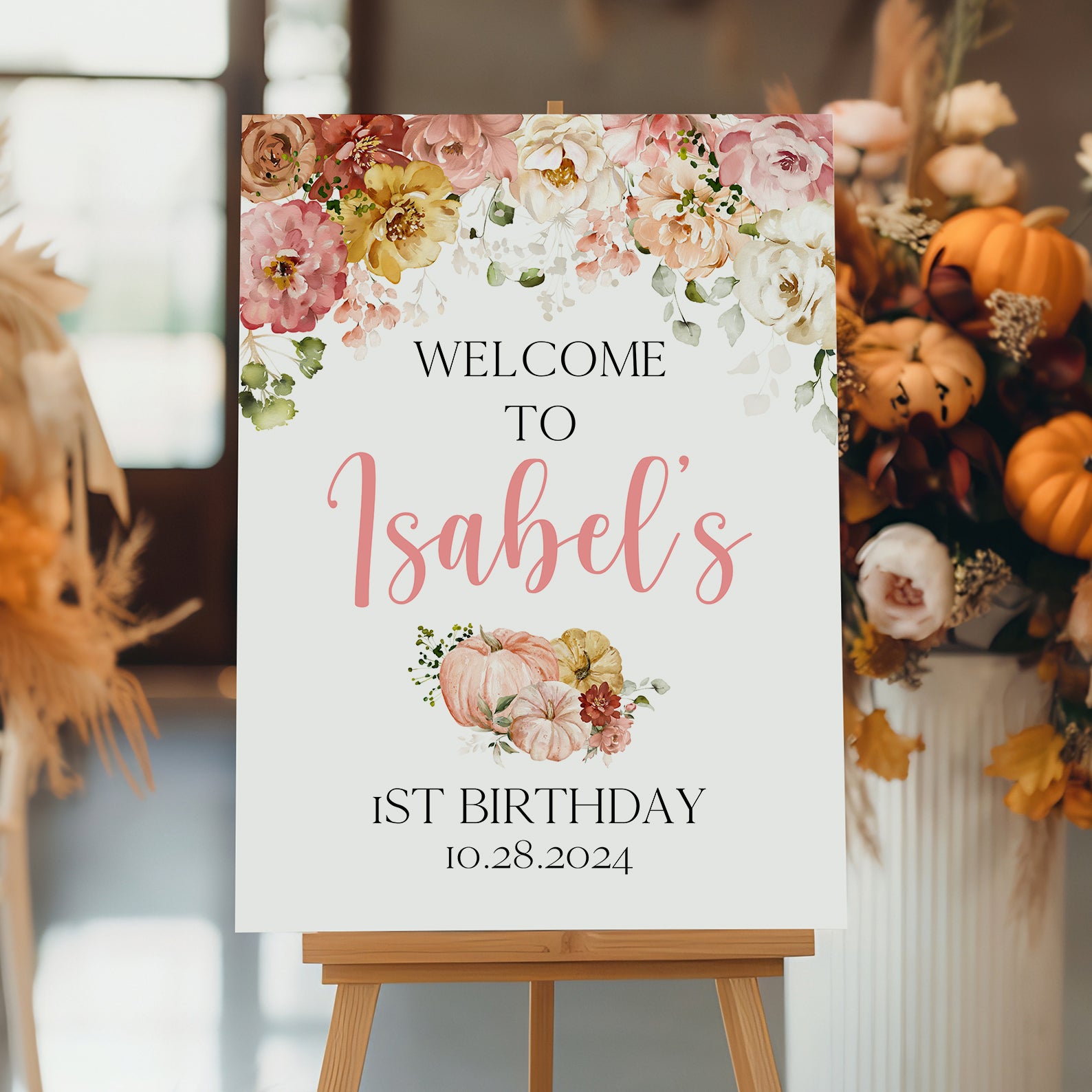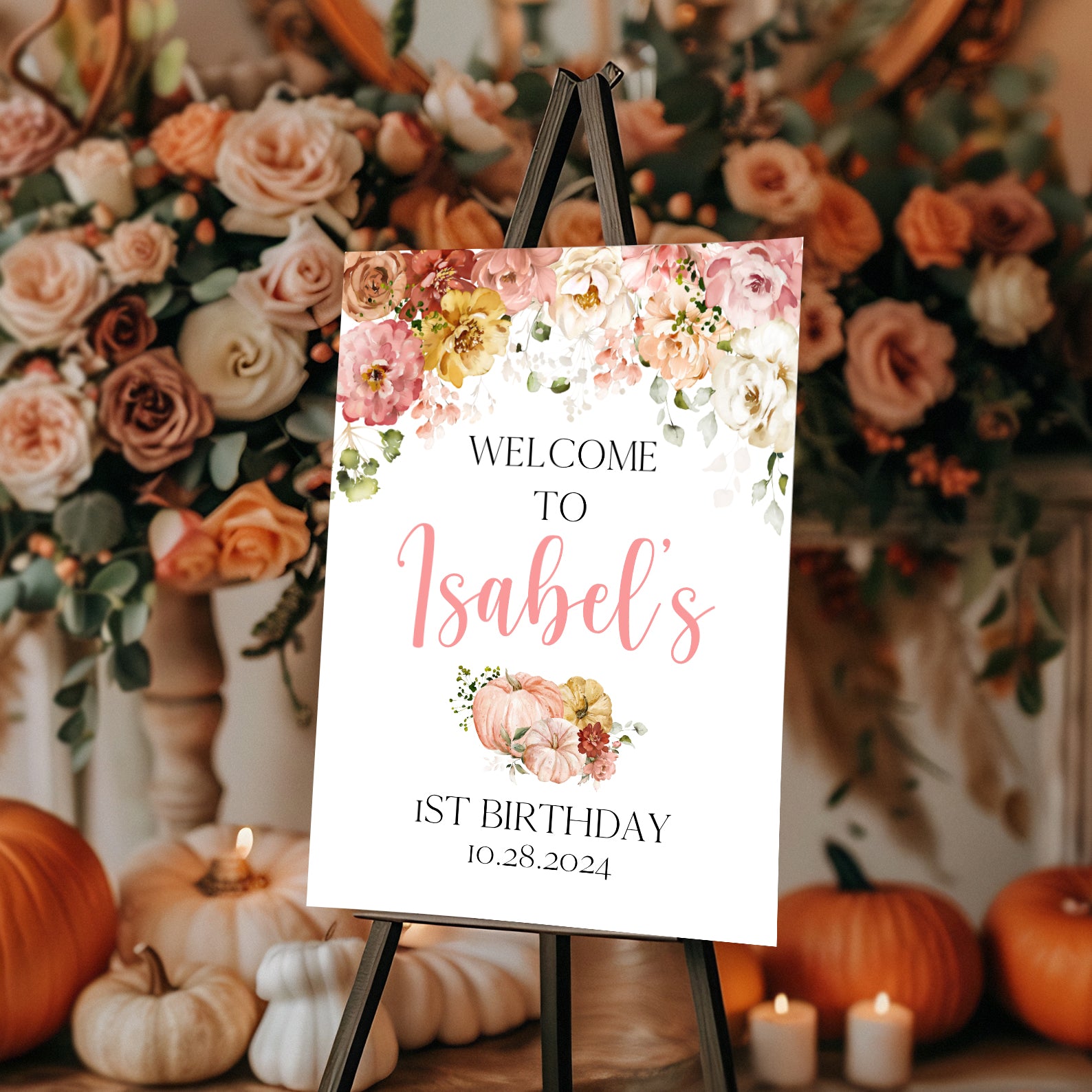 - Purchase this Pink Floral Pumpkin First Birthday Digital Welcome Sign Fall Theme template