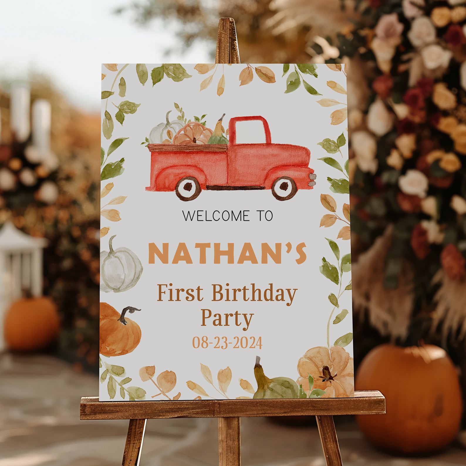 Pumpkin First Birthday: Fall Red Truck Welcome Sign