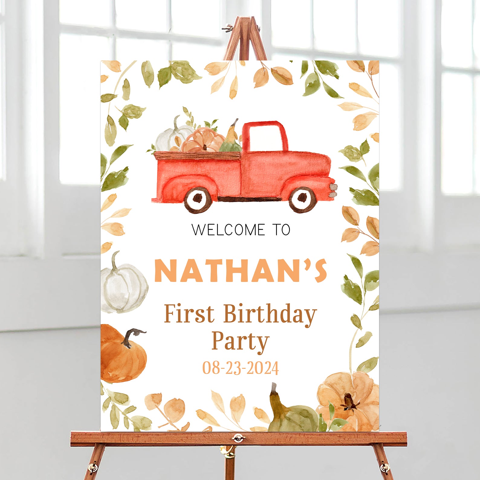 1. Purchase this Pumpkin First Birthday: Fall Red Truck Welcome Sign template