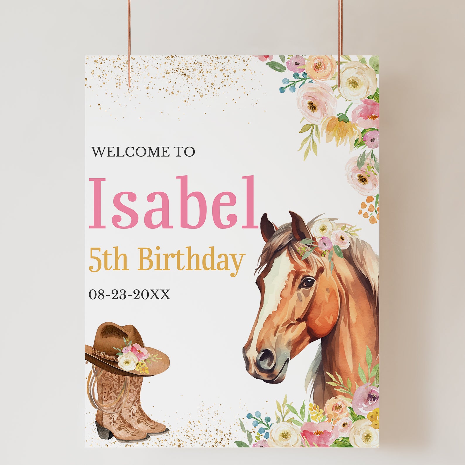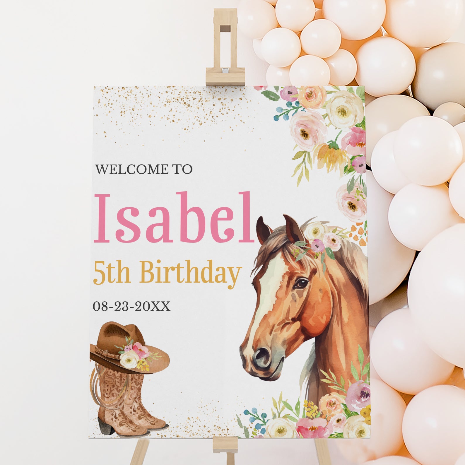 Saddle up and step into the celebration with our charming 5th birthday welcome sign! Designed with soft floral details and elegant gold accents, this Western-inspired sign features a beautiful horse adorned with blooms, and a pair of cowboy boots topped with a stylish hat, all on a warm and inviting layout. The top right is decorated with delicate flowers and gold touches, setting a sweet yet adventurous tone. Perfect for greeting guests at the entrance, this printable sign adds the perfect finishing touch to your little cowgirl’s big day!
