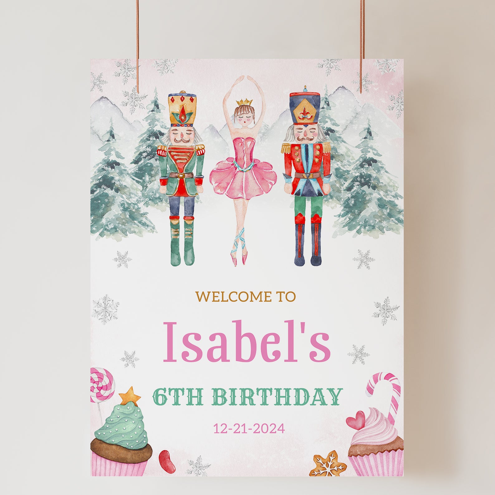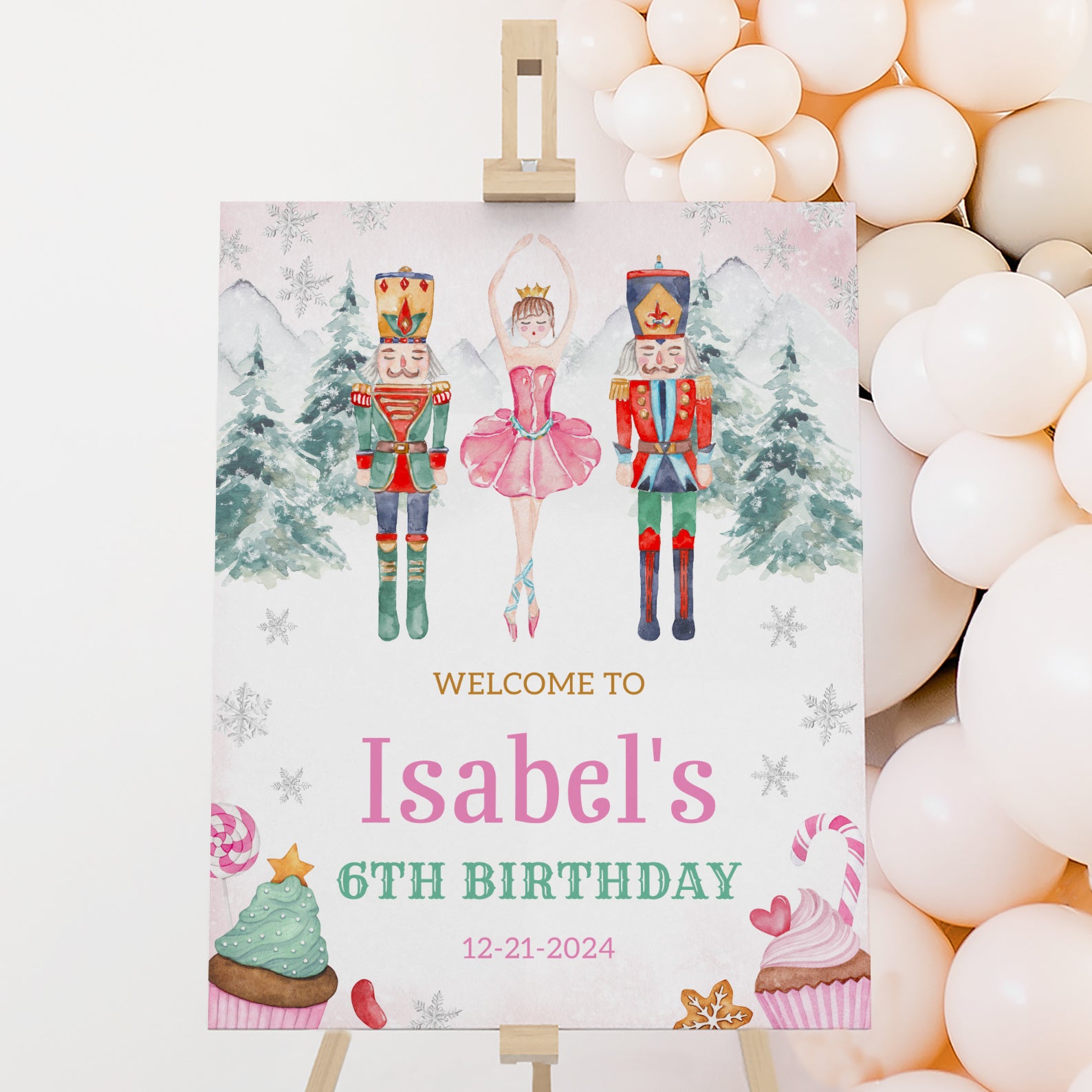 Add a magical touch to your child’s celebration with our Sugar Plum Fairy Winter Birthday Welcome Sign. Designed in a charming pink palette, it features a snowy mountain backdrop, pine trees, and sparkling snowflakes. At the base, festive sweets like cupcakes, lollipops, candy canes, and cookies that bring holiday cheer. The graceful Sugar Plum Fairy, flanked by nutcrackers, warmly greets guests to a whimsical, fairy-tale birthday.
