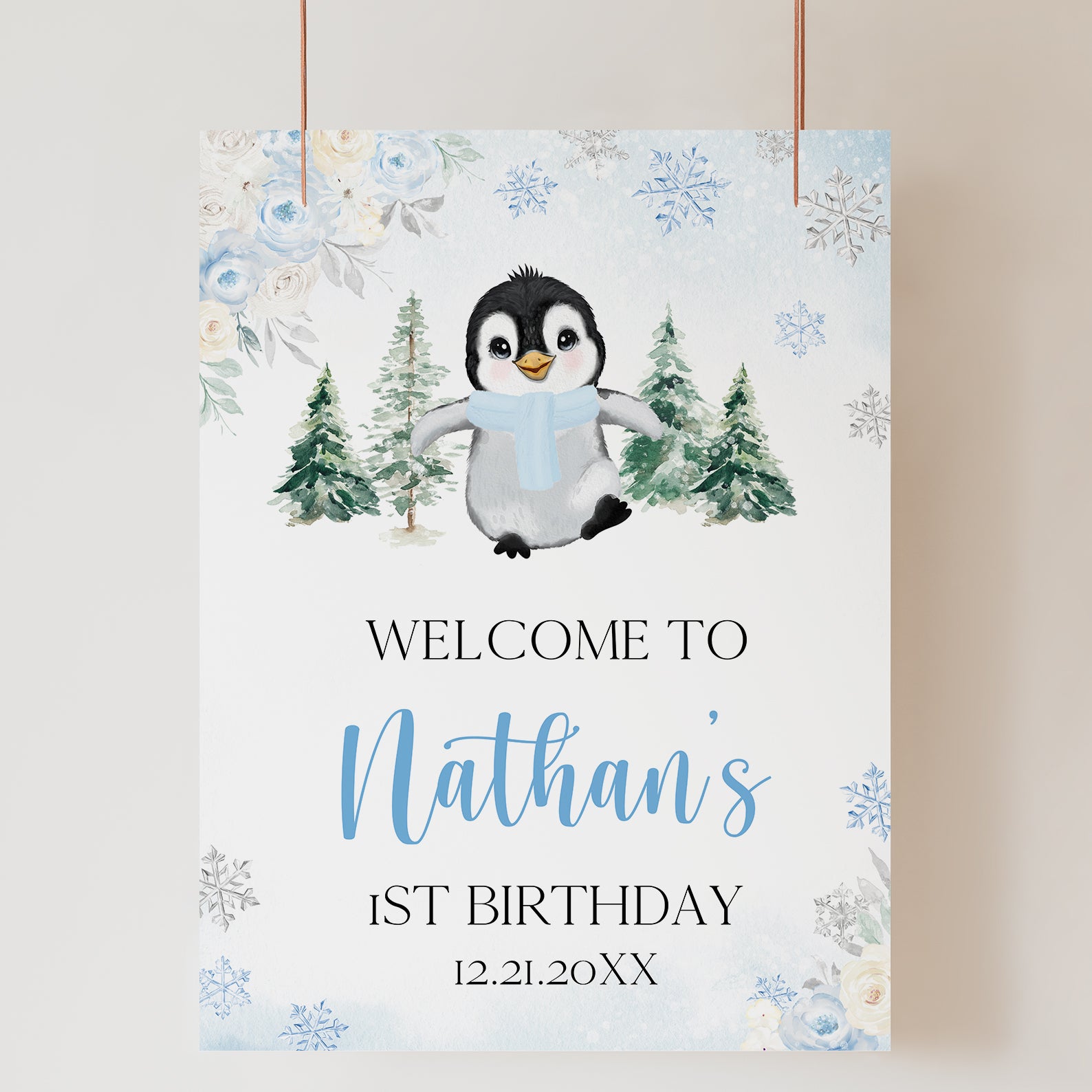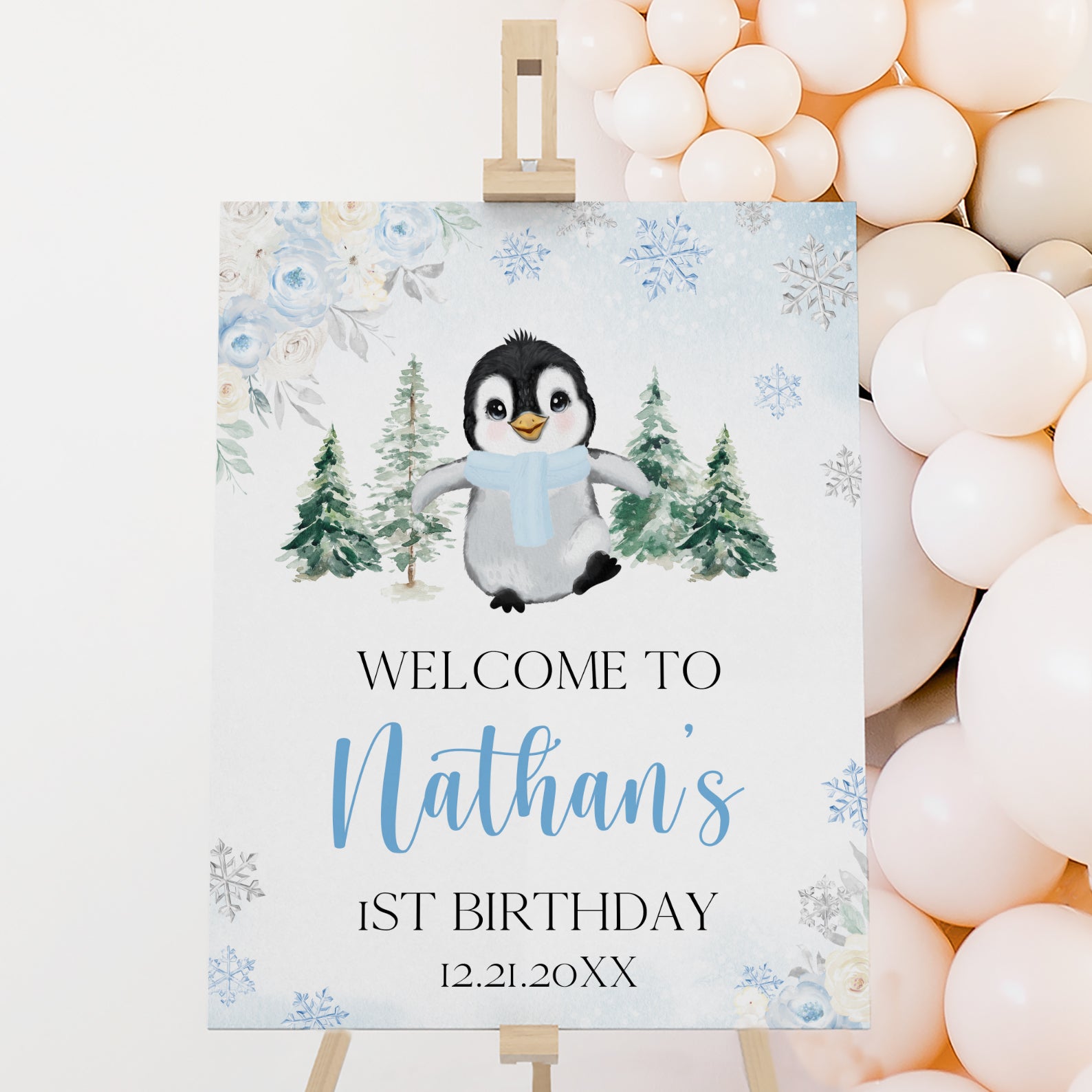 Welcome guests to a frosty, fun-filled celebration with our Winter Birthday Welcome Sign! Featuring an adorable baby penguin wrapped in a cozy scarf, surrounded by whimsical falling snowflakes and a charming floral border, this design creates a festive and inviting entrance. Available in soft pink or serene blue, the snow-covered pine trees in the background set a magical winter scene, perfect for your little one’s first birthday celebration.