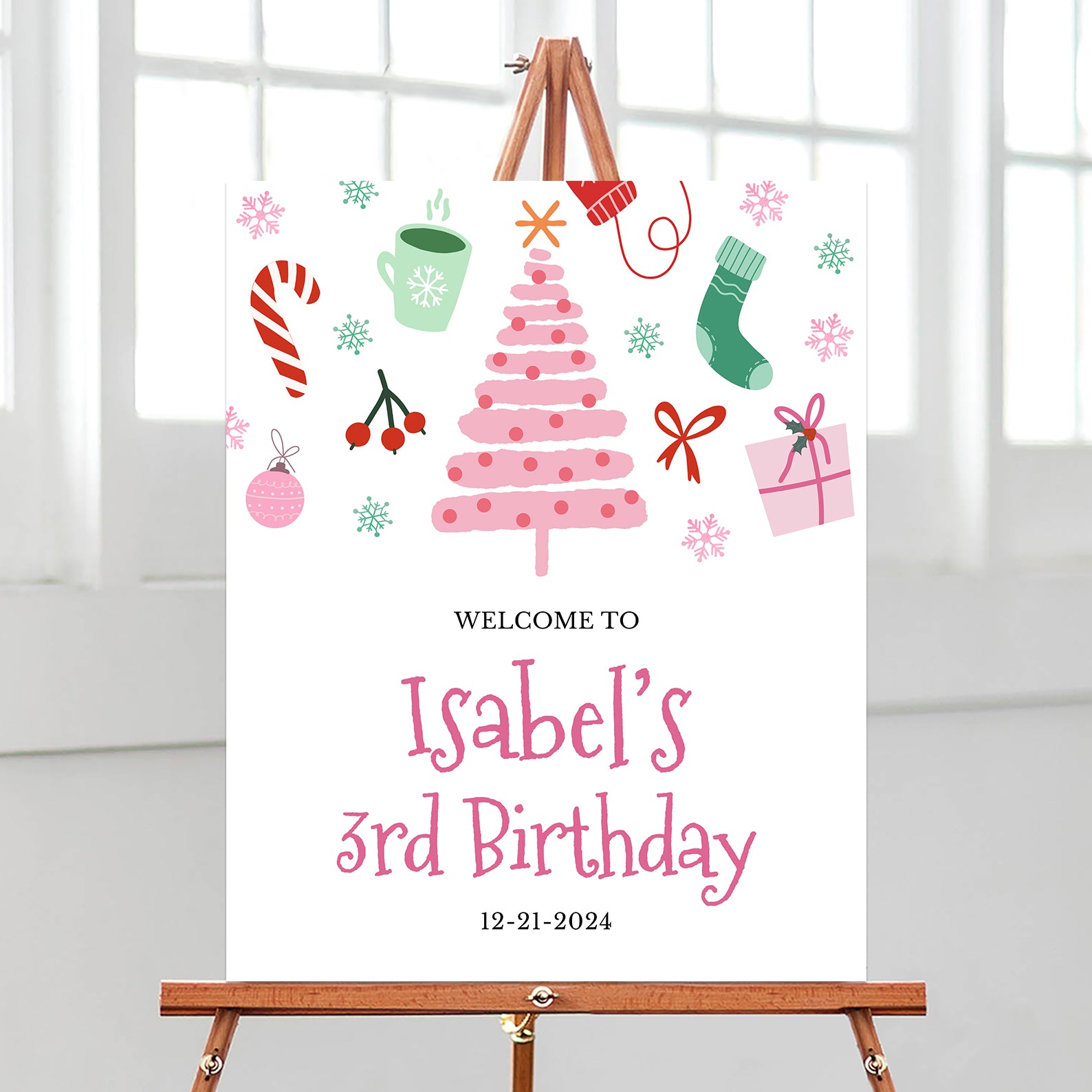 - Purchase this Winter 3rd Birthday Welcome Sign: Pink Christmas Tree & Snowflakes template