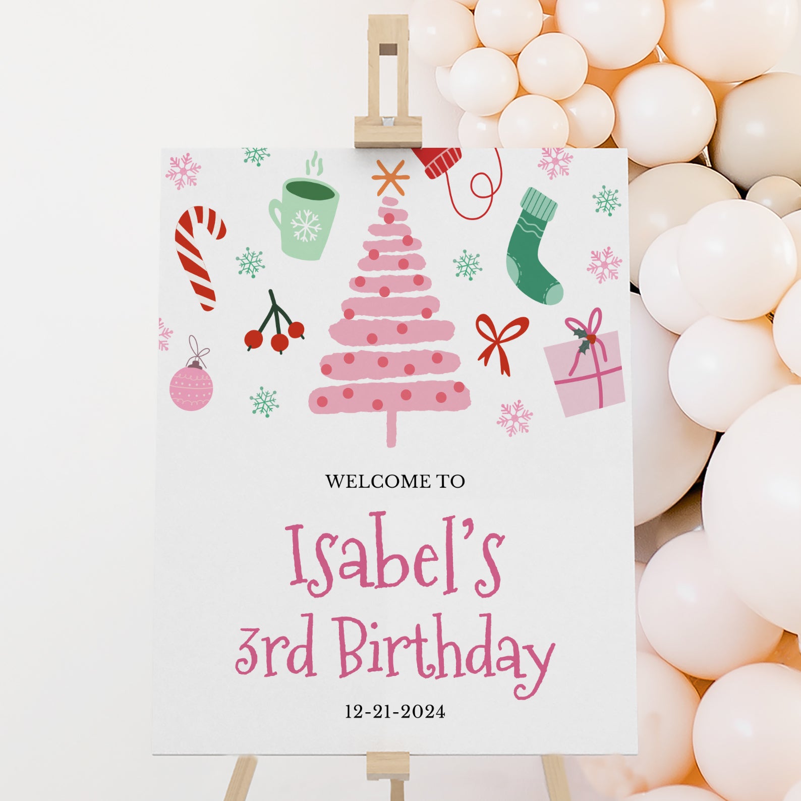 Welcome guests to your little one's 3rd birthday with our enchanting winter-themed digital welcome sign! Featuring a charming pink Christmas tree adorned with sparkling snowflakes, festive ornaments, and whimsical candy canes, this sign sets a magical tone for the celebration. Accented with cozy ribbons, gifts, cute socks, and a cheerful mug, it beautifully captures the joy of the season. Perfect for greeting friends and family, this winter wonderland design adds a festive and cheerful touch to your child’s special day.