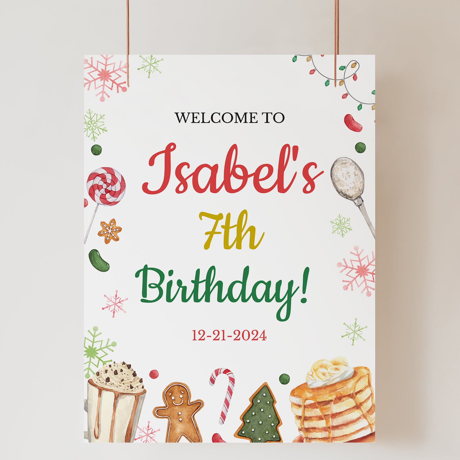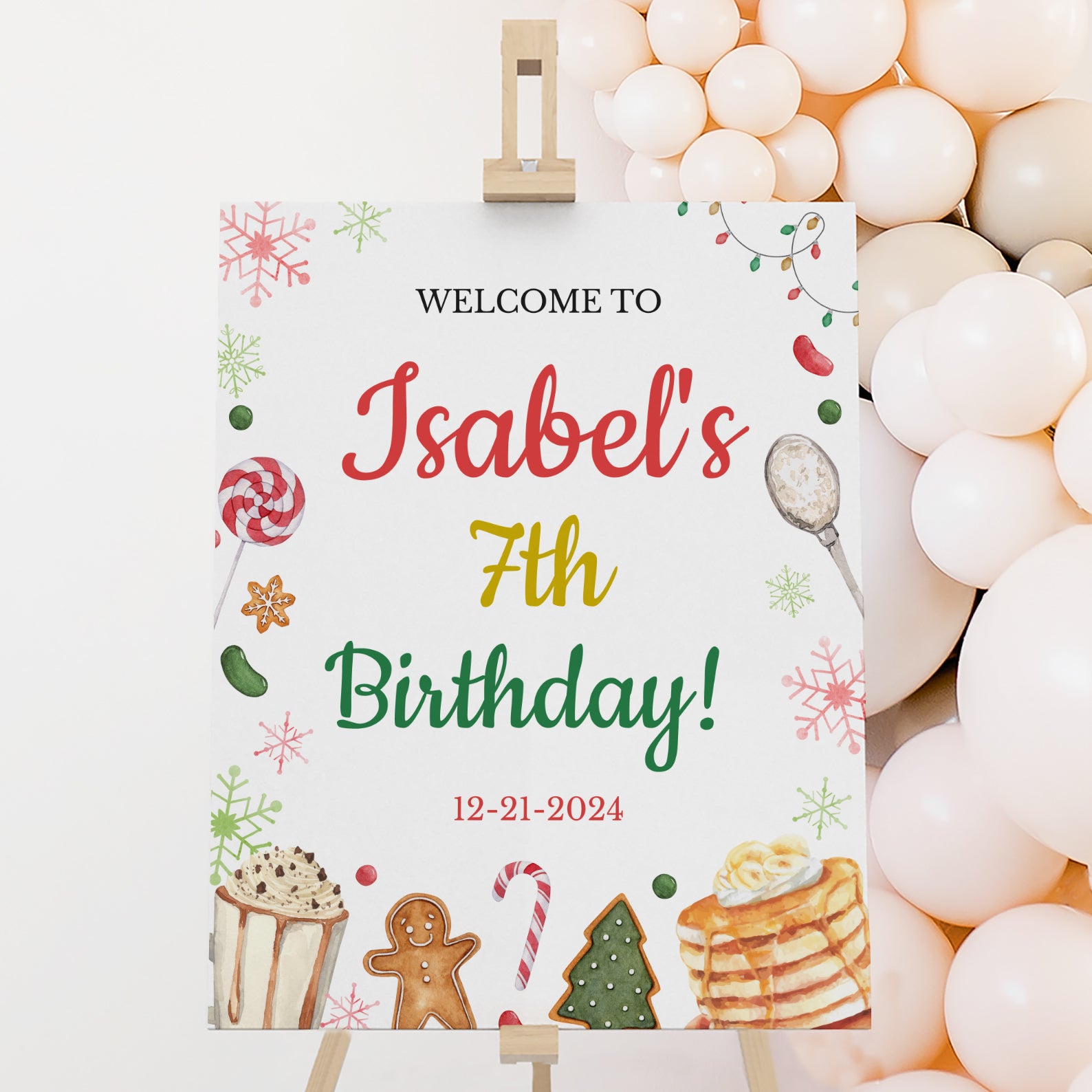 Welcome your guests in style with this charming Winter Birthday Digital Welcome Sign! Featuring colorful snowflakes, twinkling Christmas lights, and festive treats like candies, cookies, and candy canes, this design perfectly sets the cozy pancakes and pajamas party theme. A warm cup of cocoa adds to the whimsical winter vibe, creating a festive and inviting atmosphere for friends and family as they arrive to celebrate your little one’s special day.