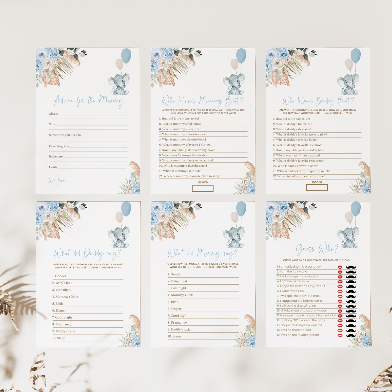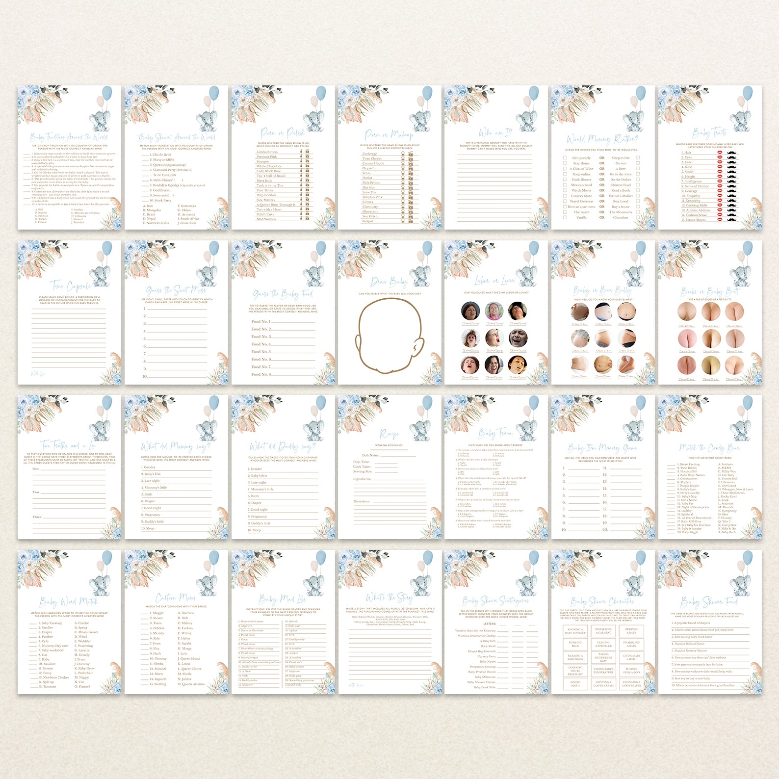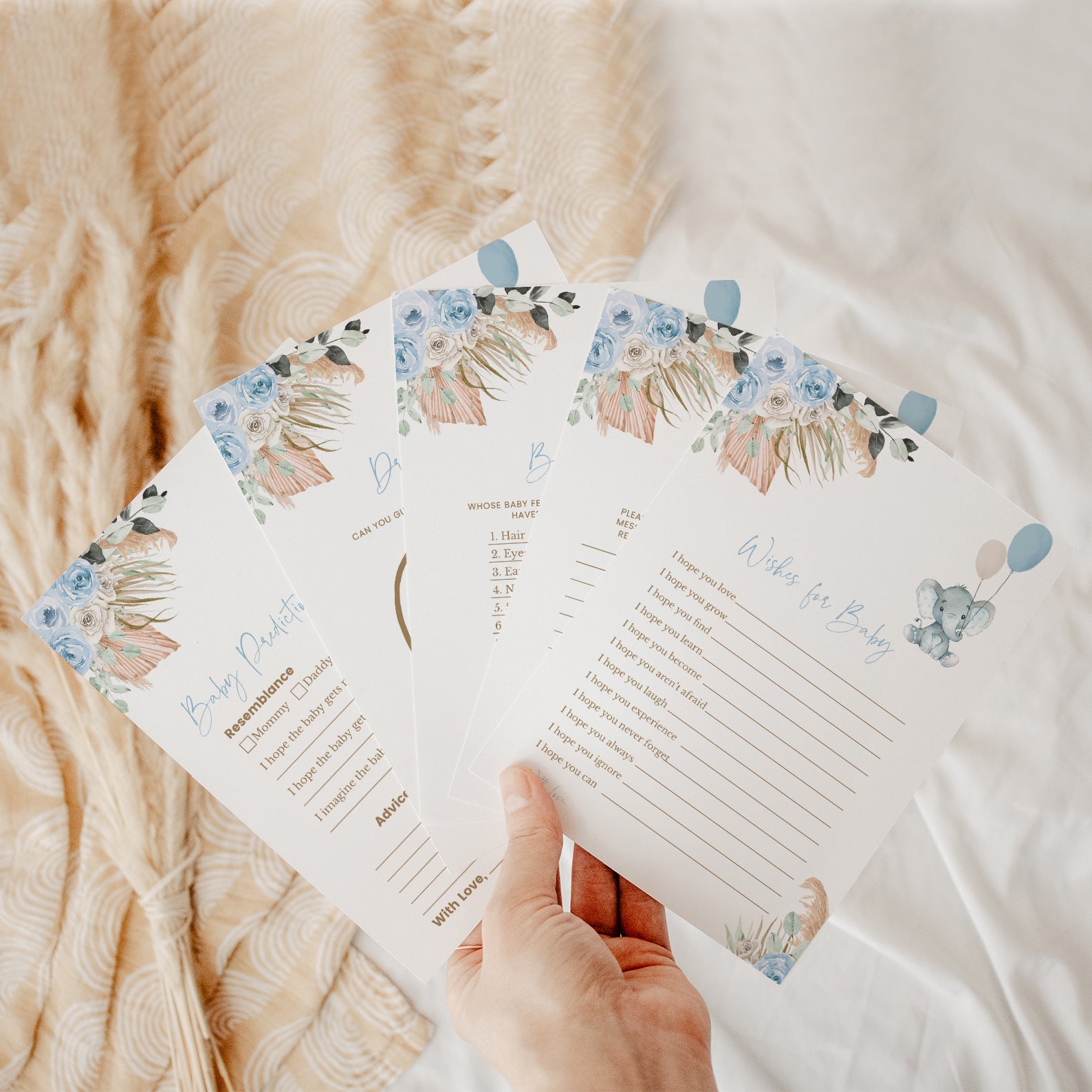 Blue Baby Shower Game Bundle: Whimsical Elephant & Boho Florals