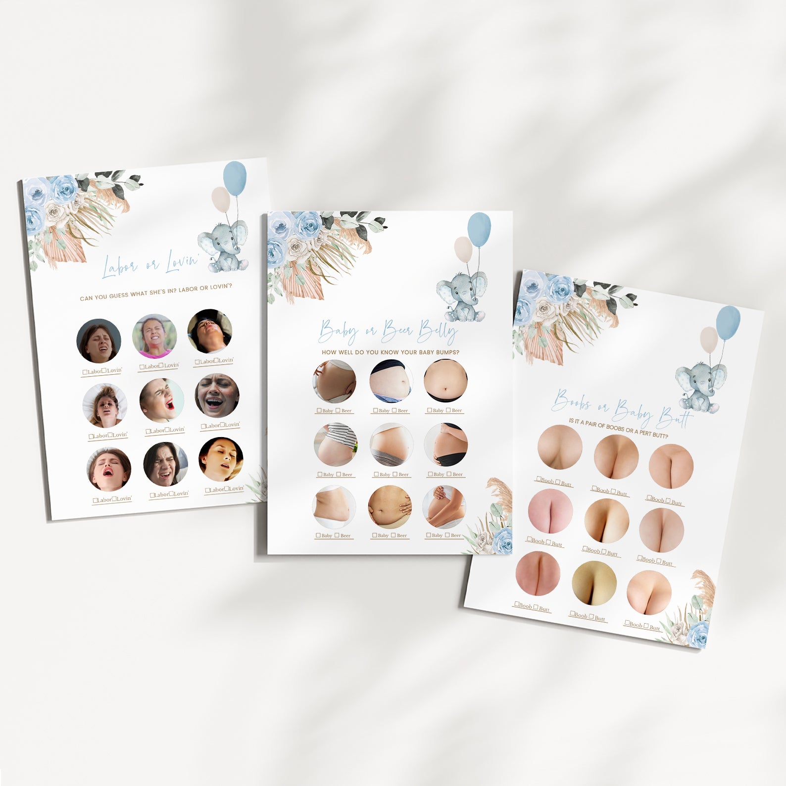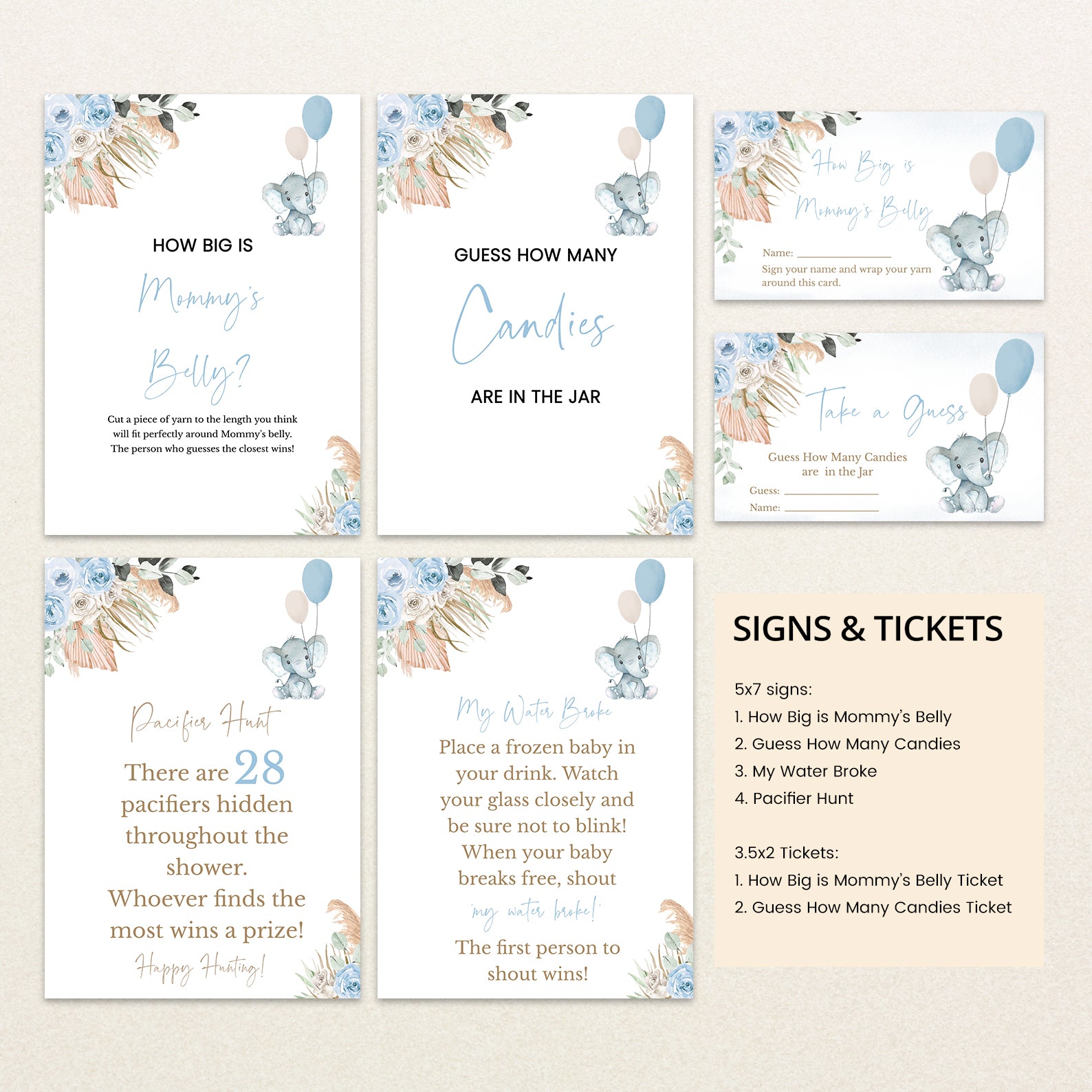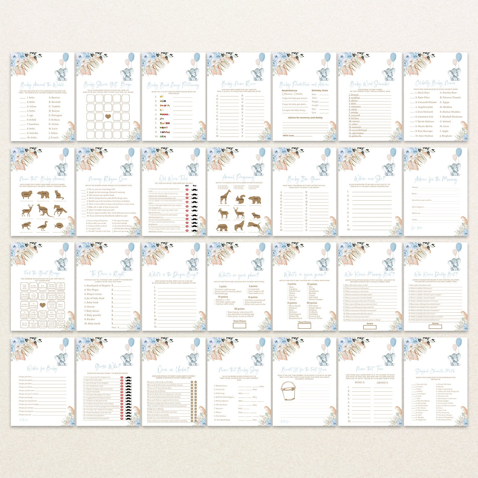 Blue Baby Shower Game Bundle: Whimsical Elephant & Boho Florals