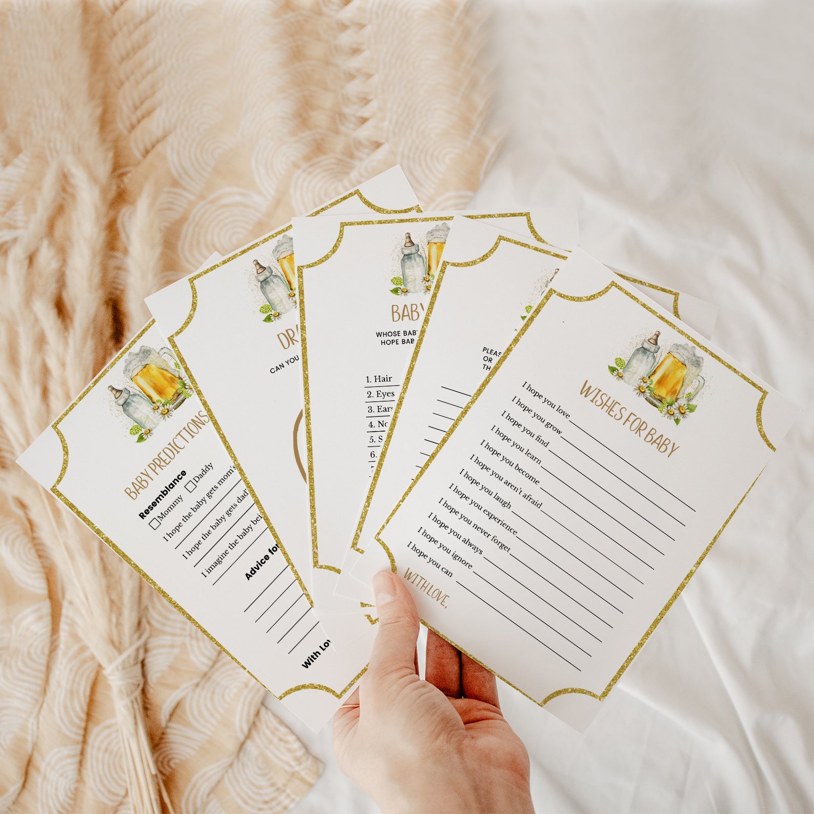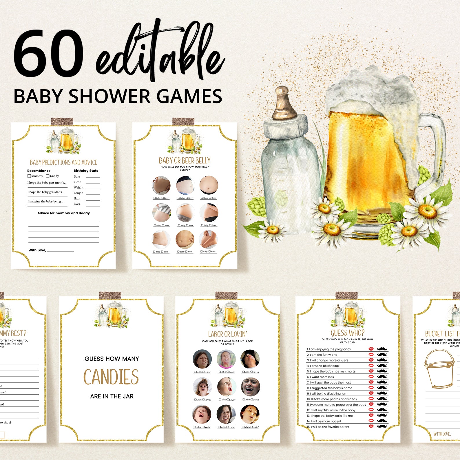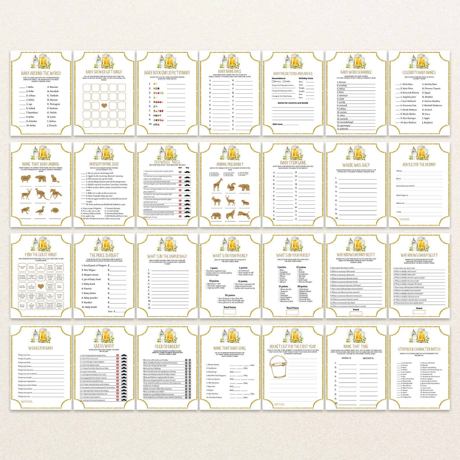Celebrate the upcoming arrival of your little one with our "Gold Ticket Baby Shower" Game Bundle! Inspired by the unique gold ticket shape and playful beer mug design, this bundle includes 60 exciting and engaging games to add a fun and memorable touch to your celebration. With whimsical elements like the frothy beer mug and daisy accents, these games will keep your guests entertained and ensure your baby shower is a hit. Customizable and easy to share, this bundle perfectly blends fun with elegance, setting the perfect tone for your special event!