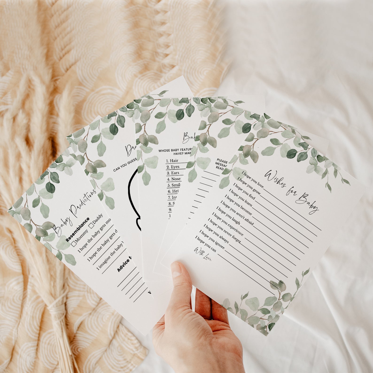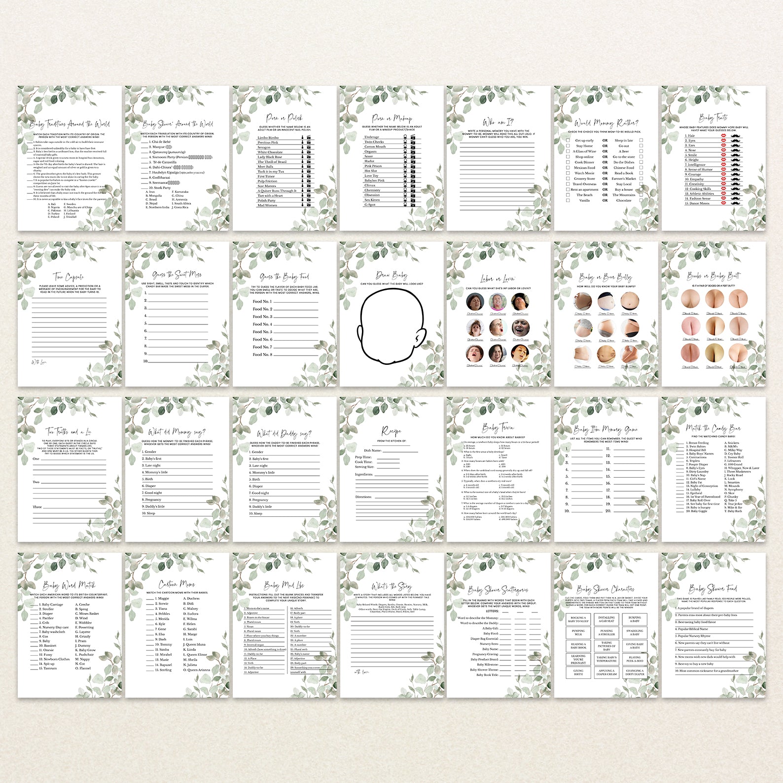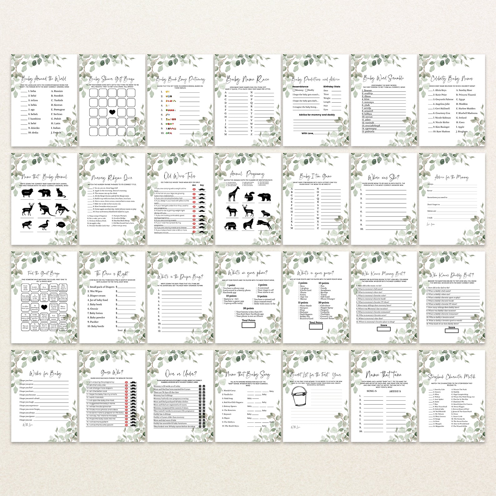 Greenery Baby Shower Game Bundle: Elegant Leaf Design