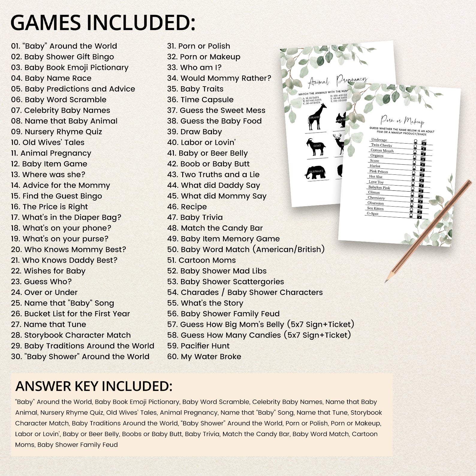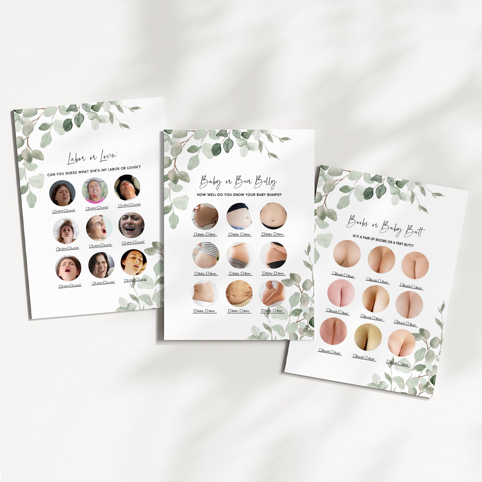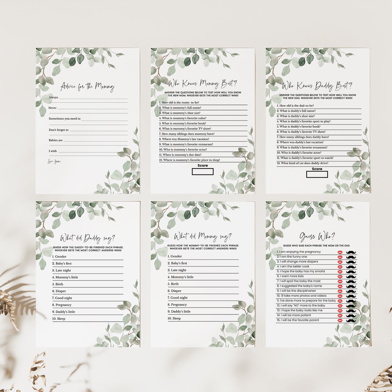 Greenery Baby Shower Game Bundle: Elegant Leaf Design