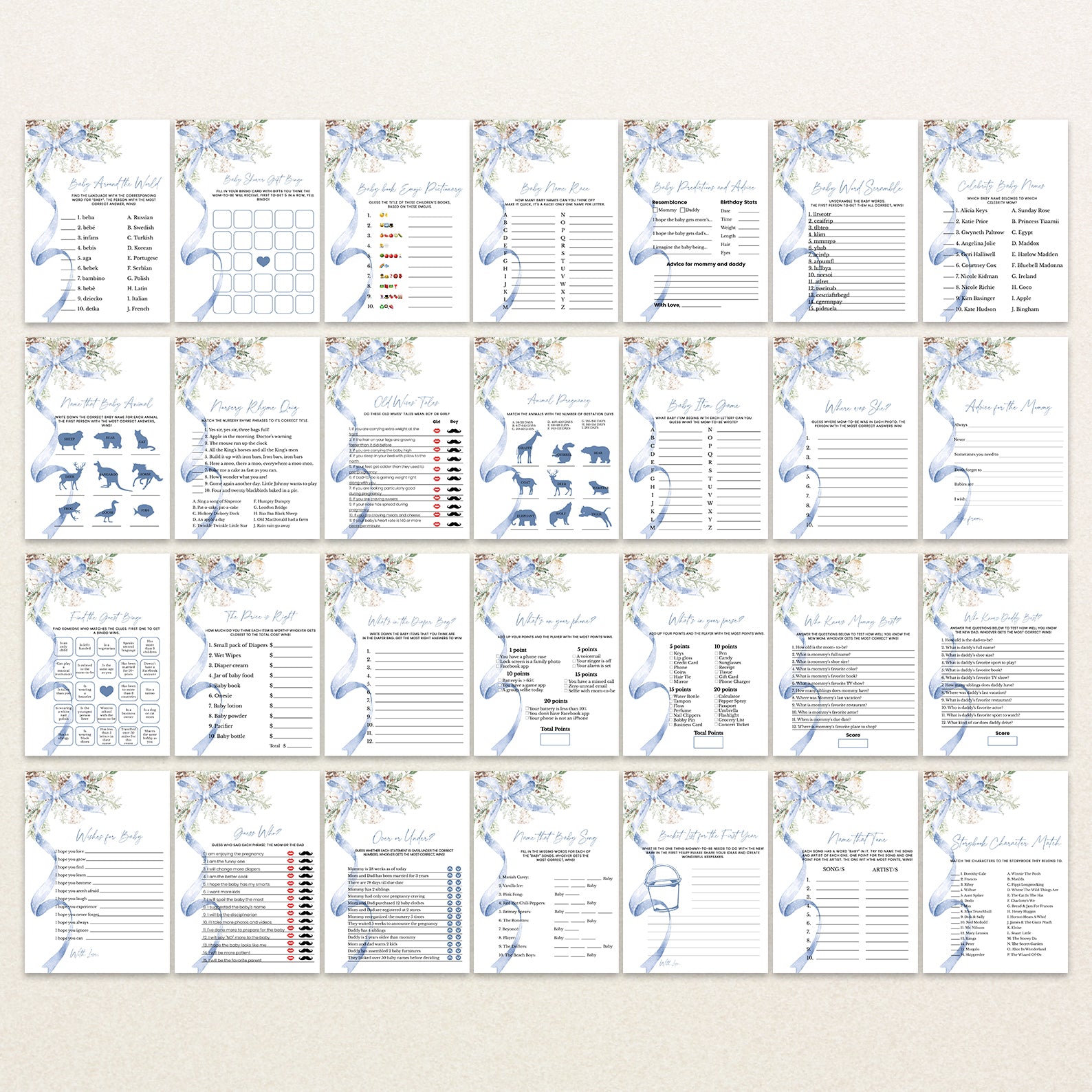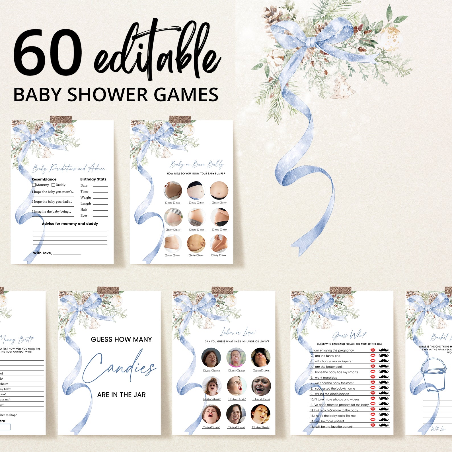 Bring fun to your shower with our Winter Baby Shower Game Bundle, decorated with Christmas tree leaves, a watercolor blue ribbon, and festive seasonal details. This collection includes 60 editable baby shower games, offering endless entertainment for your guests. From classics to interactive activities, each game is easy to customize and print. A stylish and joyful way to make your winter baby shower truly unforgettable.