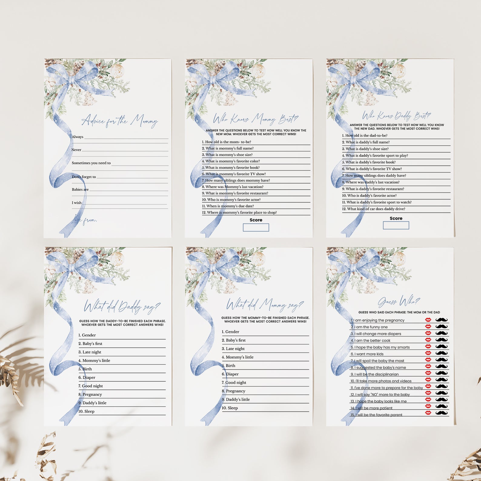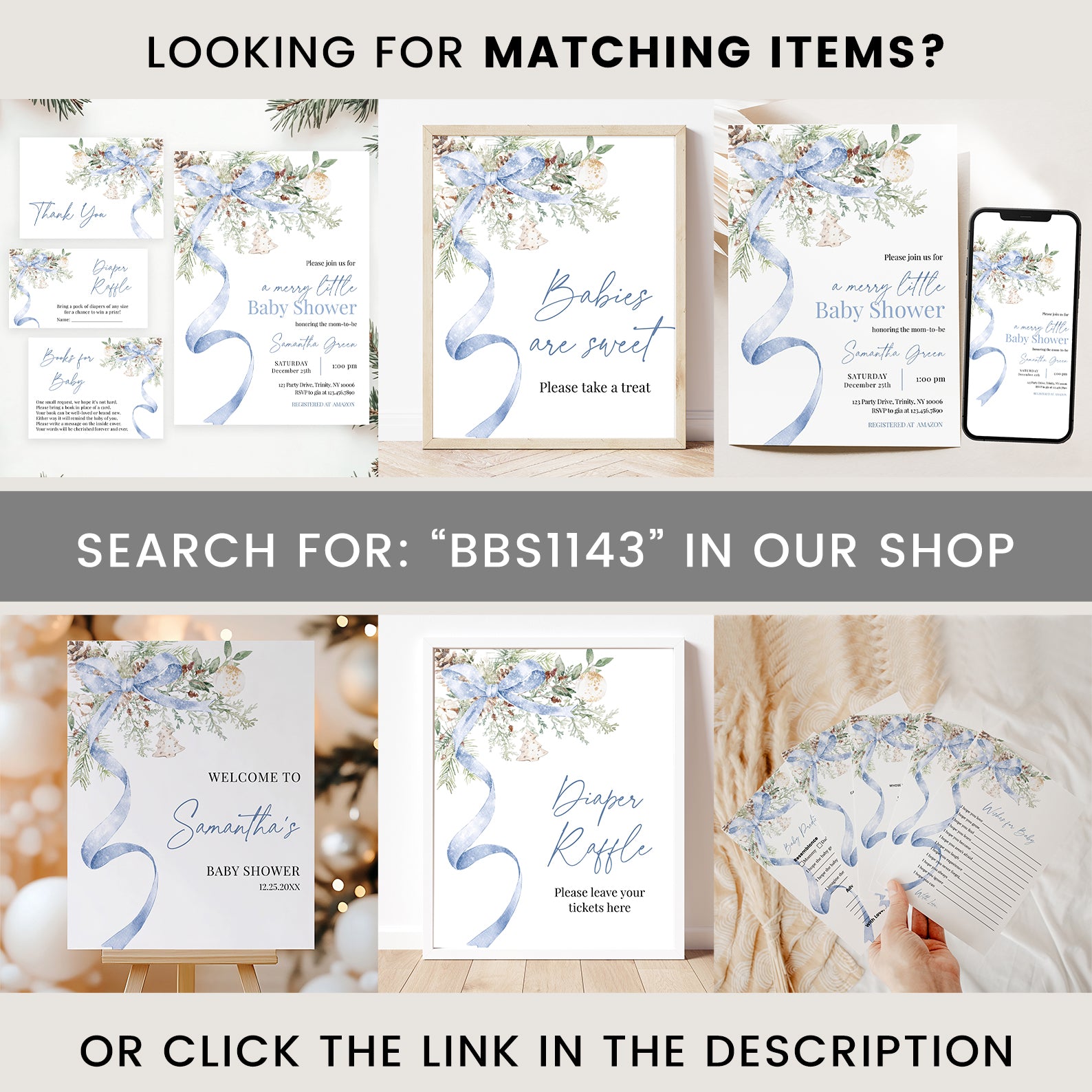 - Purchase this Merry Little Winter Baby Shower Game Bundle with Blue Ribbon template
