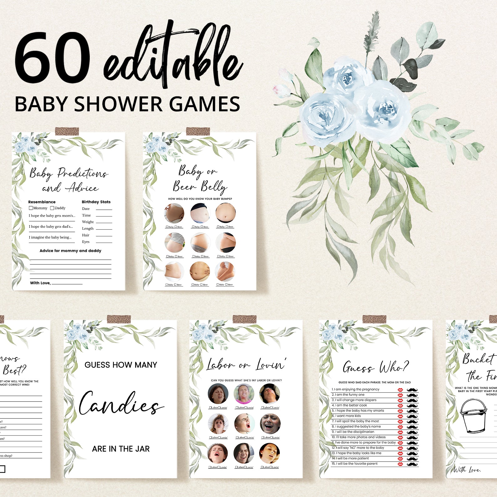 Keep your guests entertained with our fun and stylish game bundle. Designed with green leaves and delicate blue roses, this set includes 60 editable baby shower games. From classics to unique activities, each game adds excitement and joy while perfectly matching your "It’s a Boy" theme.