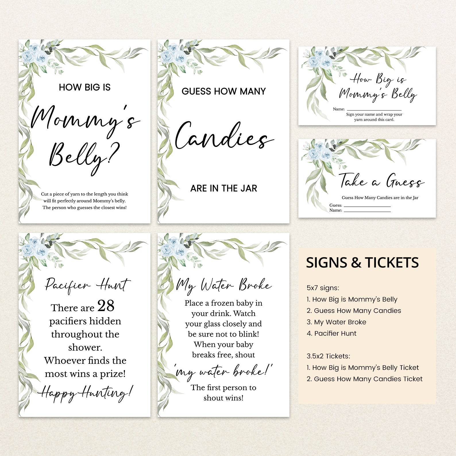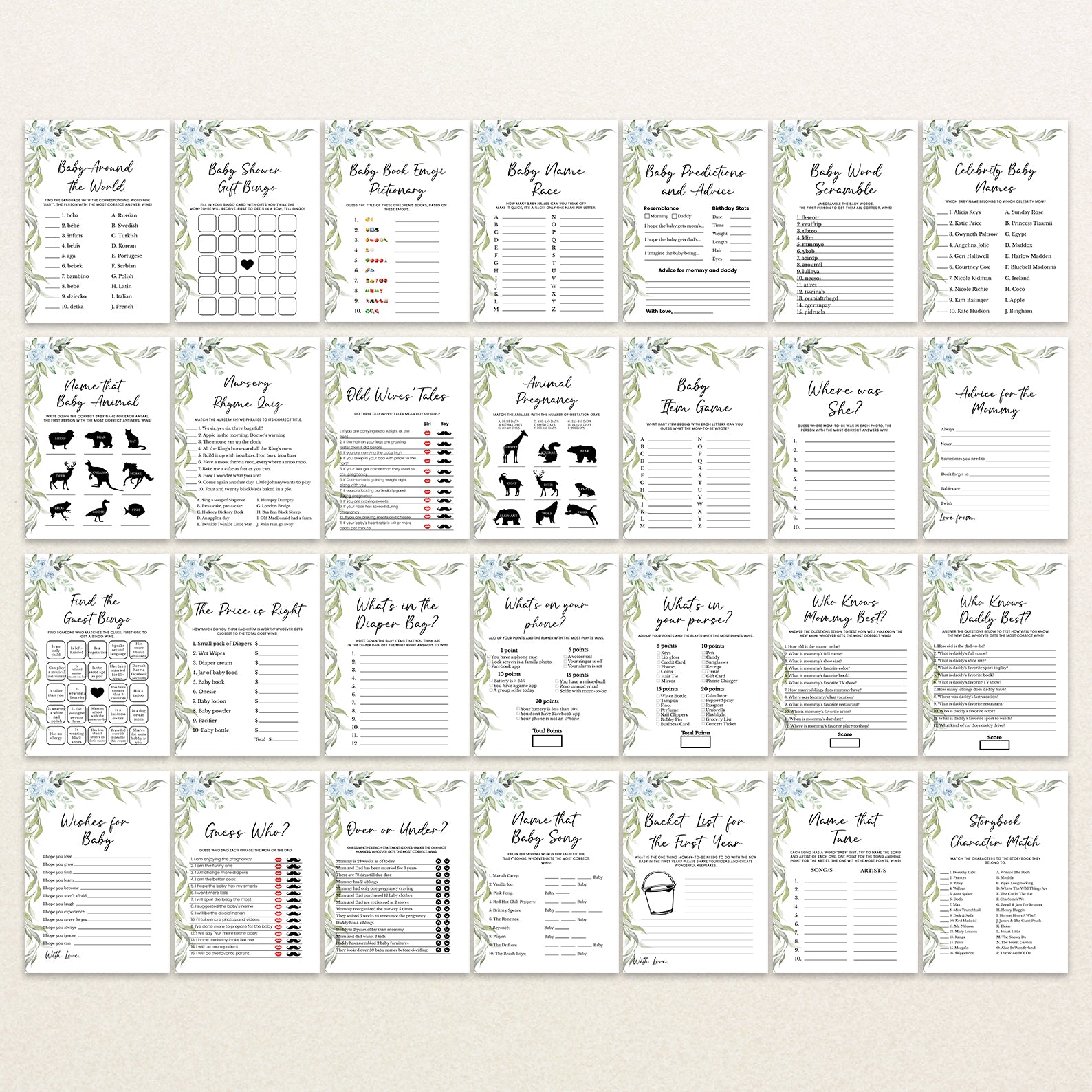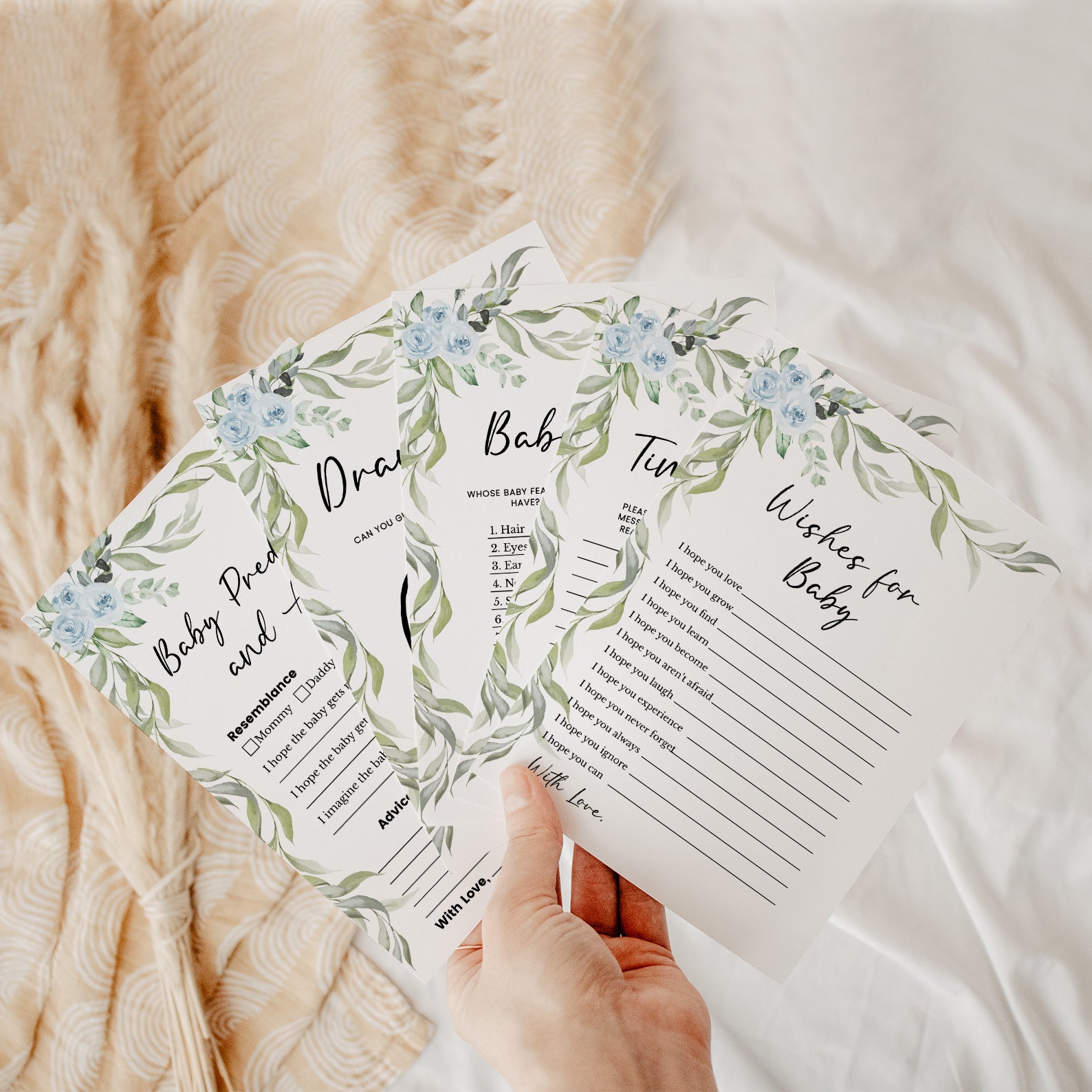 Minimalist Baby Shower Game Bundle with Blue Roses & Greenery