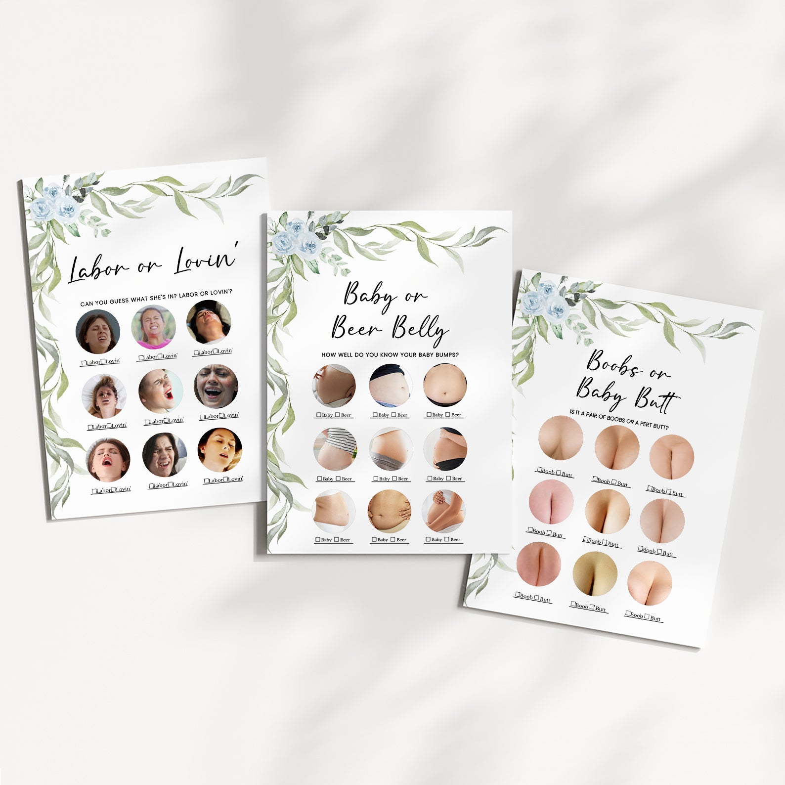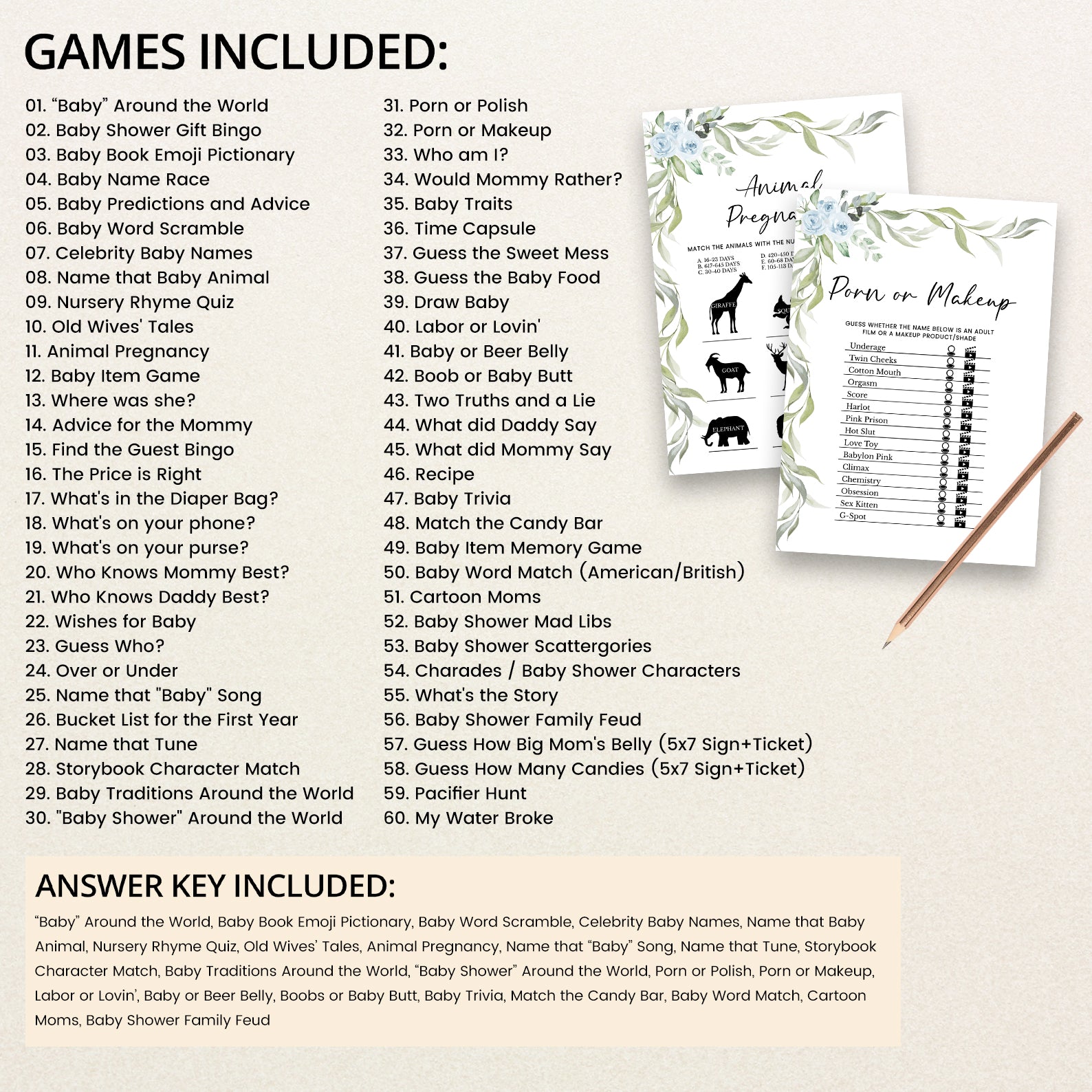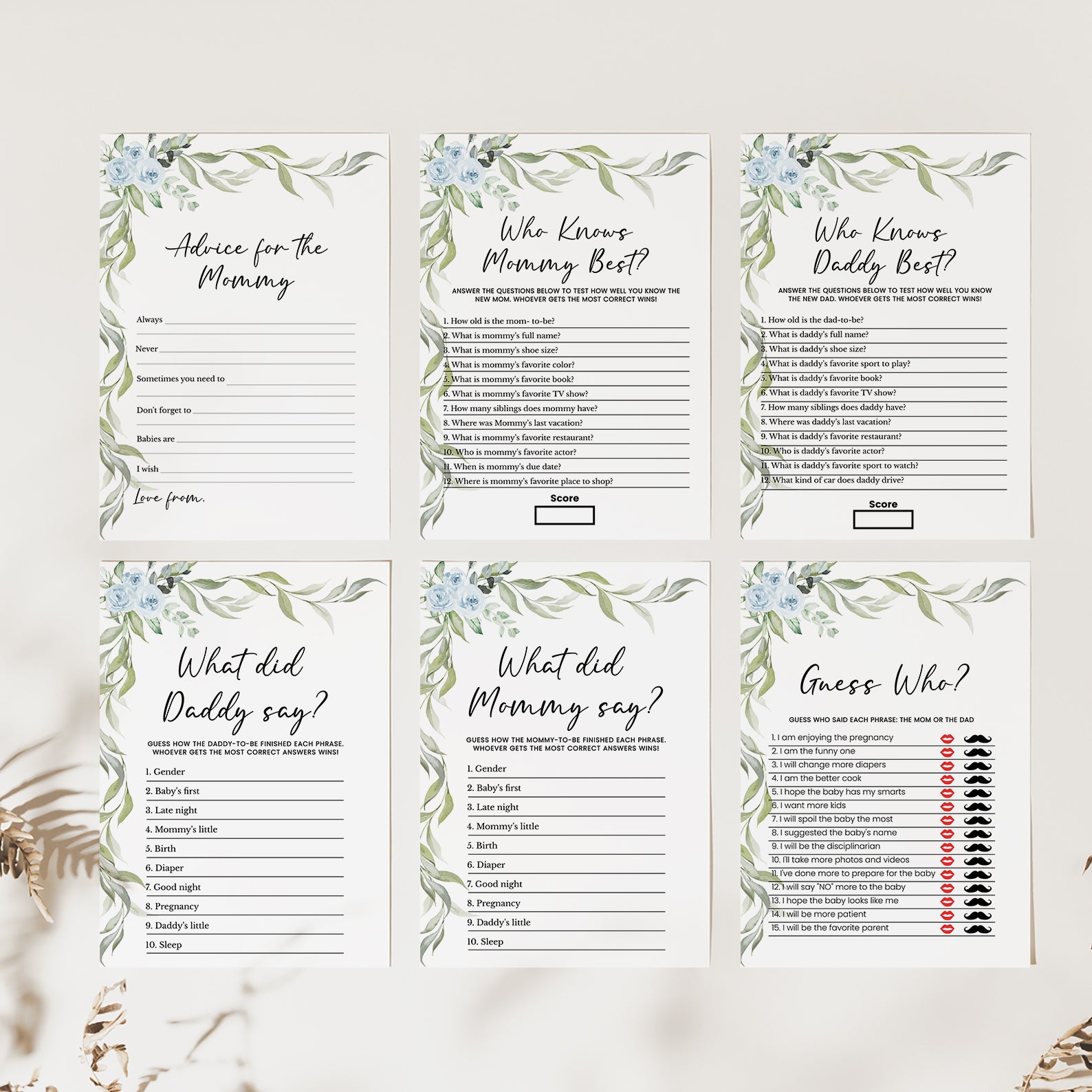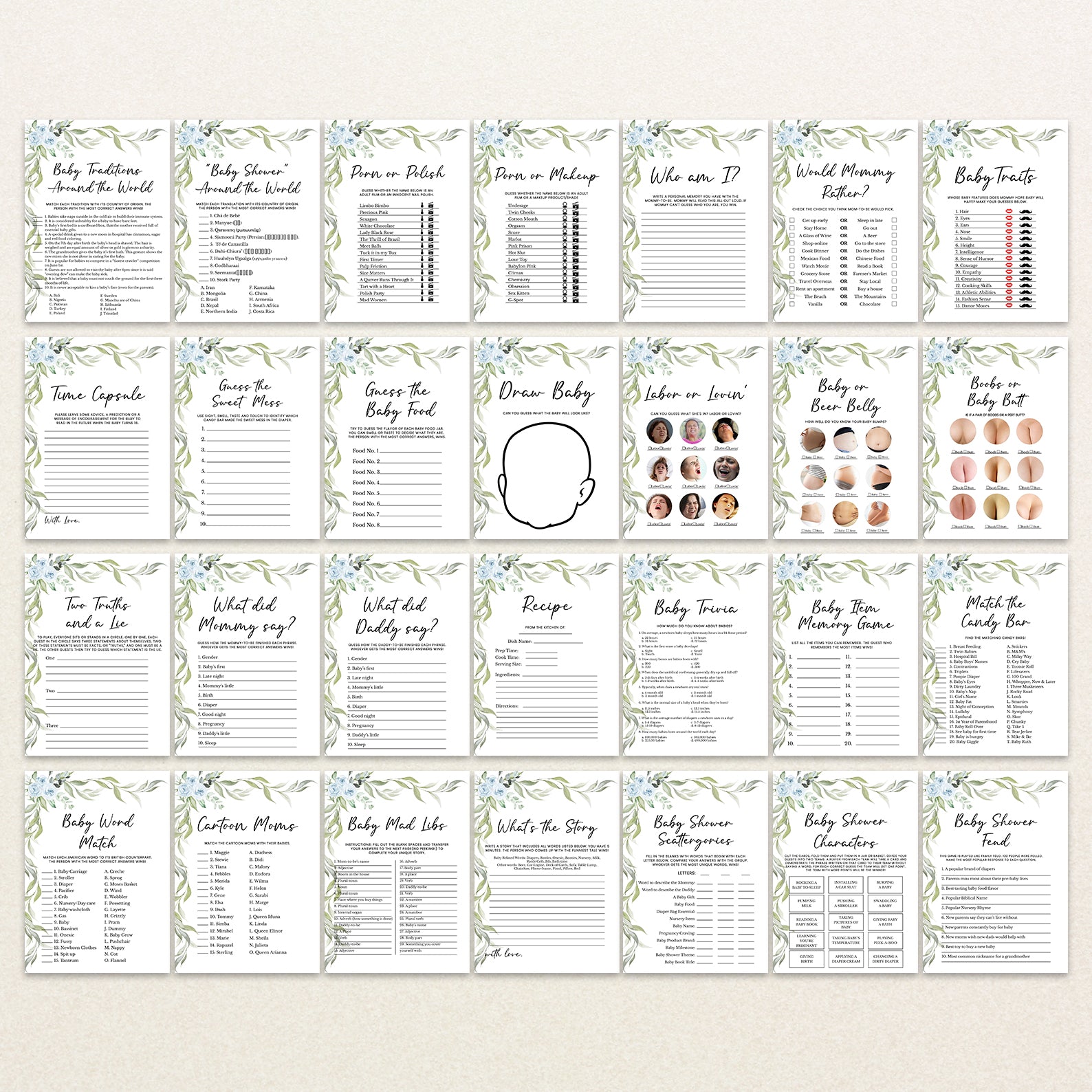 Minimalist Baby Shower Game Bundle with Blue Roses & Greenery