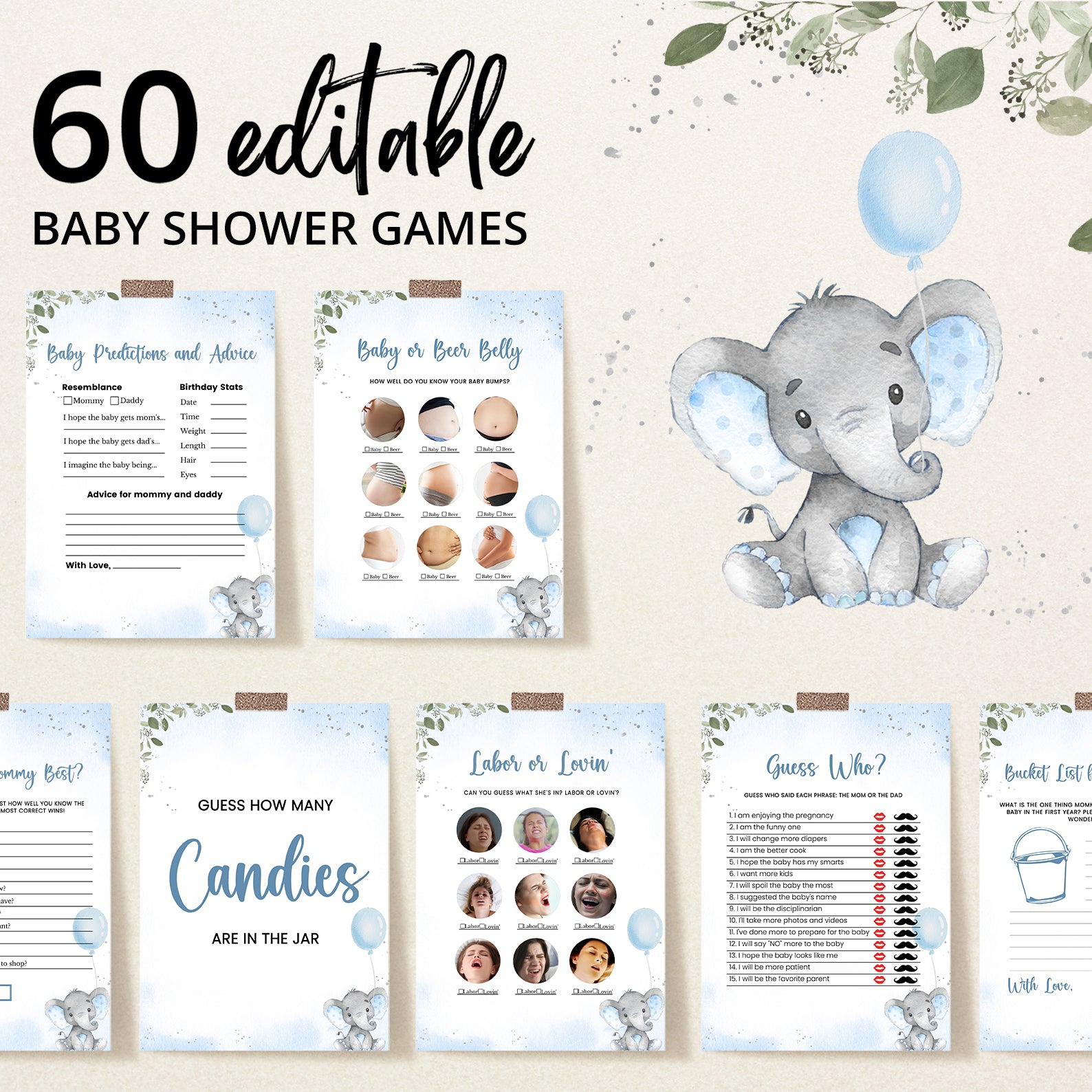 Make your celebration fun and engaging with our “Oh Baby” baby shower game bundle. Featuring a whimsical blue theme with green leaves and an adorable elephant holding a balloon, this set includes 60 editable games to entertain guests. From word scrambles to bingo, the collection ensures laughter and bonding, while the coordinated design keeps your shower stylish and memorable. An easy way to elevate your event with endless fun.