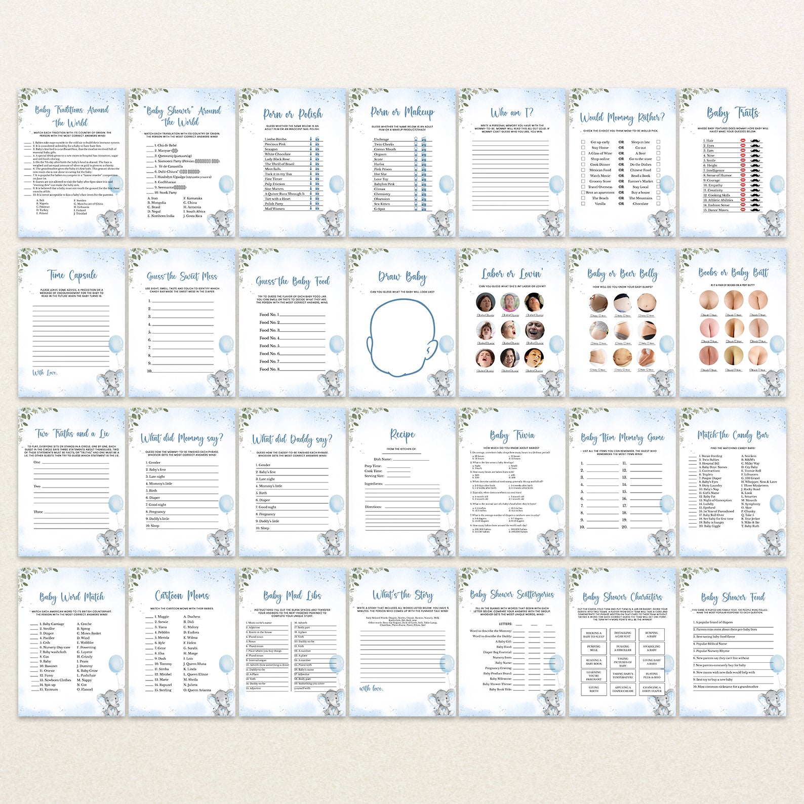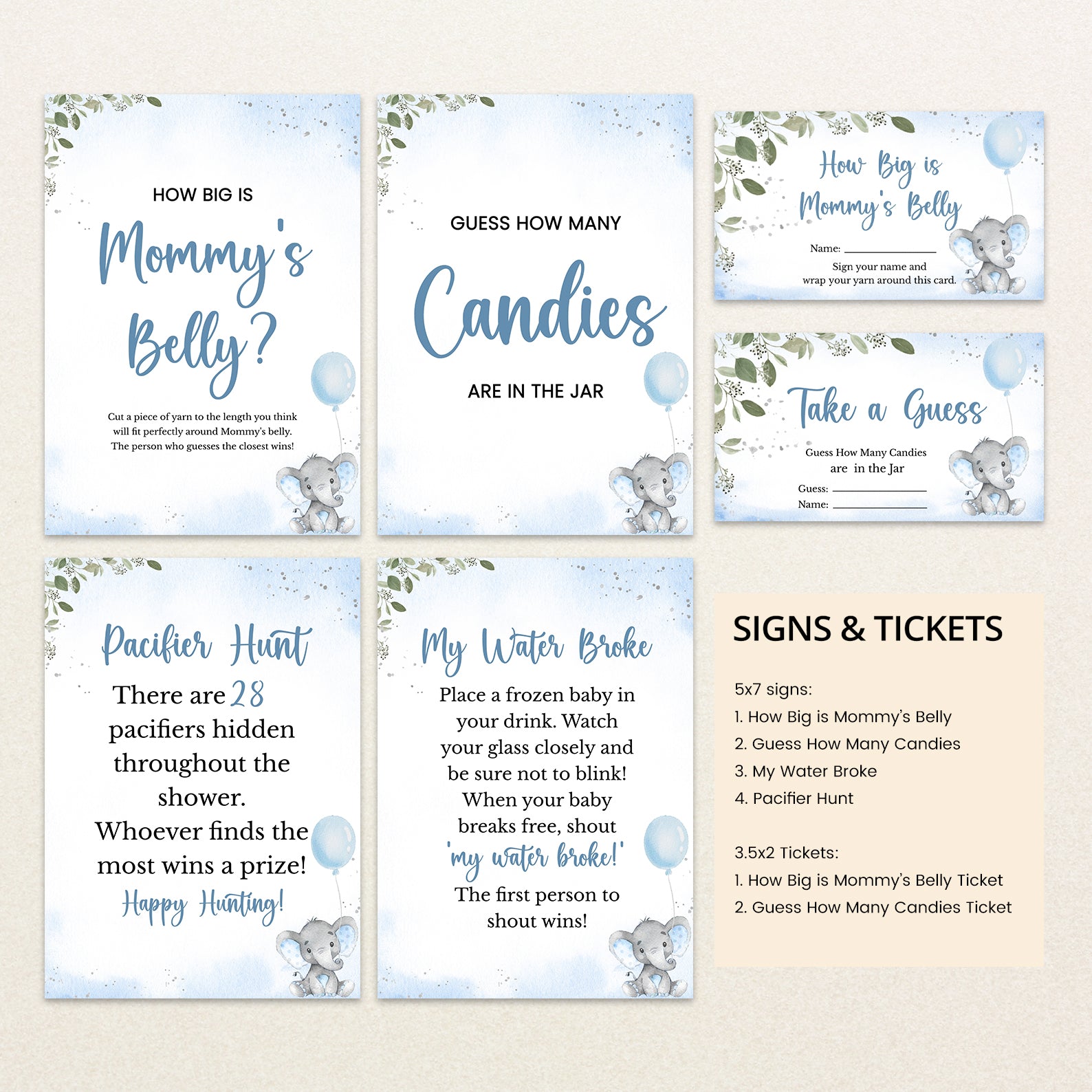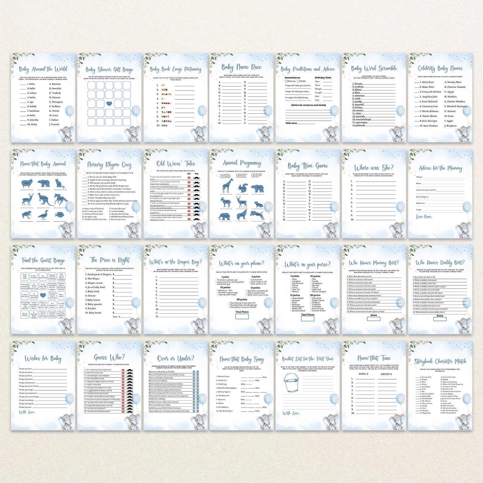 Oh Baby Blue Elephant Baby Shower Game Bundle with Leaves