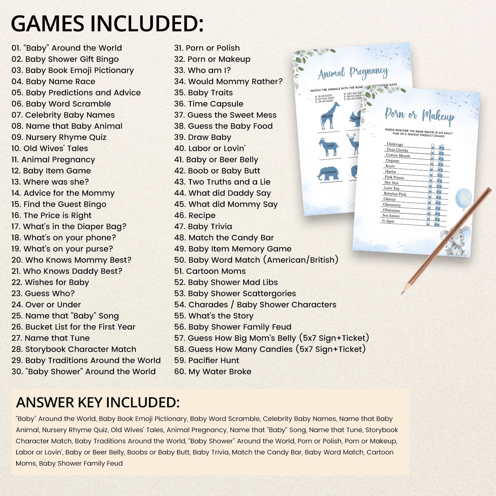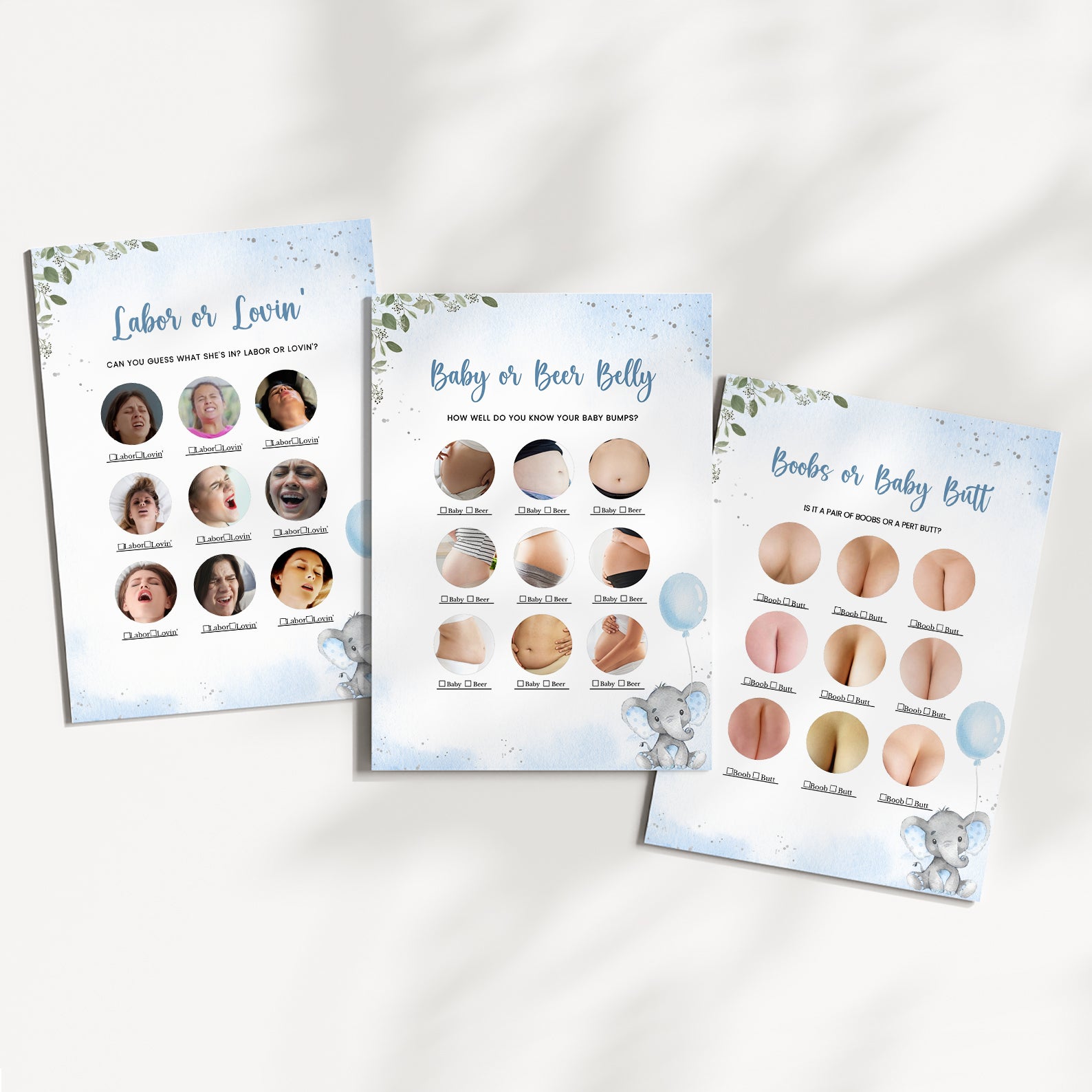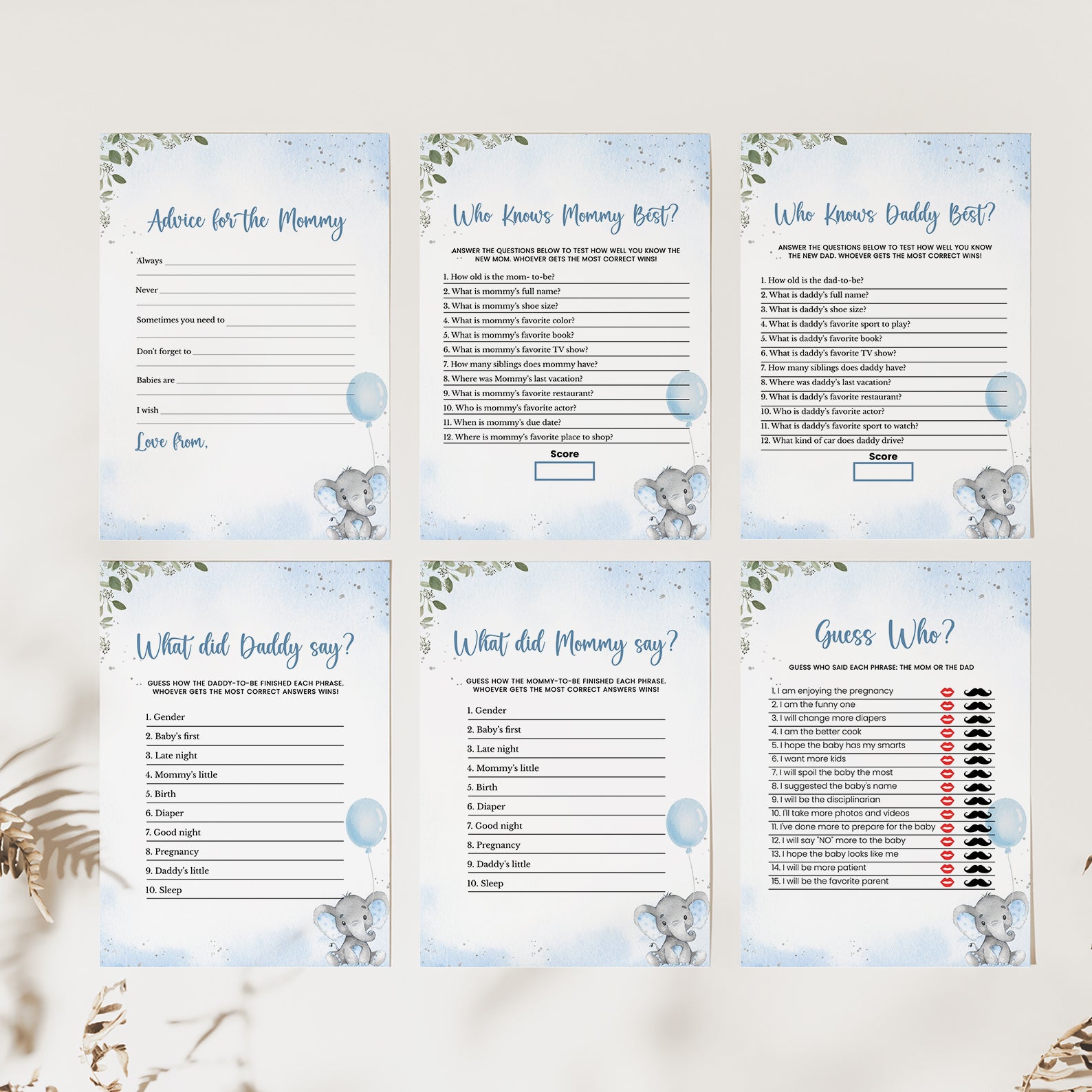 Oh Baby Blue Elephant Baby Shower Game Bundle with Leaves