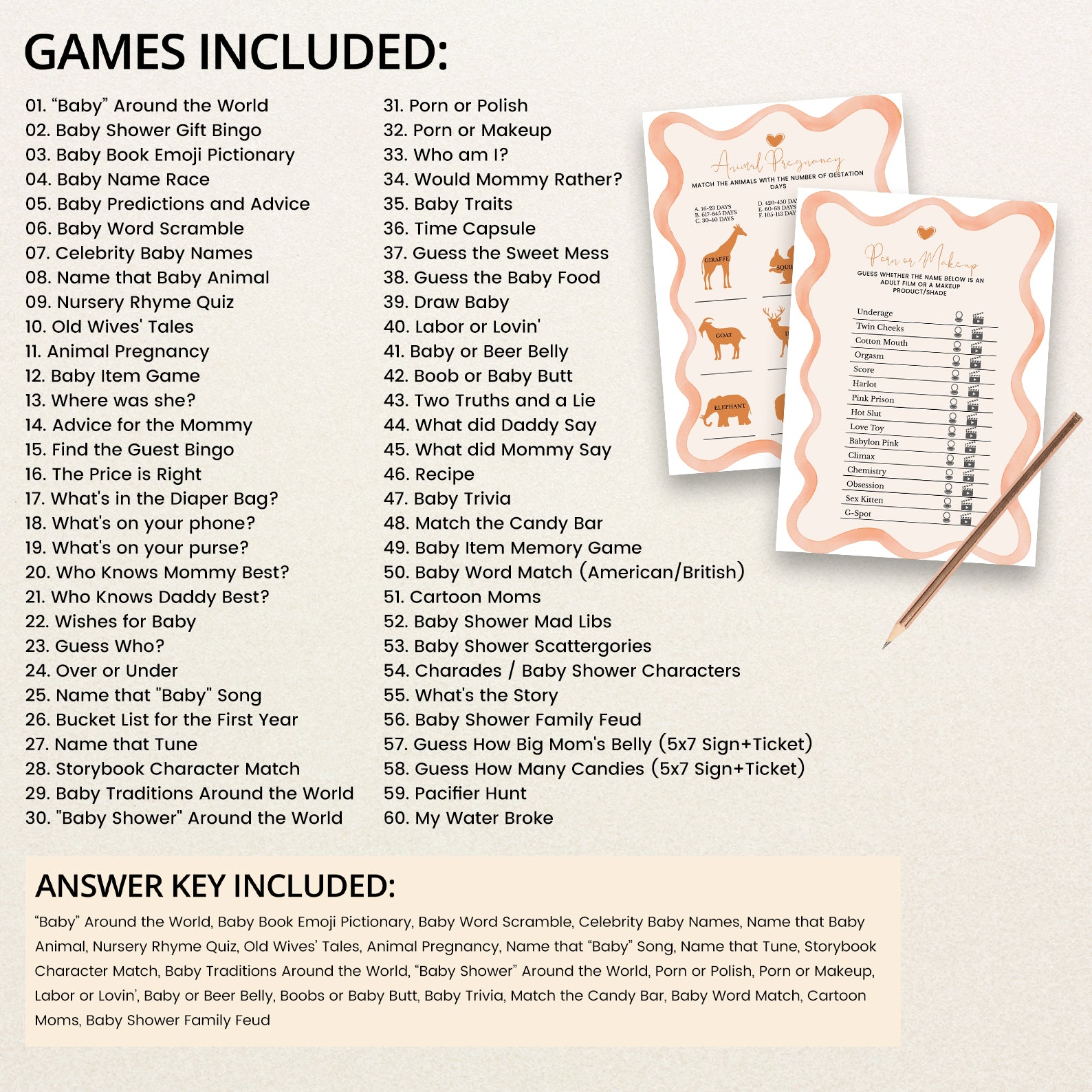 Celebrate your little one's upcoming arrival with our "Orange Delight Baby Shower" Game Bundle! Featuring a cheerful orange theme and a playful wavy border, this bundle includes 60 fun and engaging games to keep your guests entertained throughout the celebration. The vibrant and whimsical design adds an extra touch of joy to your event, making it perfect for a lively and memorable baby shower. Customizable and easy to share, this game bundle ensures your baby shower is filled with excitement and laughter!