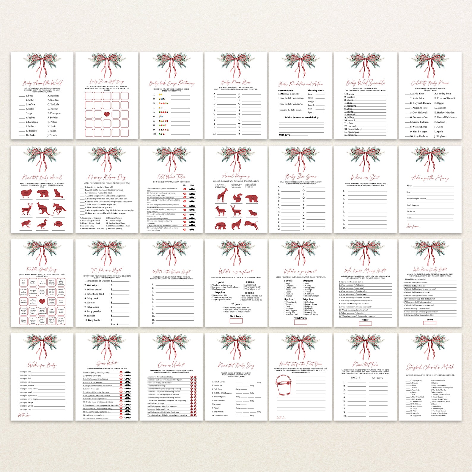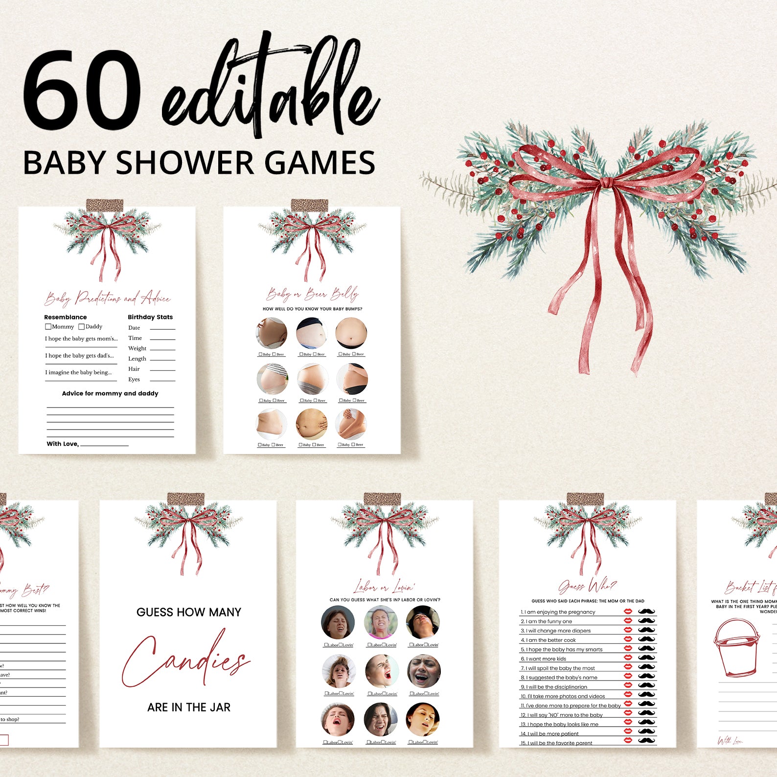 Keep guests entertained with our winter baby shower game bundle, featuring 60 editable games in a cozy seasonal theme. The minimalist design showcases a festive red ribbon, green leaves, and berries, adding holiday warmth to your celebration. From fun icebreakers to classic shower favorites, this collection ensures laughter and connection while celebrating your little one’s arrival. Easy to customize, these printable games make hosting stress-free and memorable.