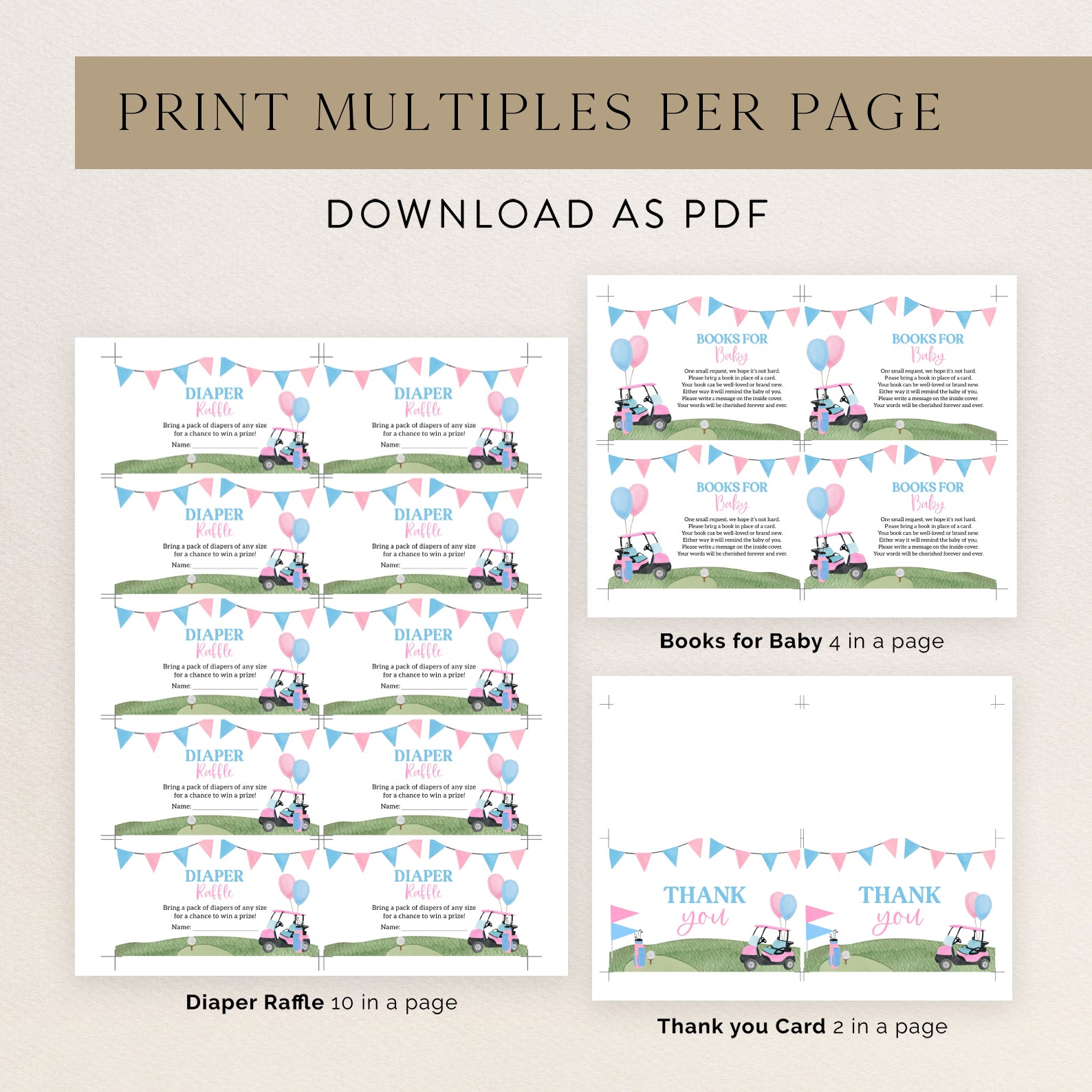 Tee up your celebration with this playful golf-themed gender reveal bundle! Designed with a blue and pink banner, the set includes a digital invitation, mobile invite, diaper raffle card, books for baby insert, and thank you card. Featuring a golf course scene with flags, a golf bag, and balloon-filled cart, it’s a fun and stylish way to share your big reveal with loved ones.