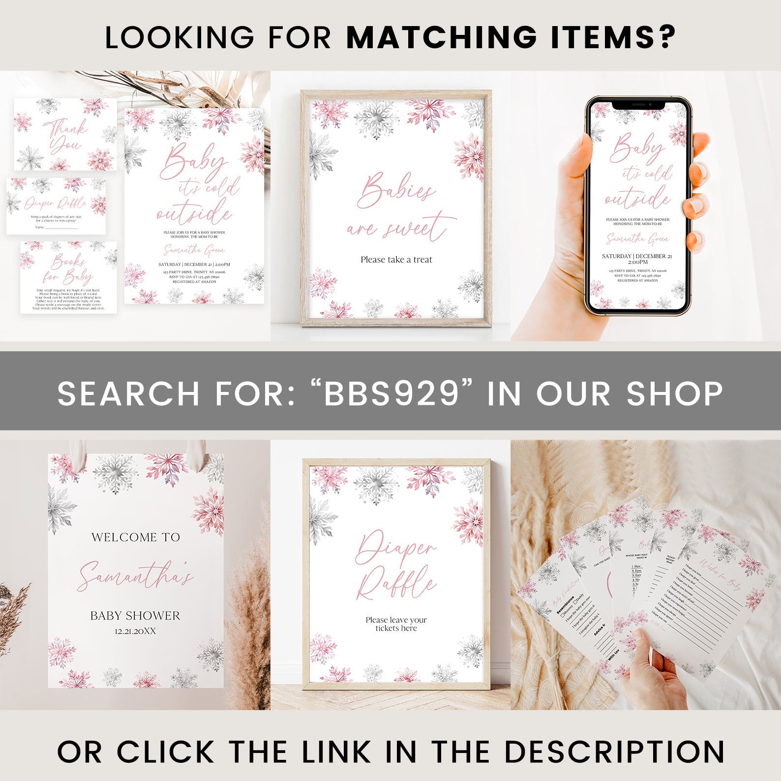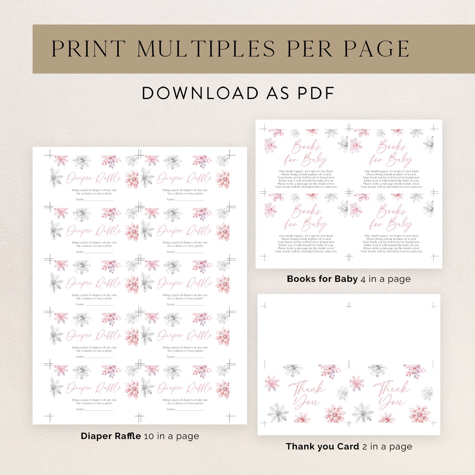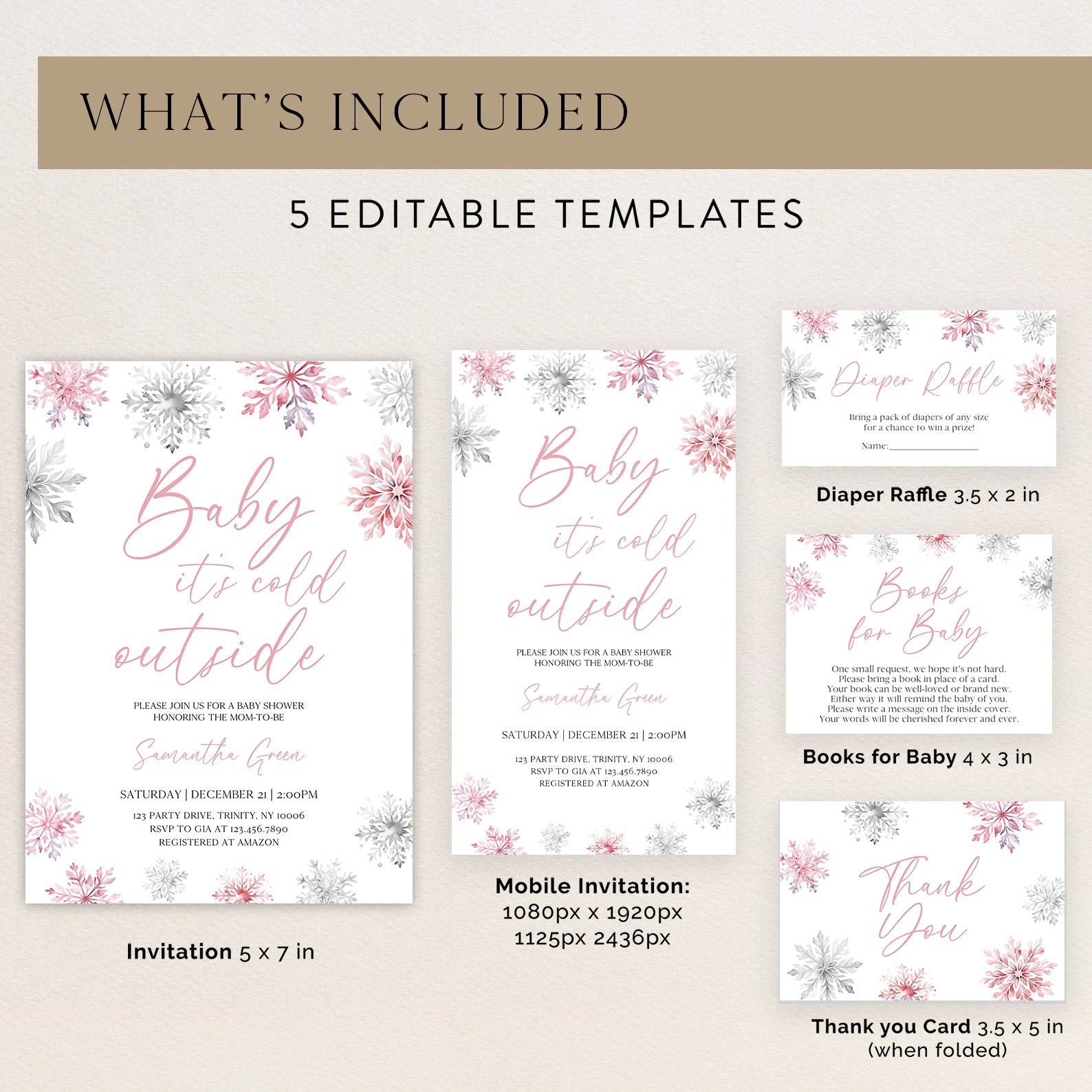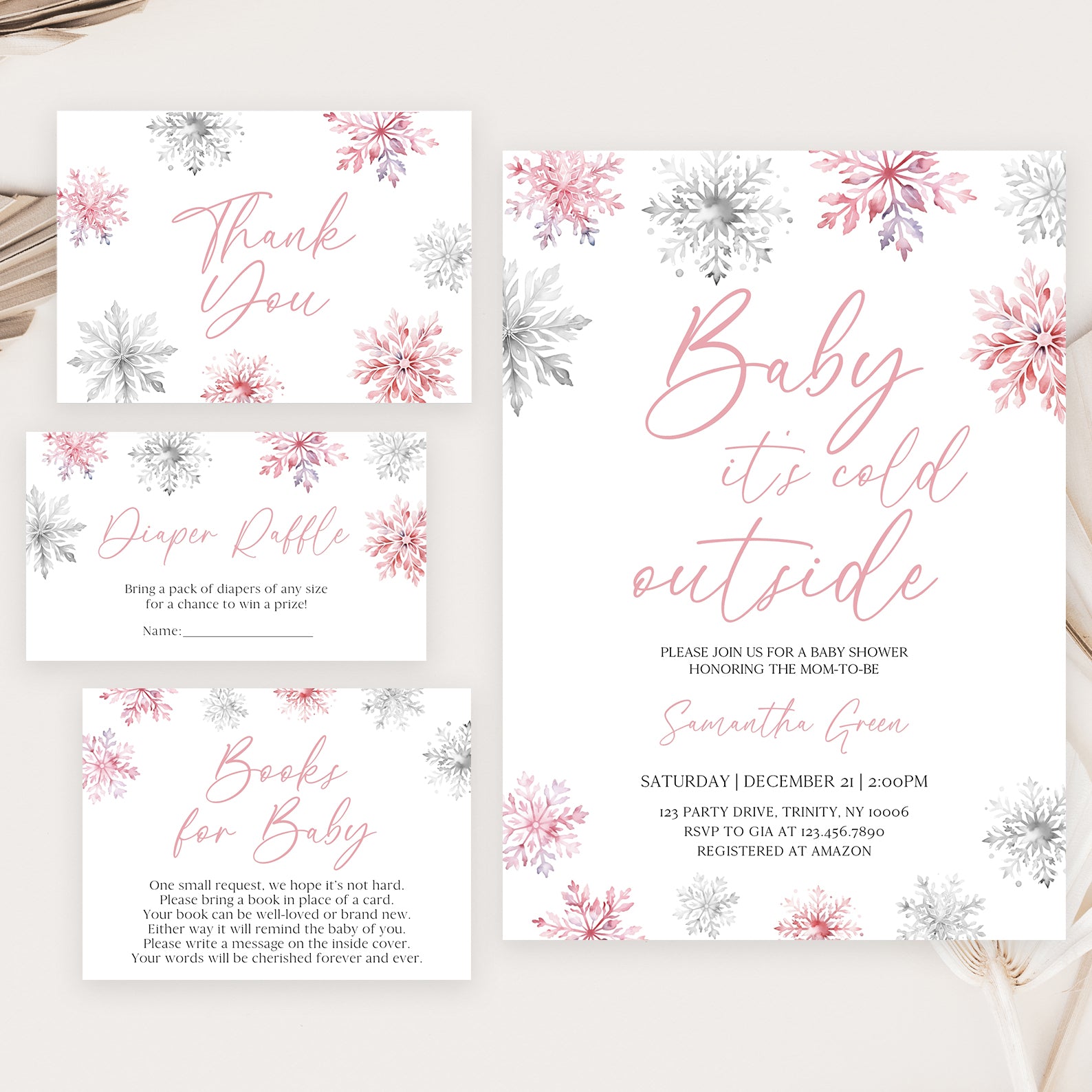 Celebrate new beginnings with our winter baby shower bundle. This set includes a digital invitation, mobile invite, diaper raffle, books for baby cards, and thank you cards, all featuring a pink and silver snowflake design with a 'Baby, It's Cold Outside' theme. Ideal for a cozy, joyful gathering.