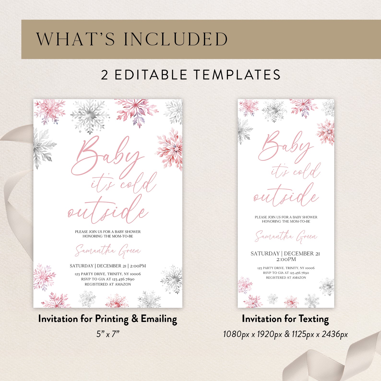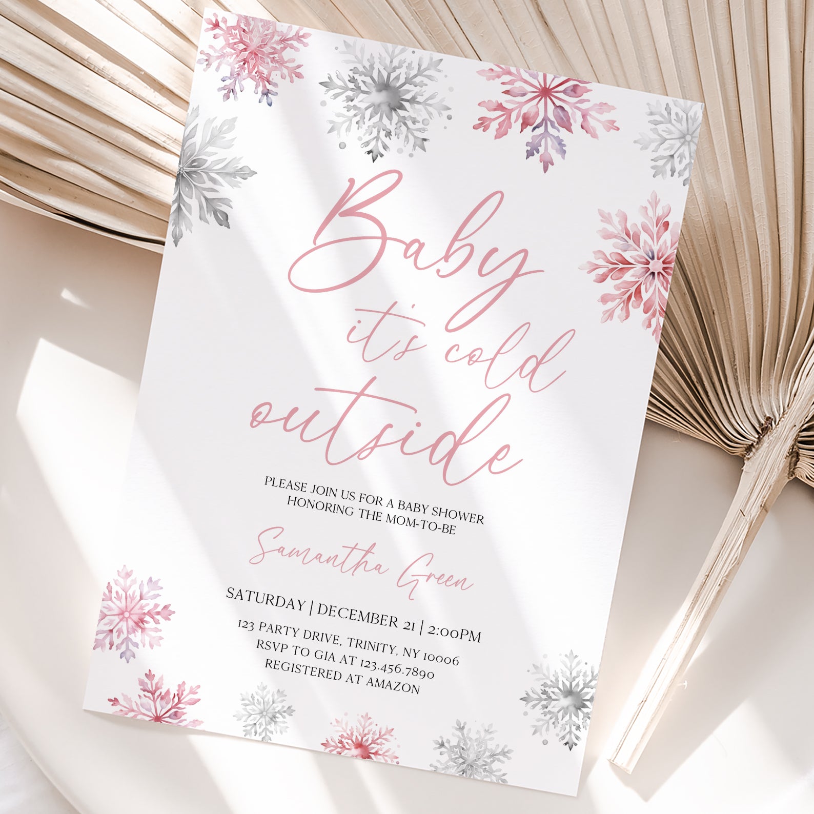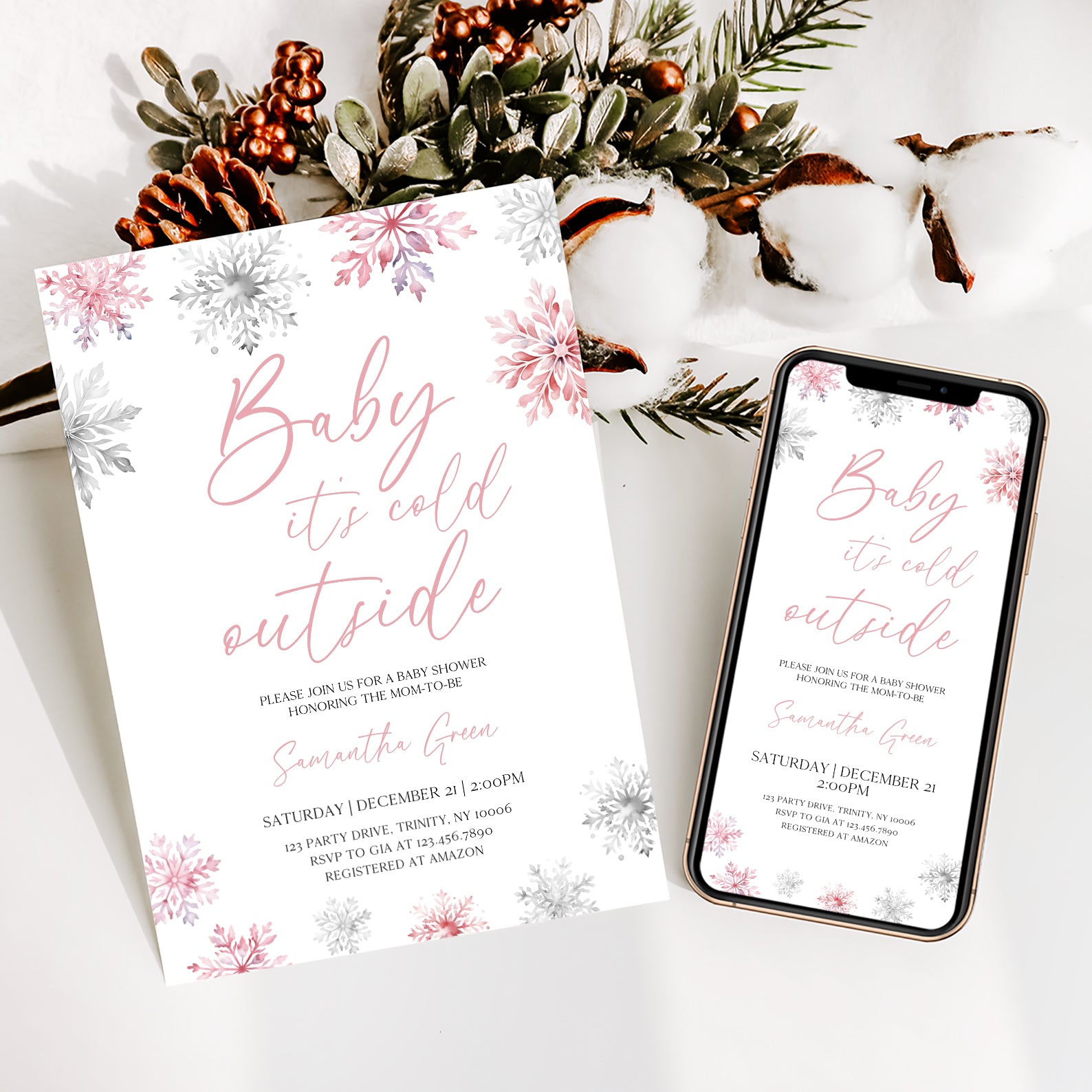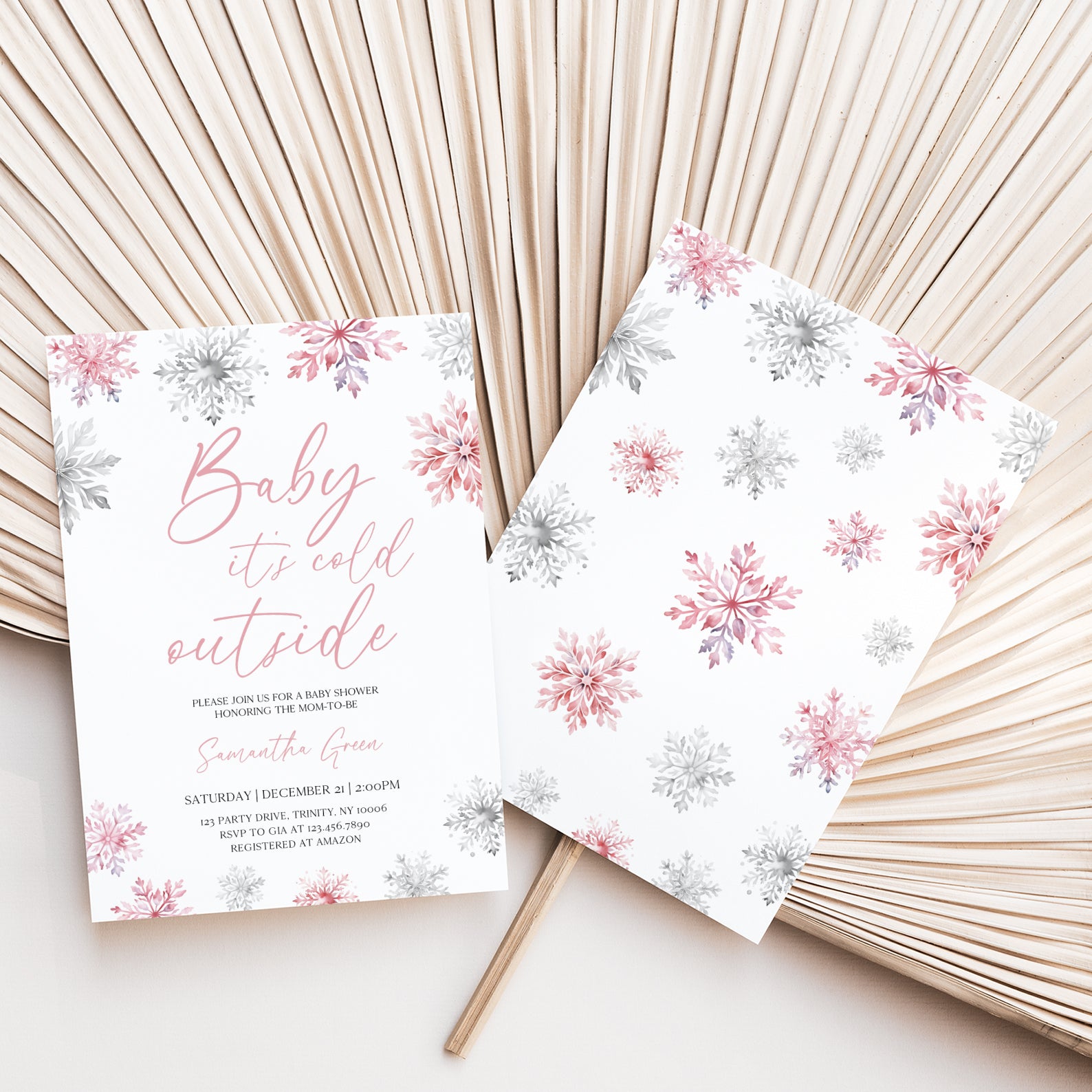 - Purchase this Pink Baby It's Cold Outside Winter Invite Bundle with Snowflakes template