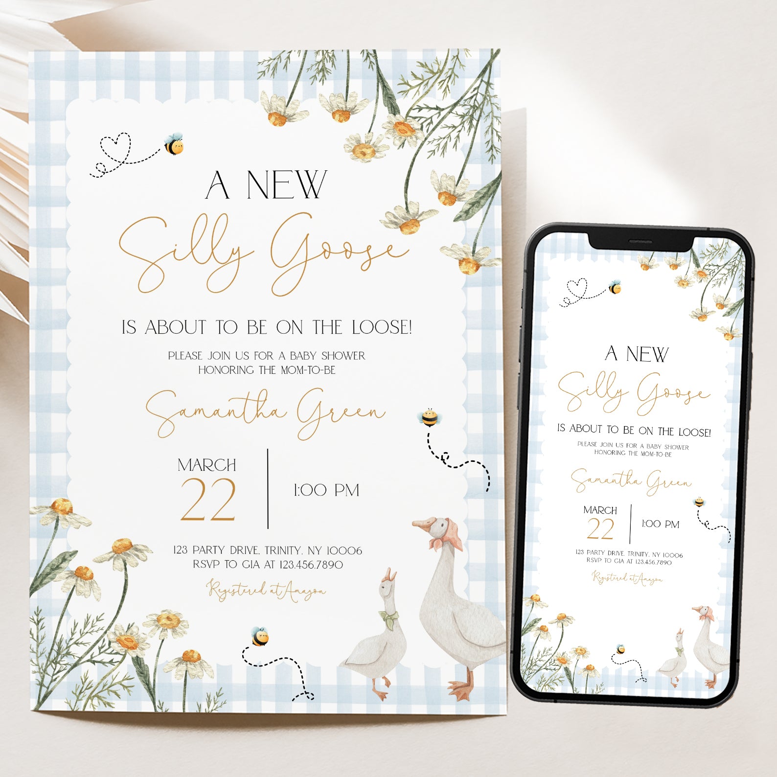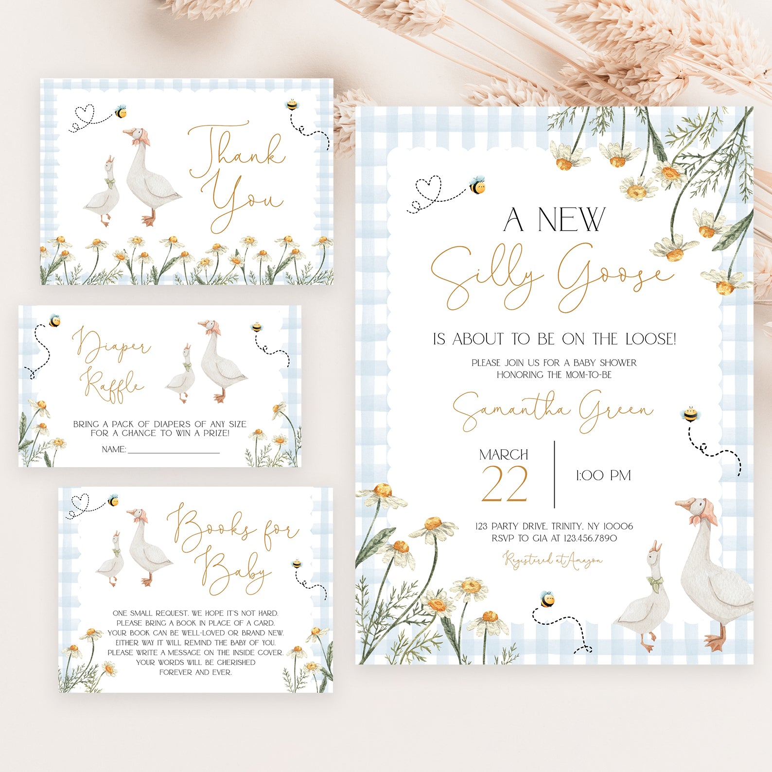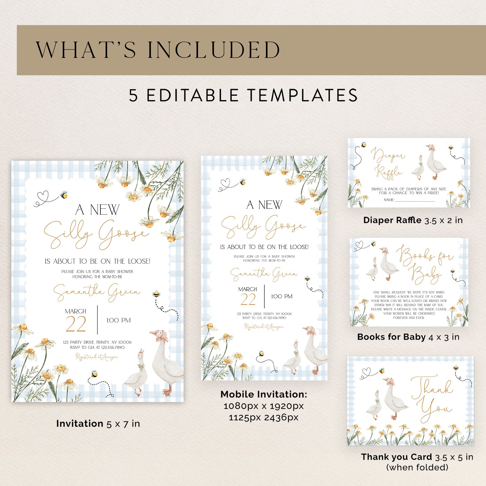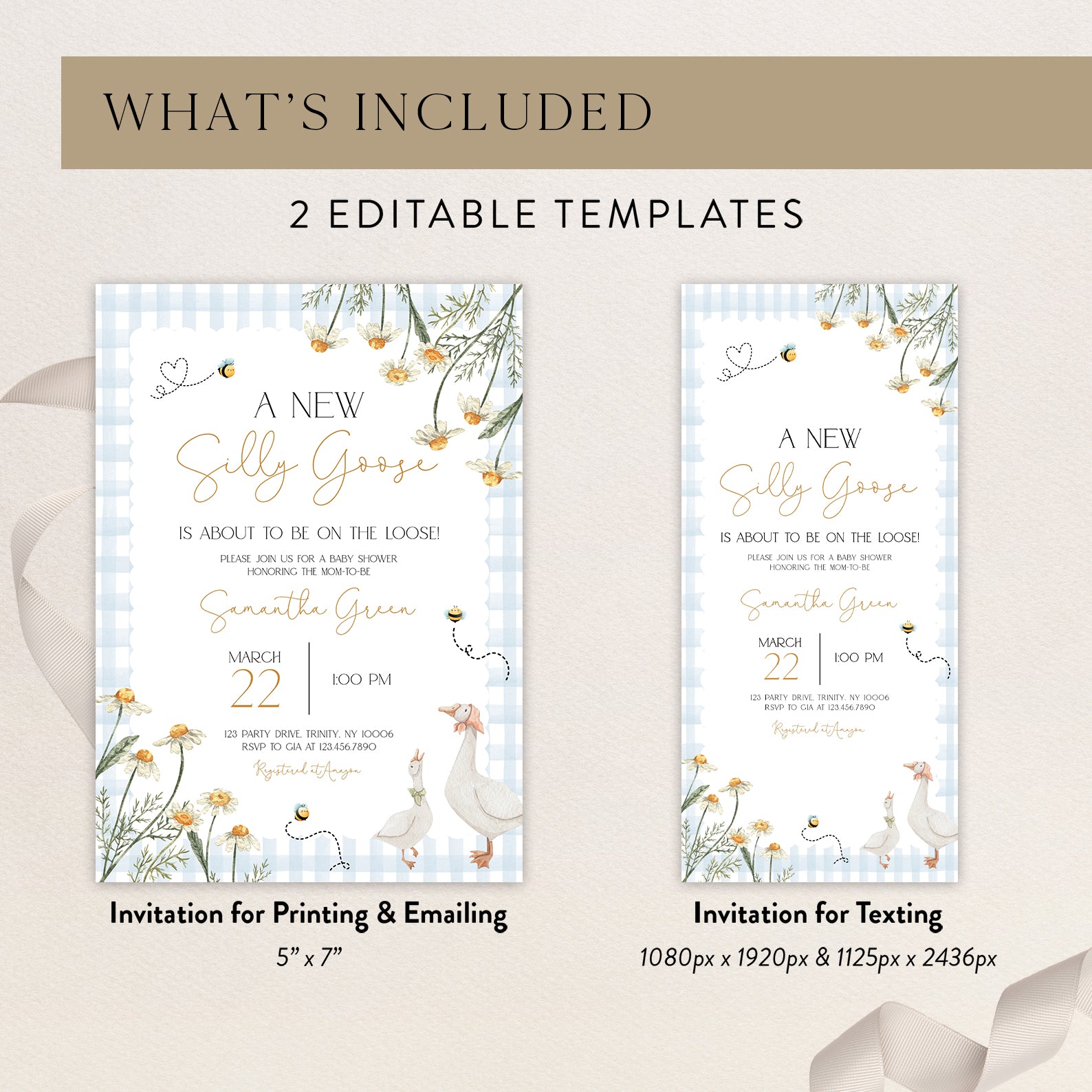 - Purchase this Silly Goose Baby Shower Invitation Bundle with Chamomile & Bees template