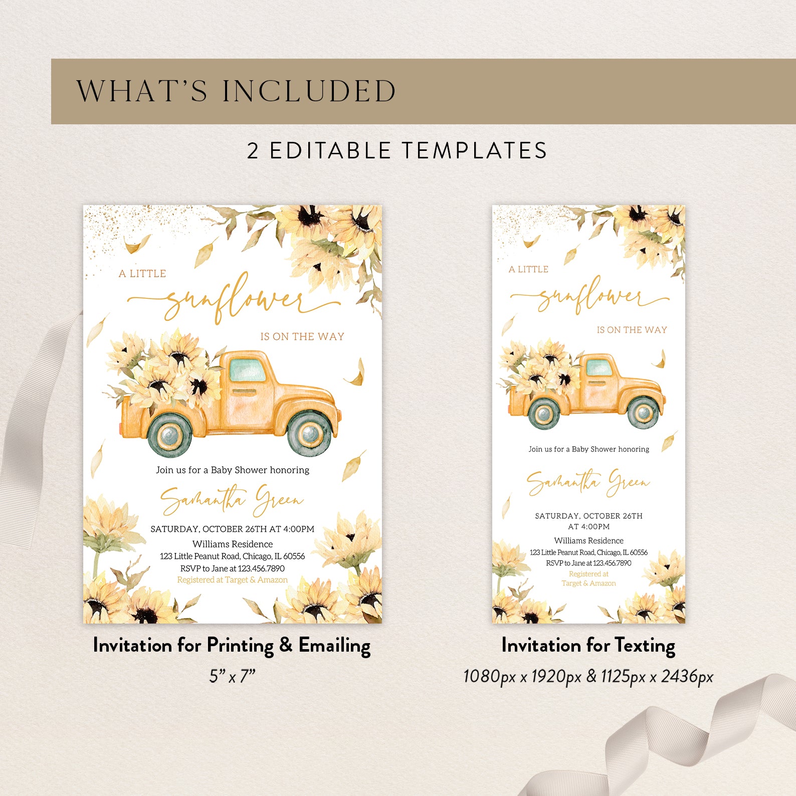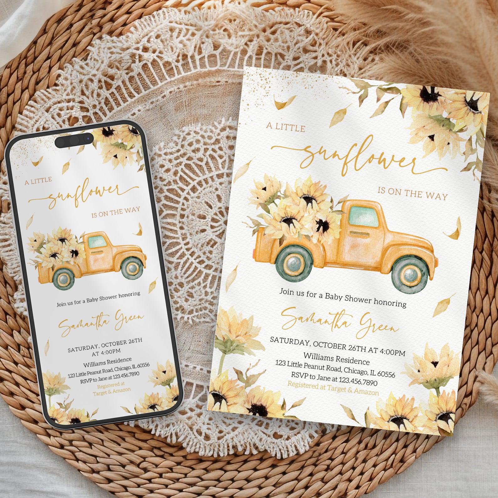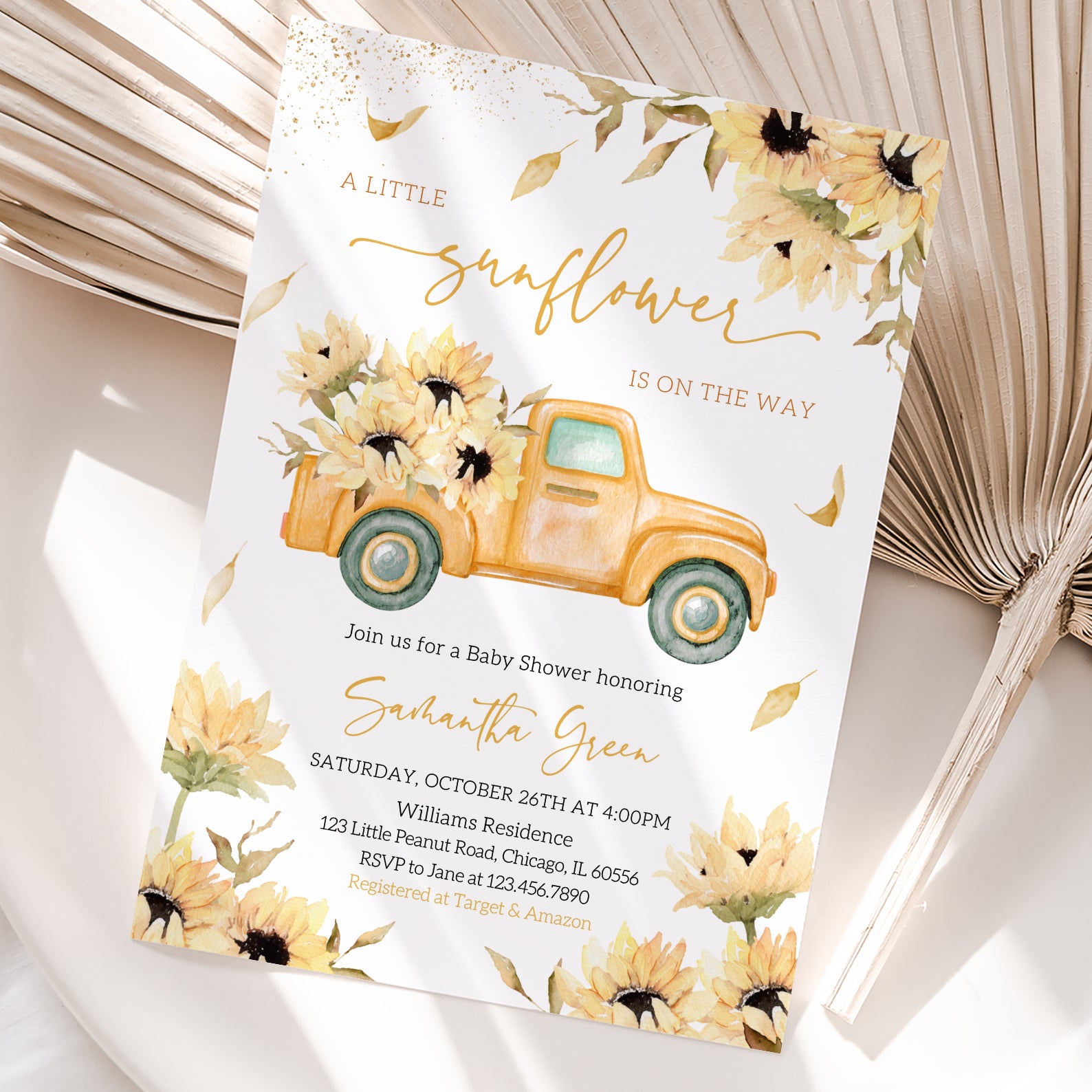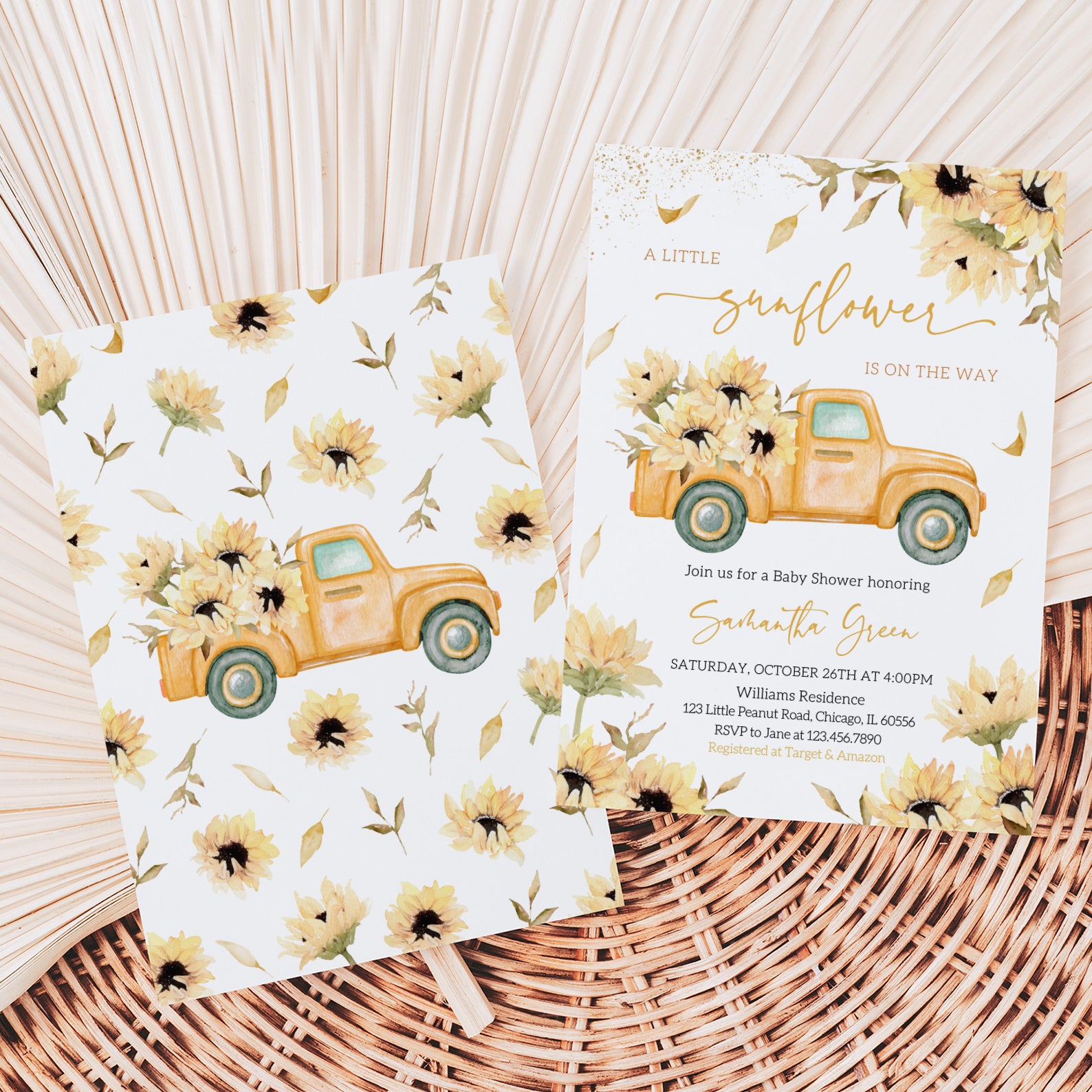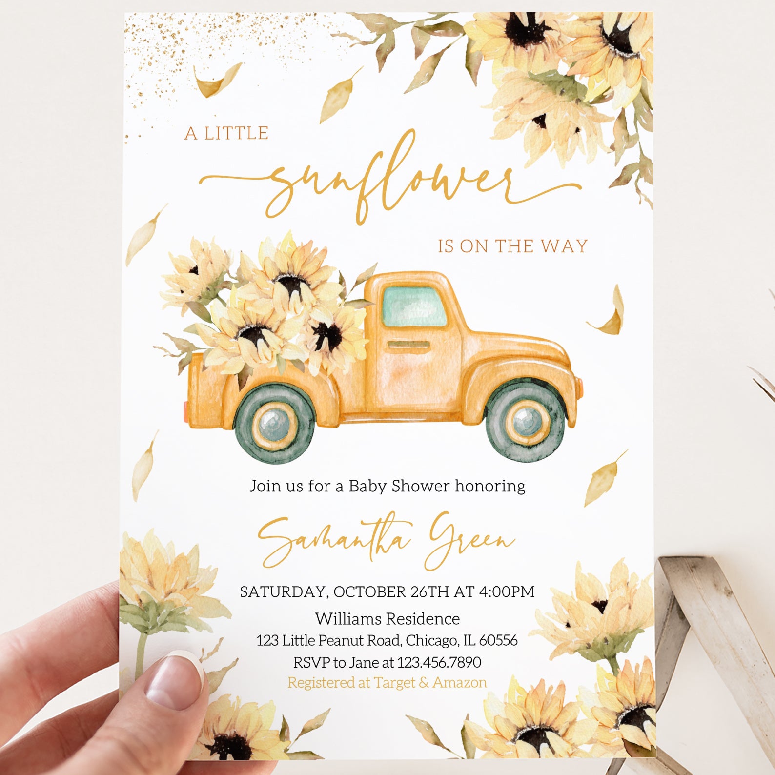 - Purchase this A Little Sunflower is on the Way’ Yellow Fall Baby Invite template