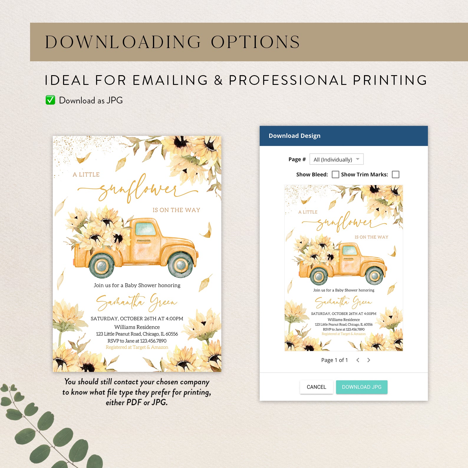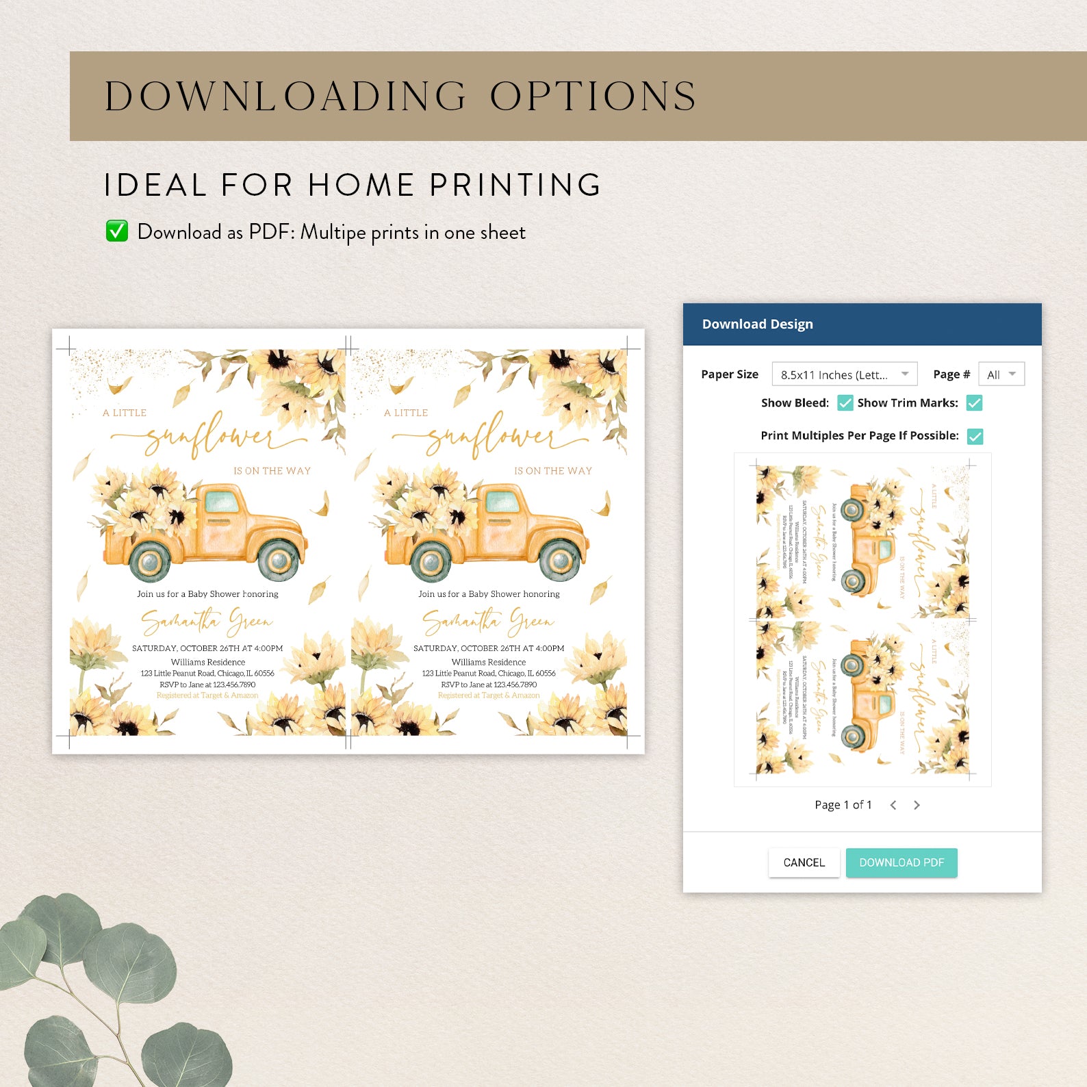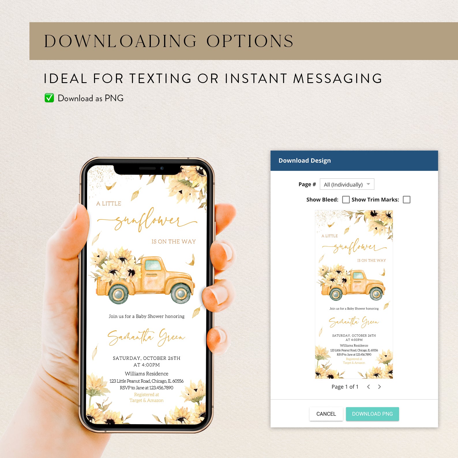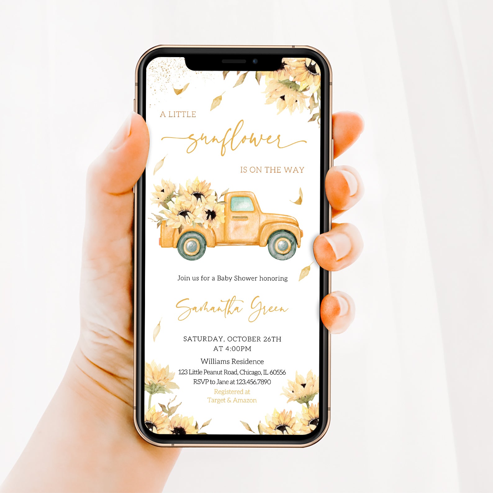 Celebrate the upcoming arrival of your little one with our charming fall baby shower digital invitation, beautifully designed in a sunny yellow theme. Featuring delightful gold accents and a whimsical sunflower motif, this invitation showcases an adorable orange pickup truck brimming with vibrant sunflowers at its center. The design is completed with lovely sunflowers adorning the corners, making it the perfect way to invite friends and family to share in your joyous occasion.