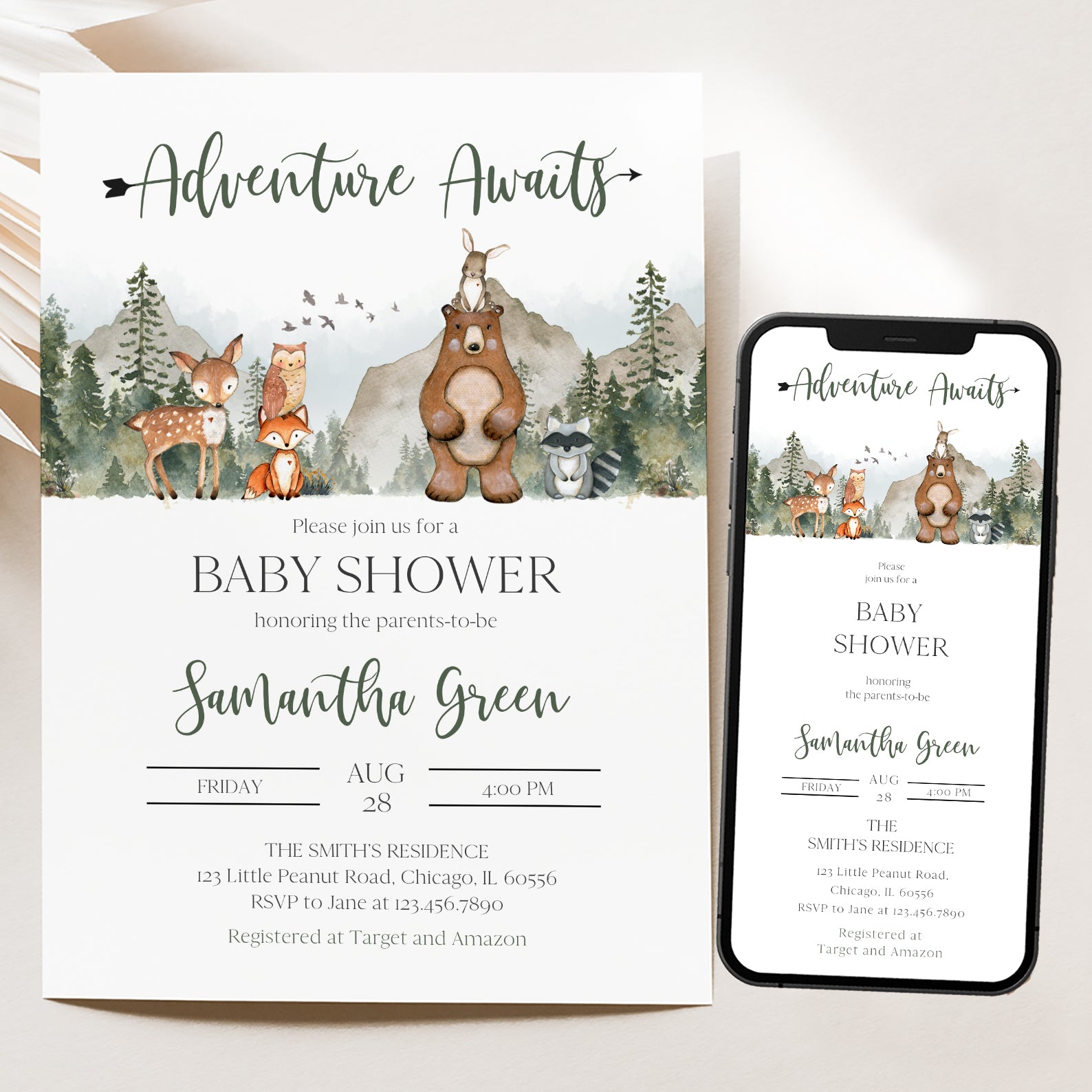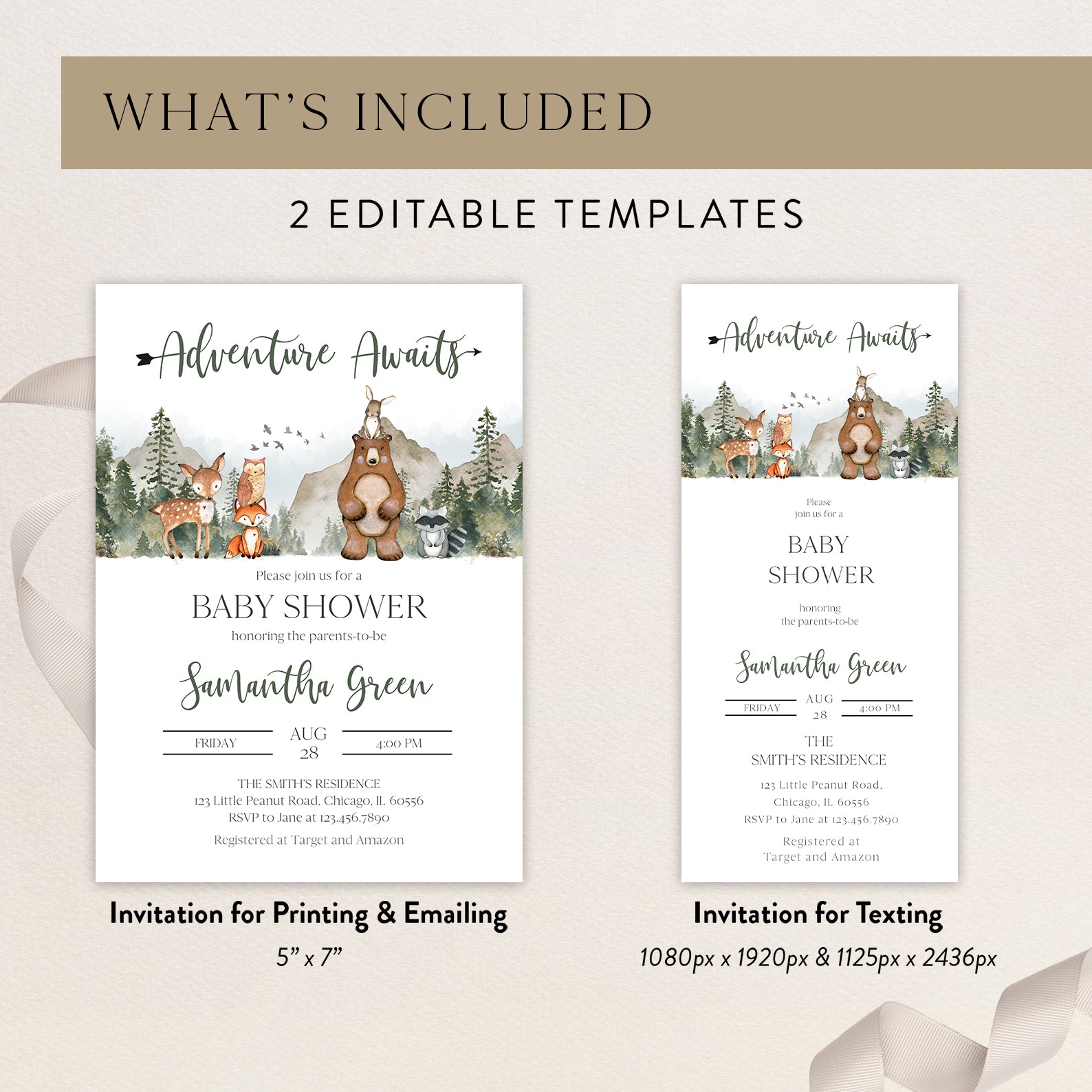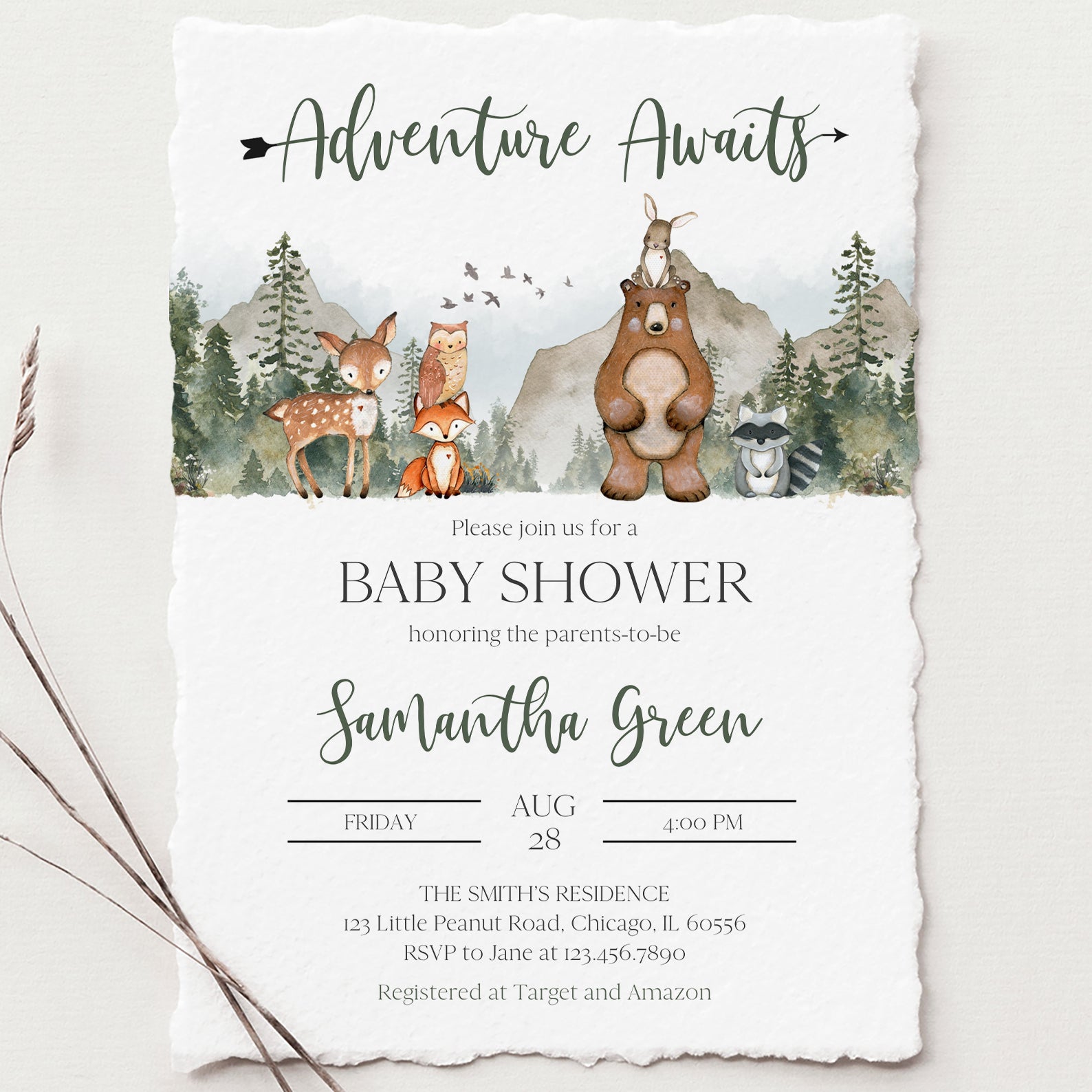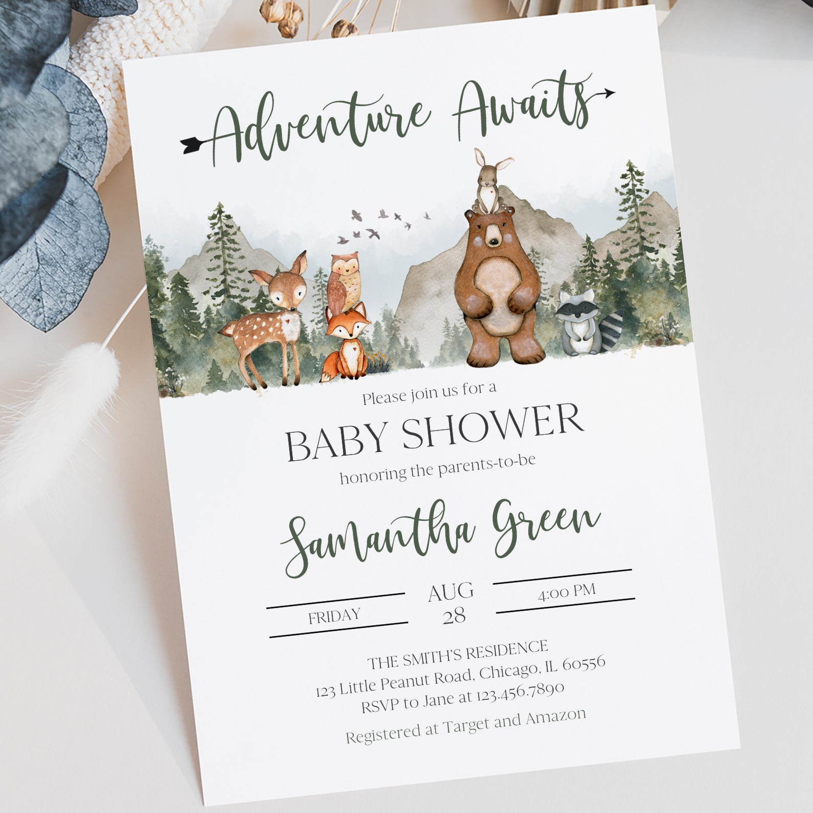 - Purchase this Adventure Awaits Baby Shower Invite with Woodland Animals template