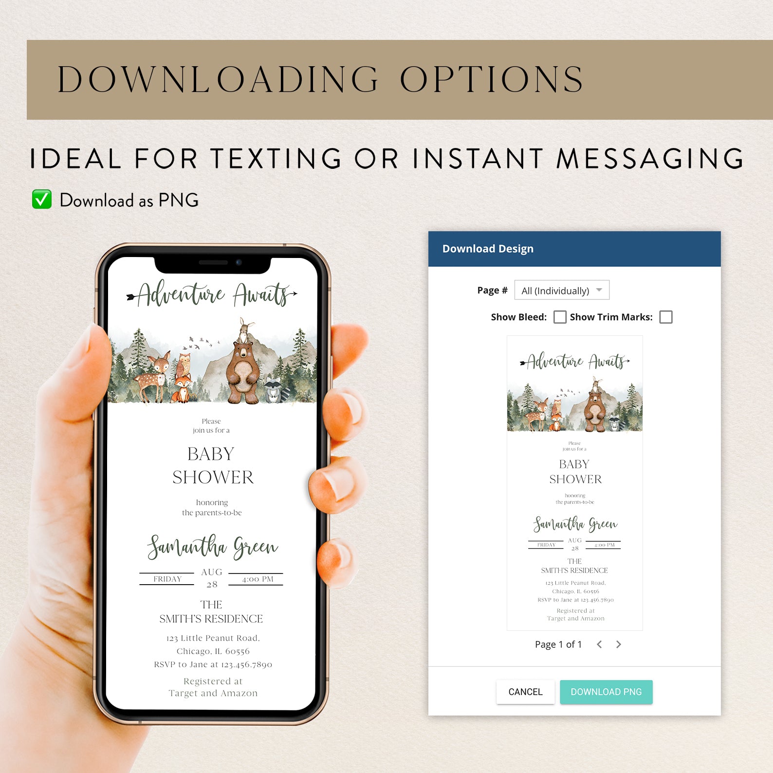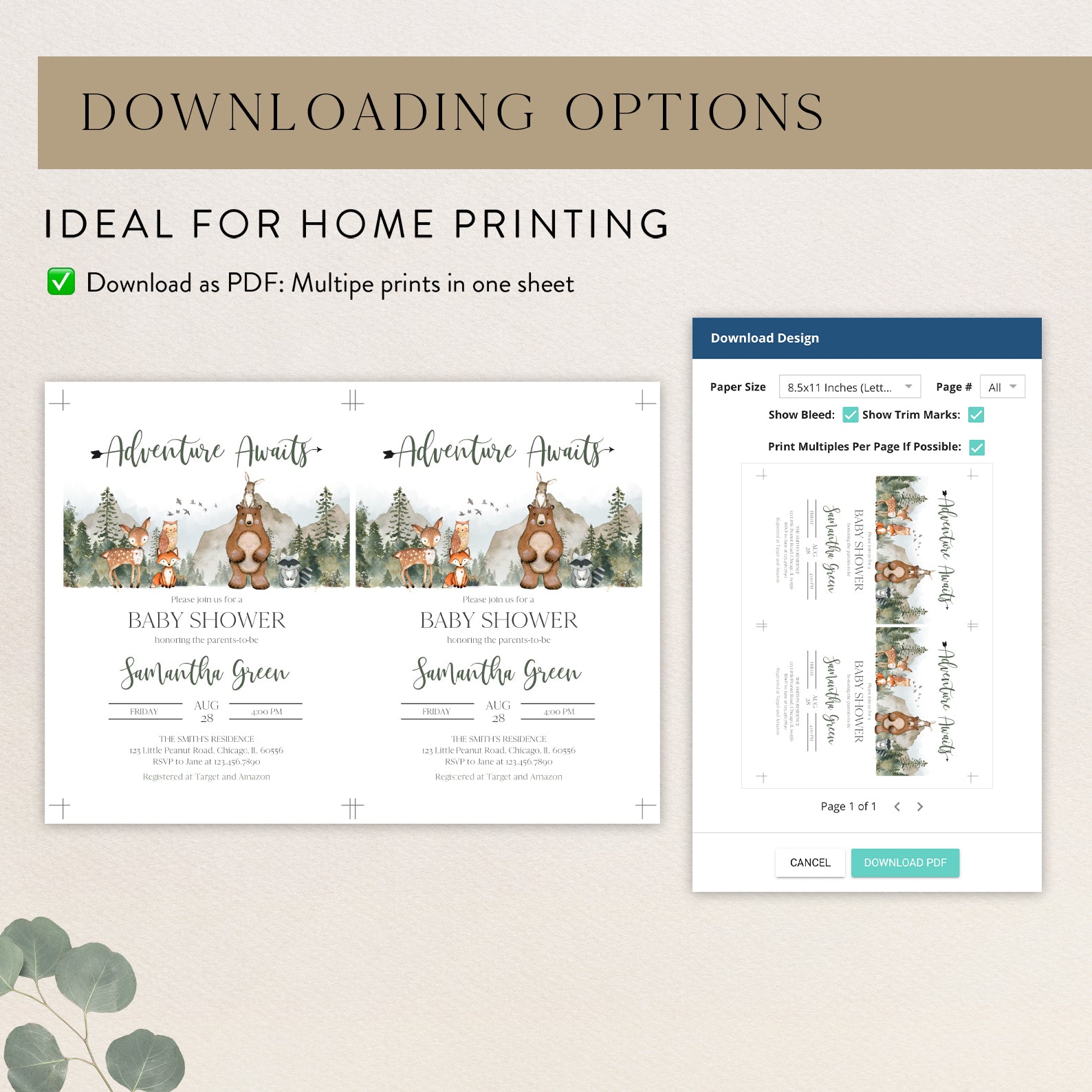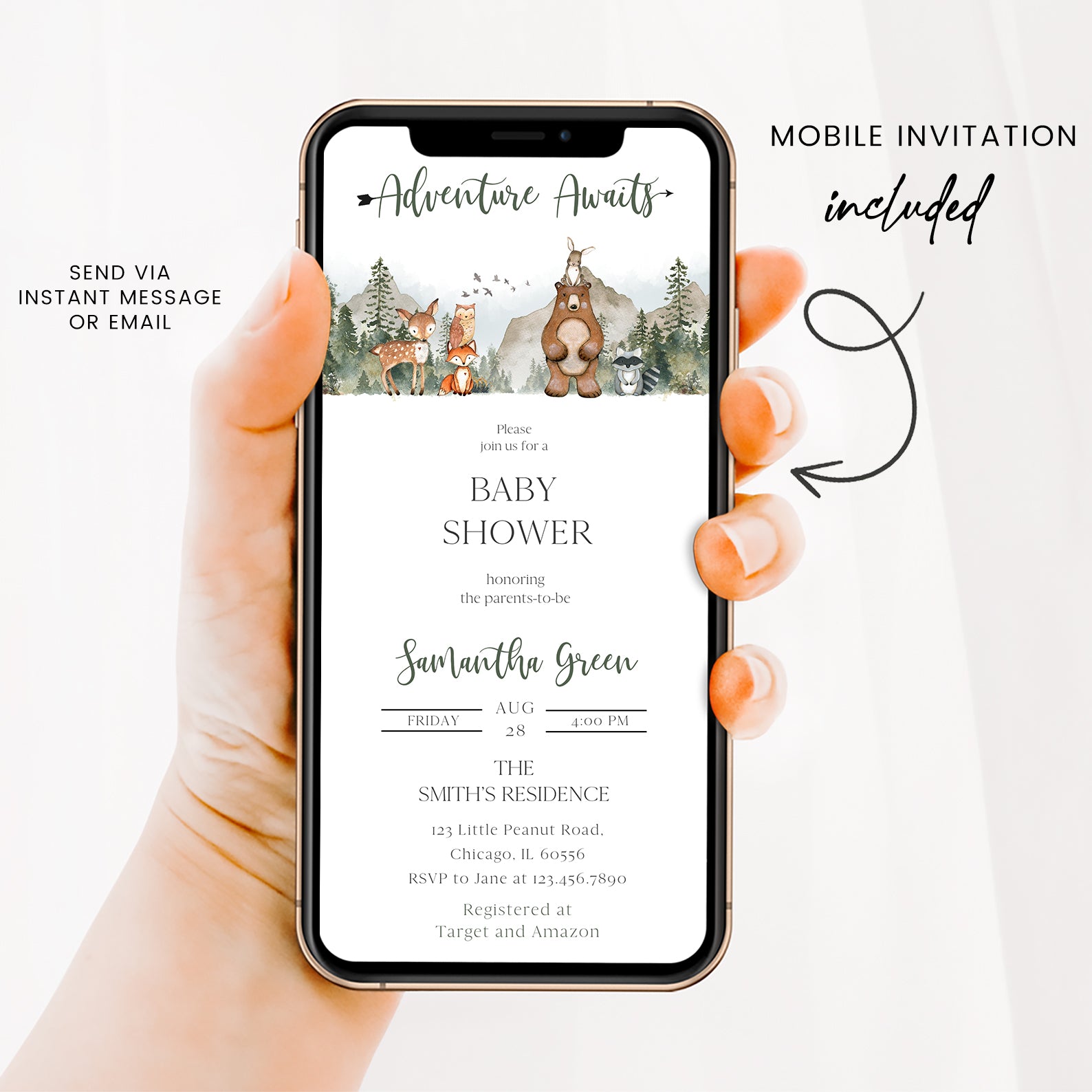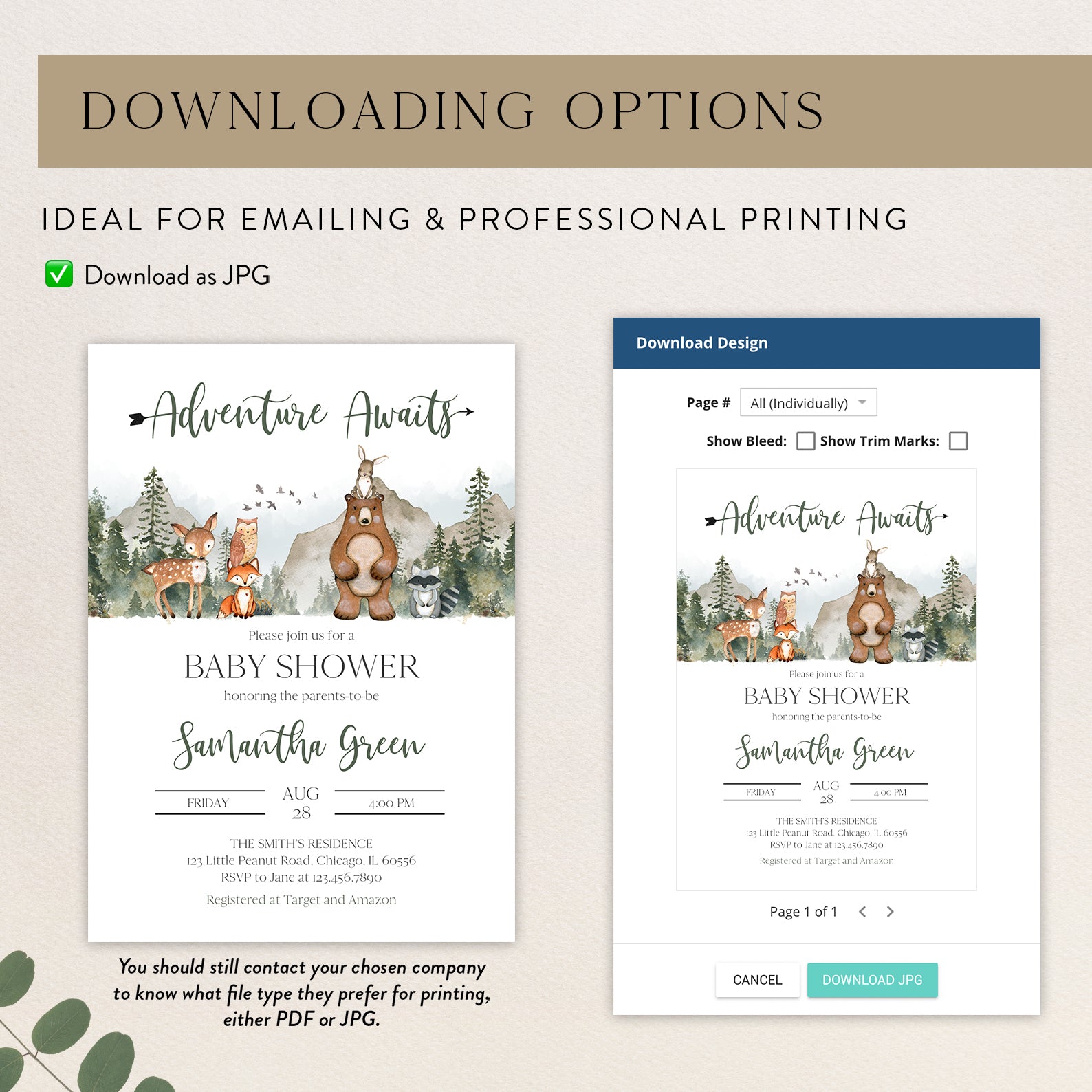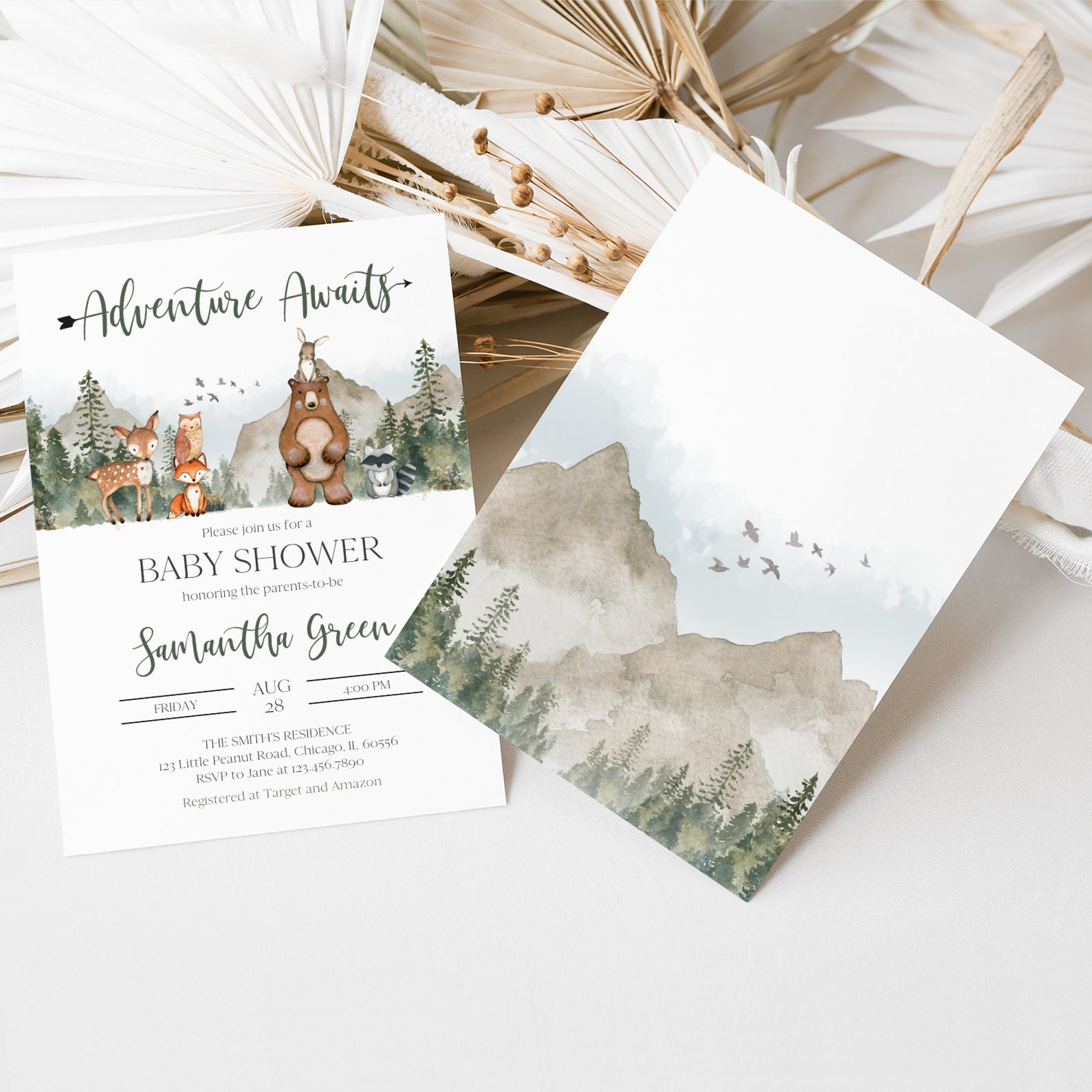 - Purchase this Adventure Awaits Baby Shower Invite with Woodland Animals template