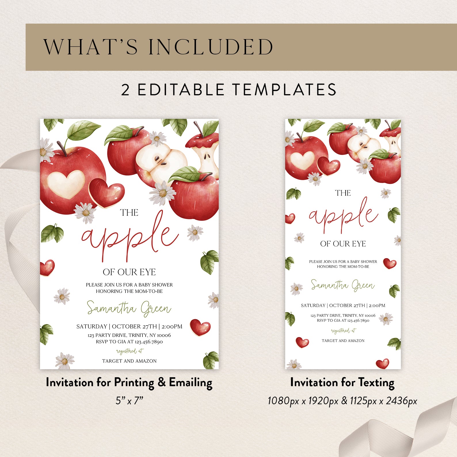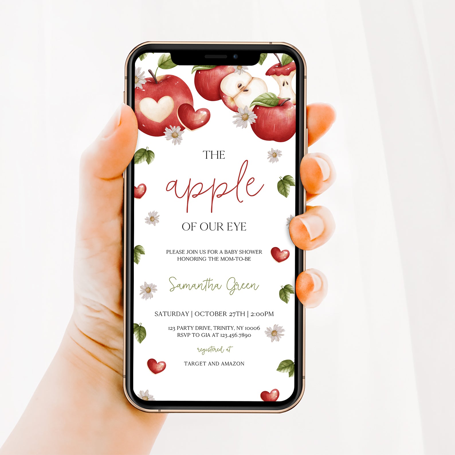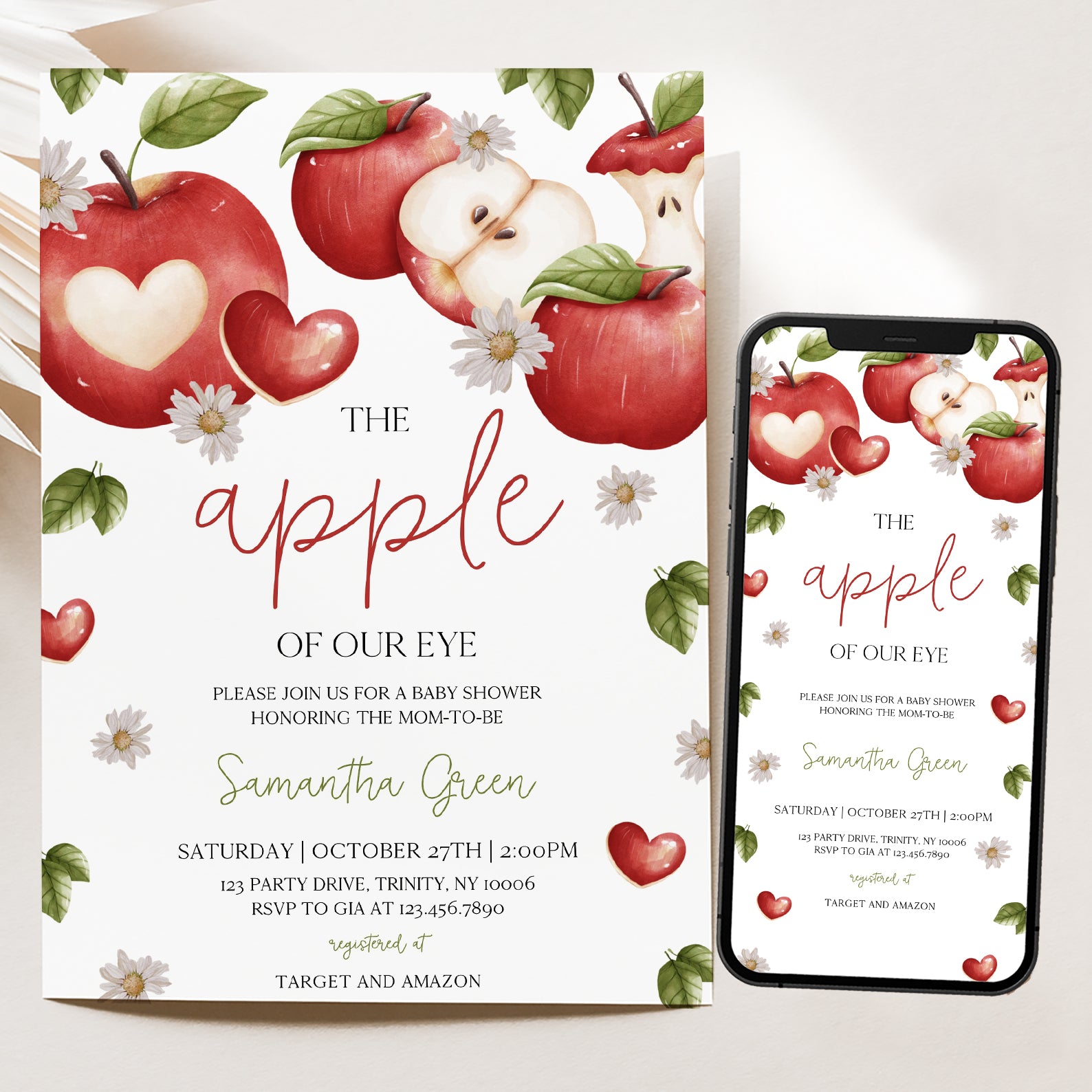 Welcome the upcoming arrival of your little one with our delightful fall baby shower digital invitation, "Apple of Our Eye." This charming design features vibrant red apples adorned with delicate white daisies, set against a backdrop of gracefully falling autumn leaves. Perfectly capturing the warmth and joy of the season, this invitation sets the tone for a gathering filled with love and laughter. Make your event unforgettable with this captivating and customizable digital invite that showcases the beauty of fall!
