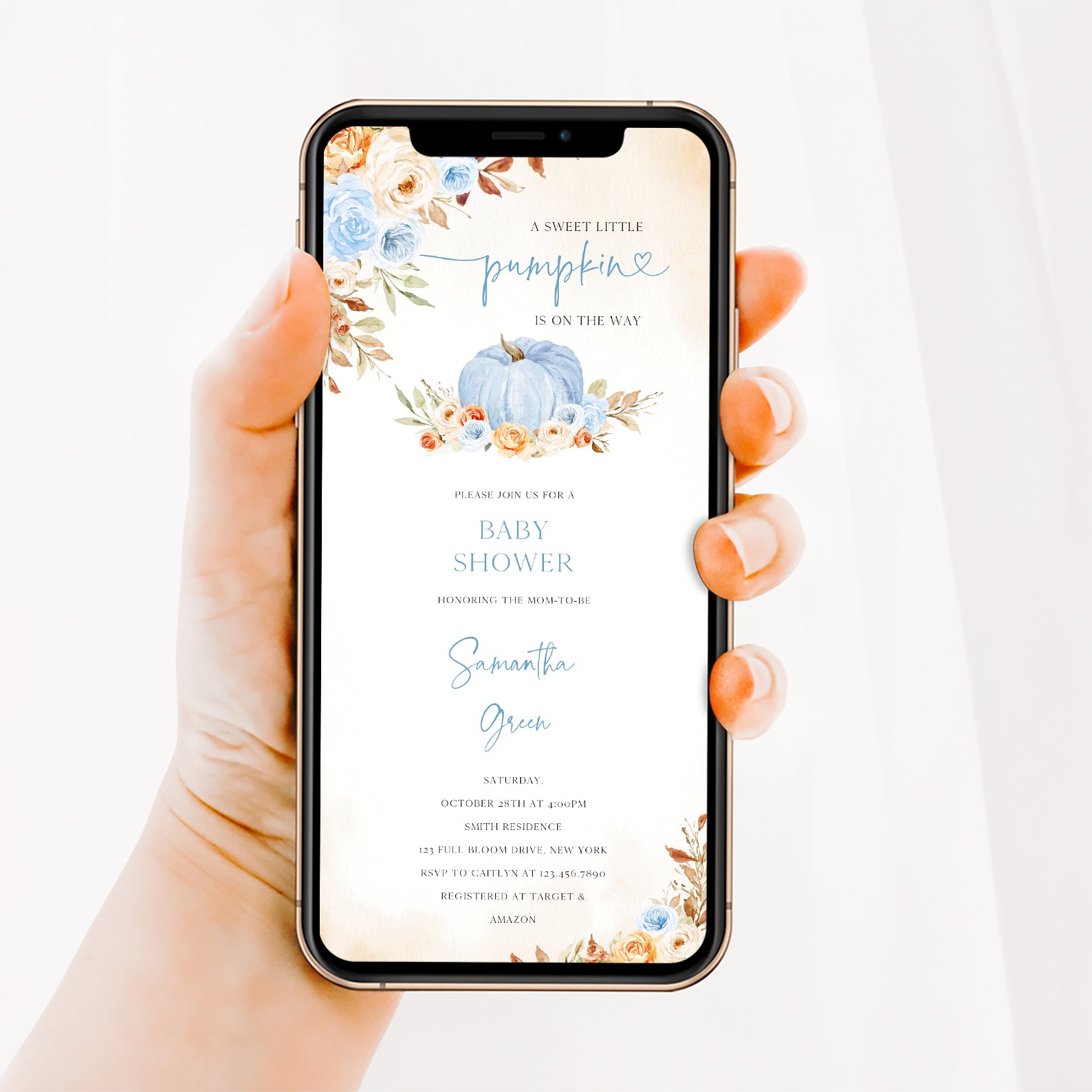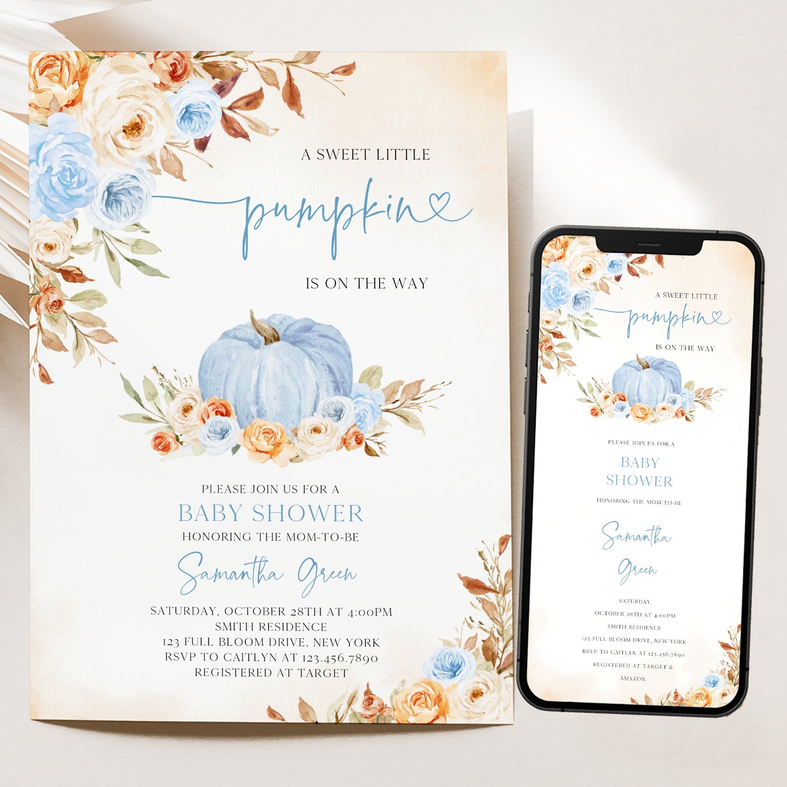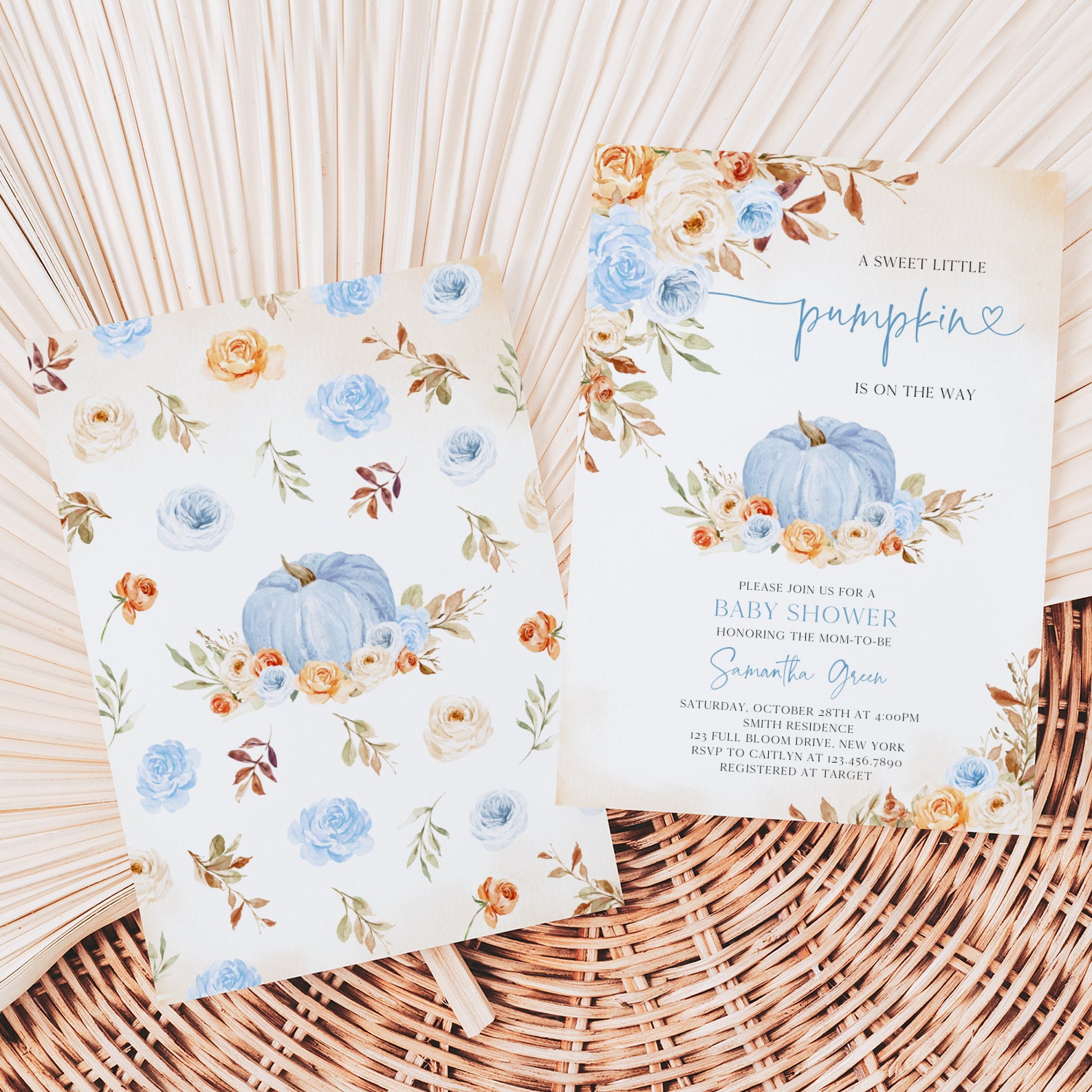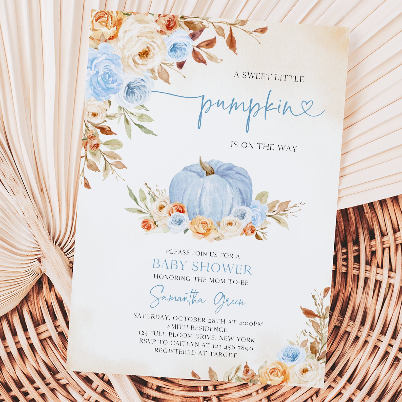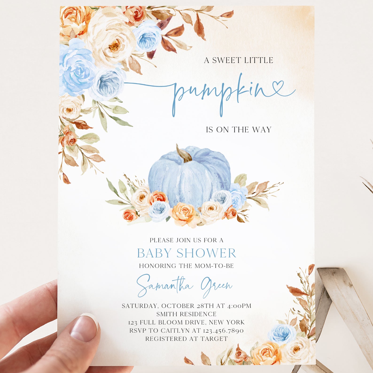 - Purchase this Charming Fall Blue Baby Shower Invitation with Roses & Pumpkins template