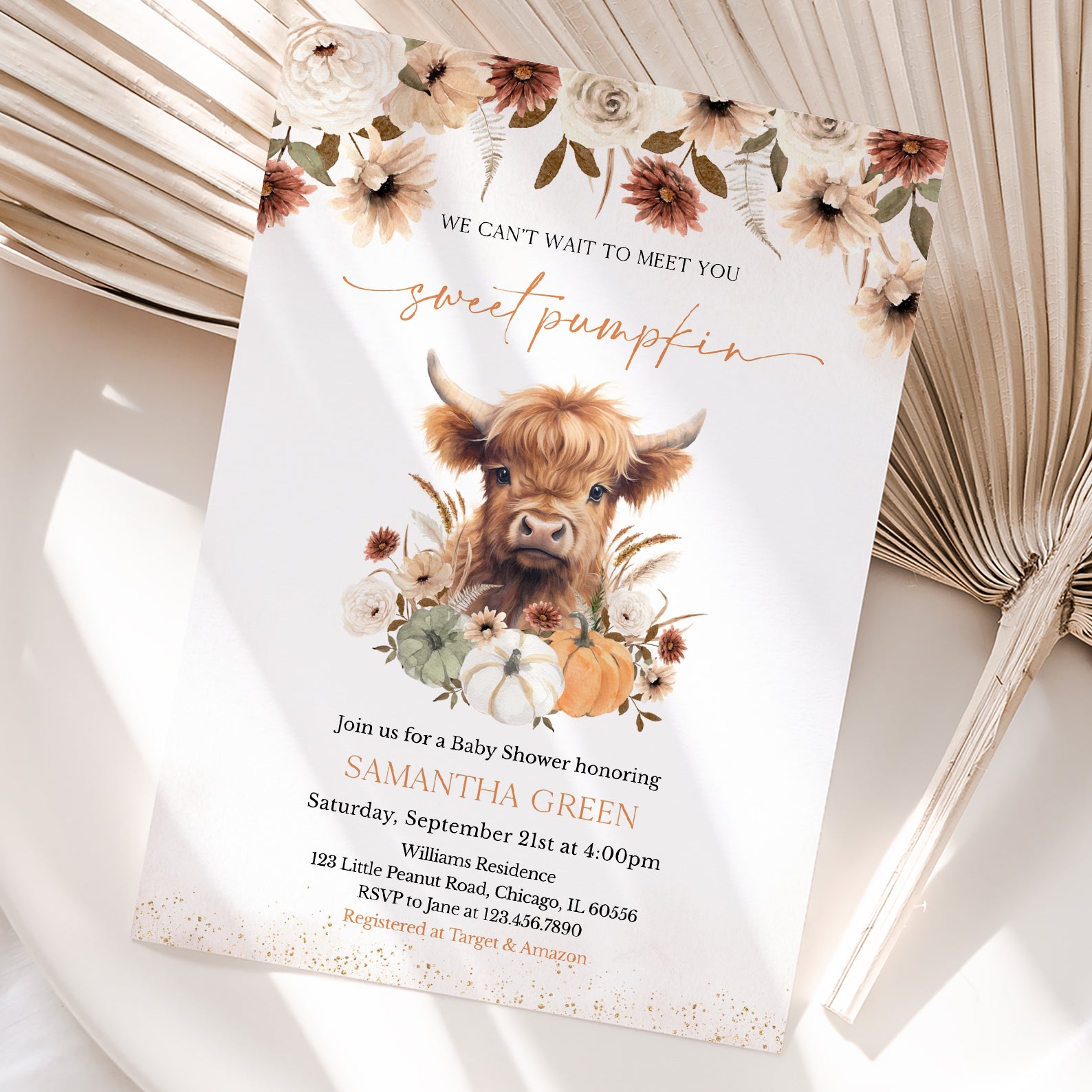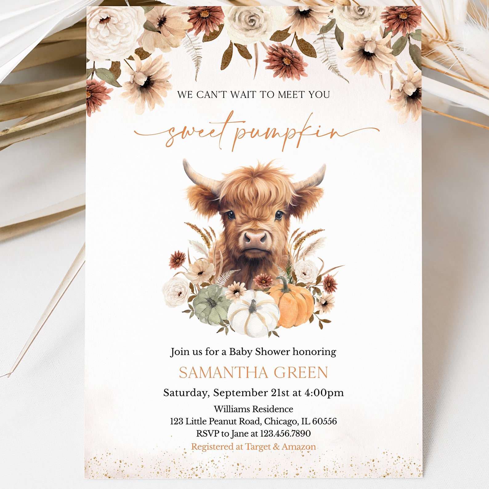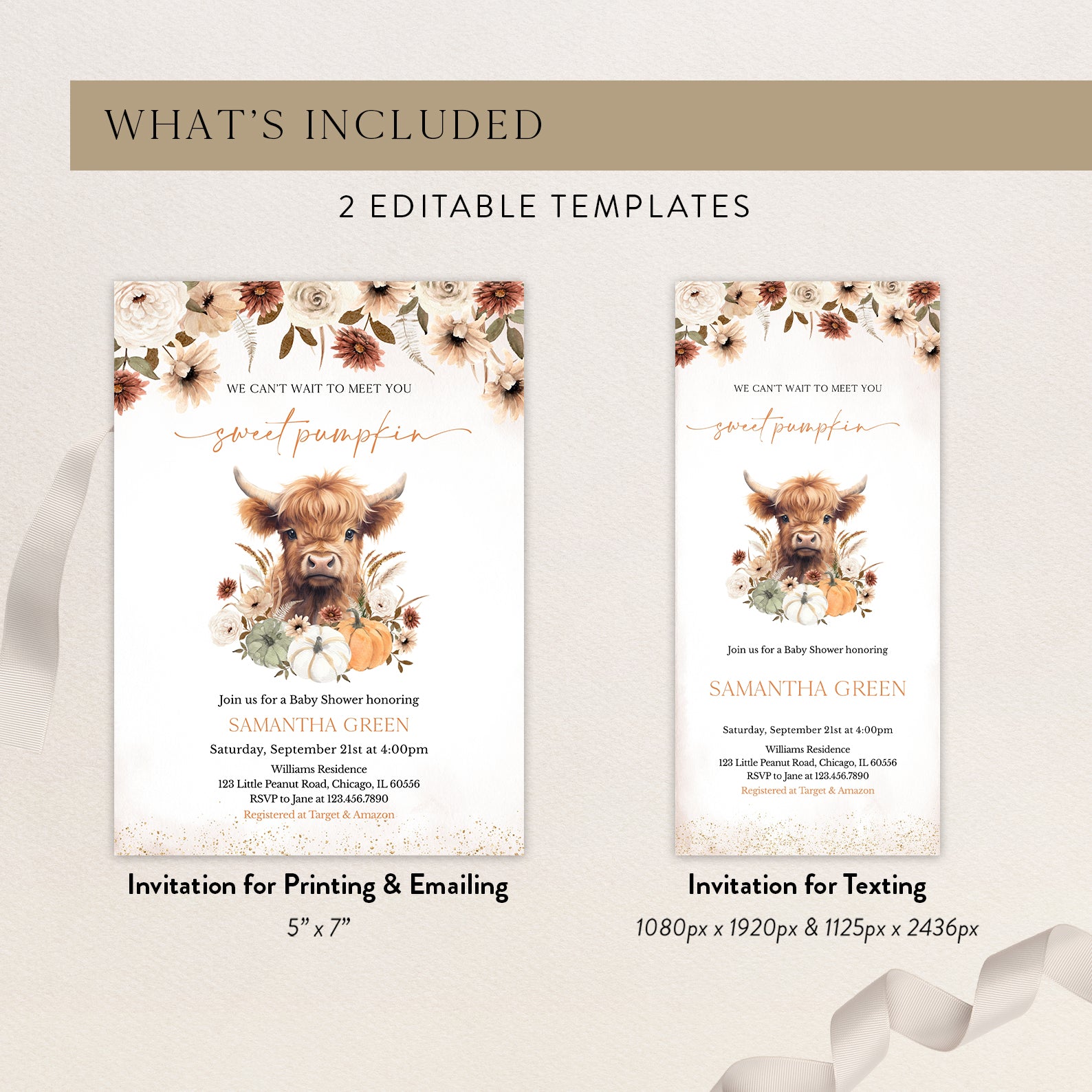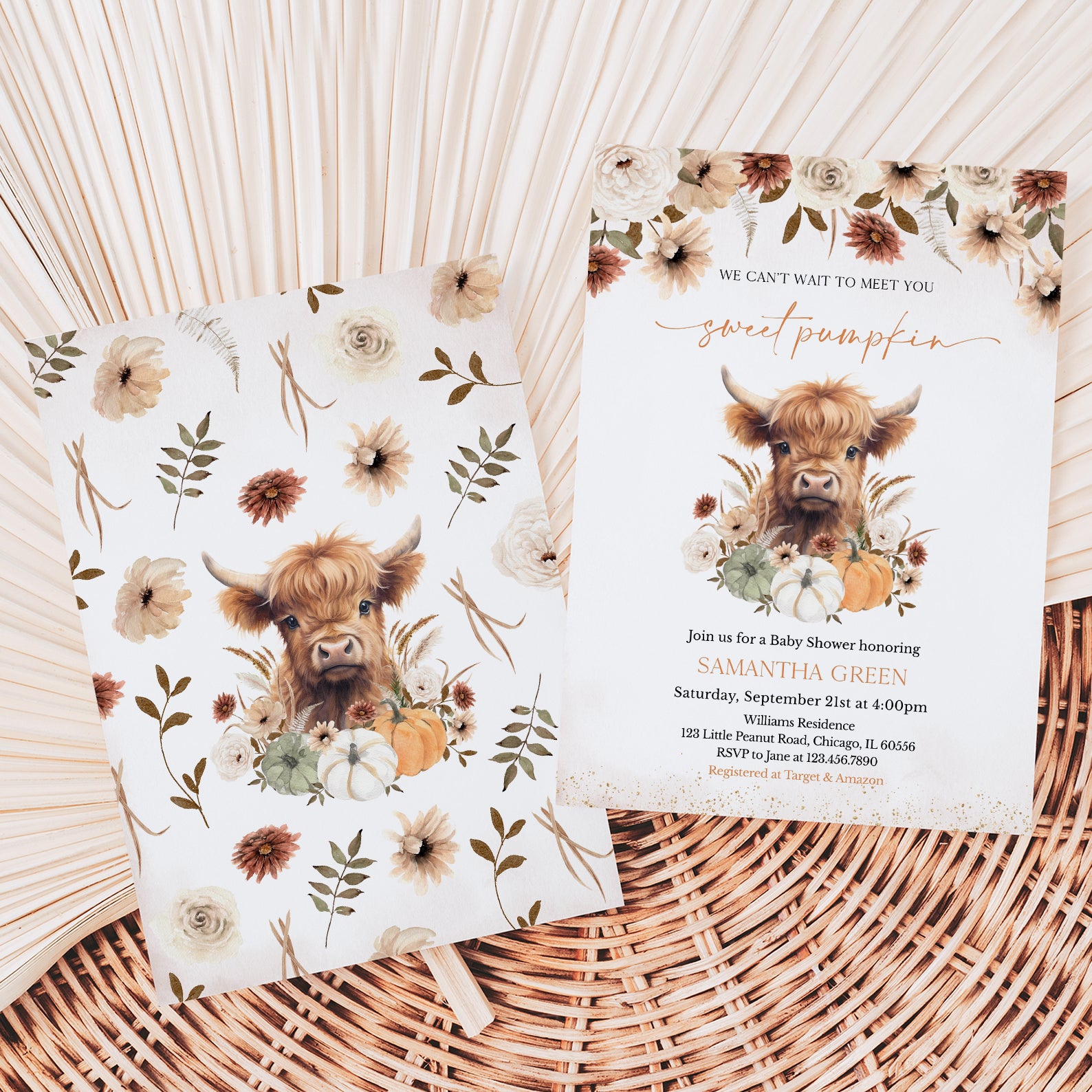 - Purchase this Fall Baby Shower Invite with Highland Cow & Floral Border template