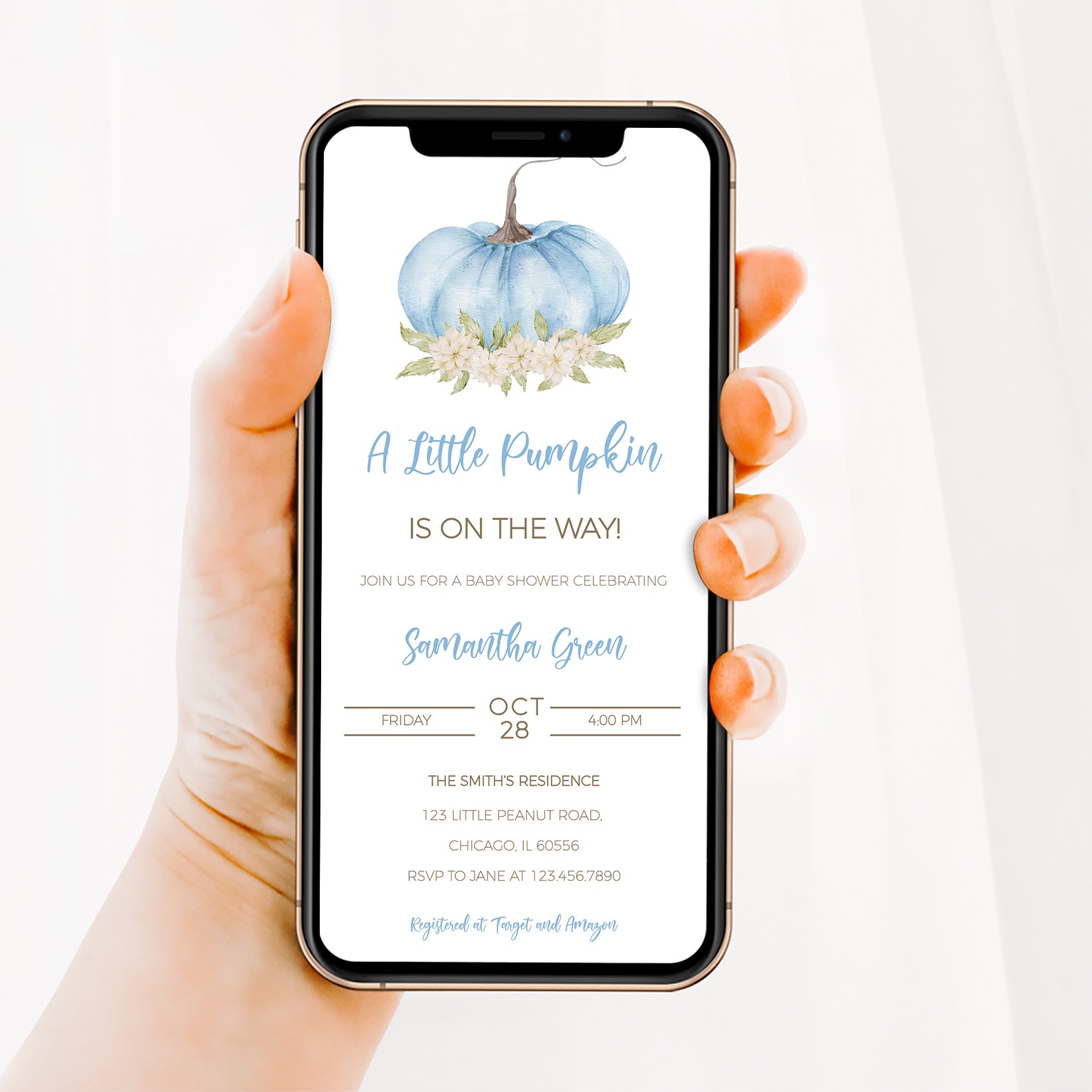 Celebrate the upcoming arrival of your little one with our charming Fall Baby Shower Digital Invitation, titled "Little Pumpkin is on the Way." This delightful design features a whimsical blue or pink pumpkin adorned with lush leaves and a delicate white flower, perfectly capturing the essence of autumn. Ideal for inviting friends and family to your fall baby shower, this invitation sets a warm and festive tone for your special celebration.