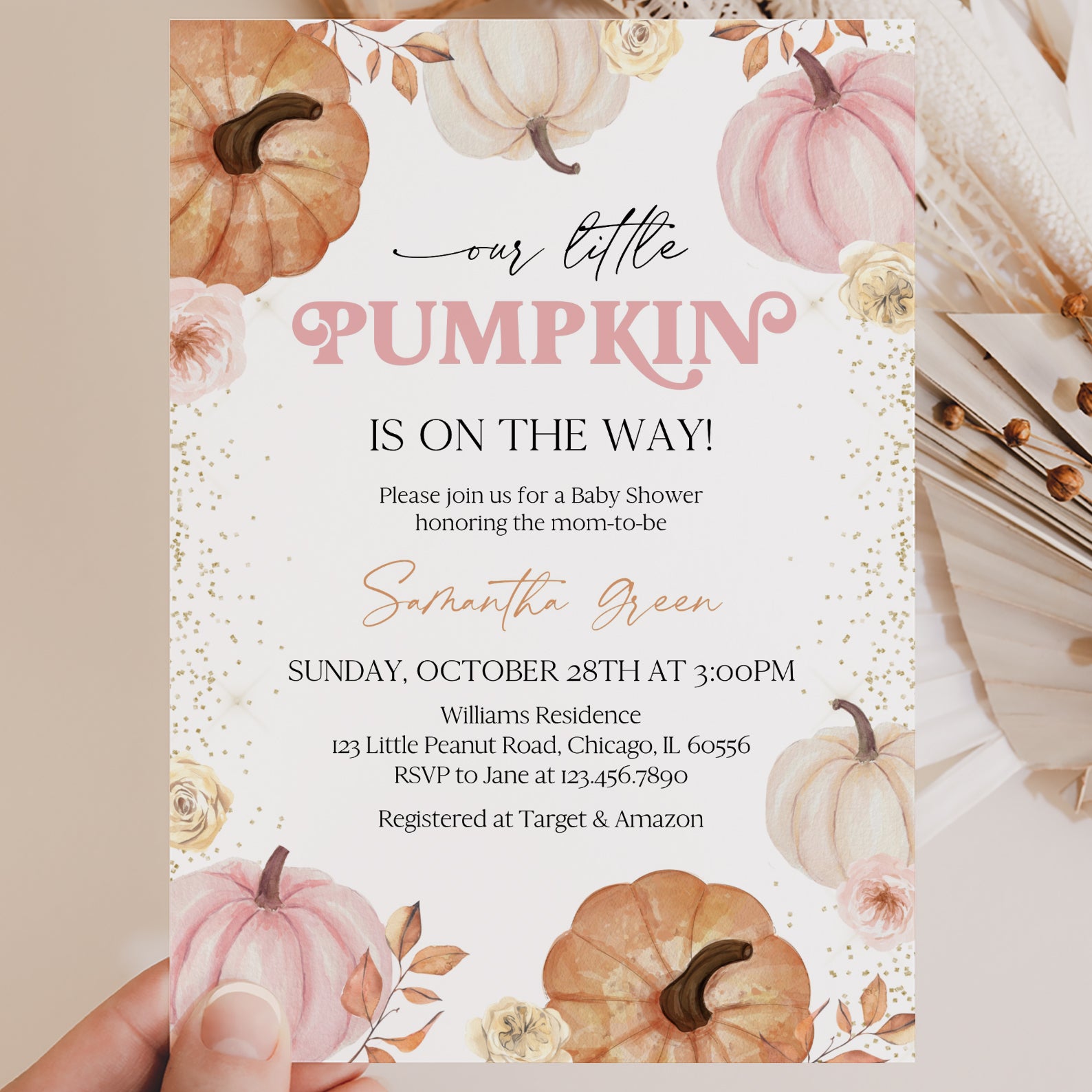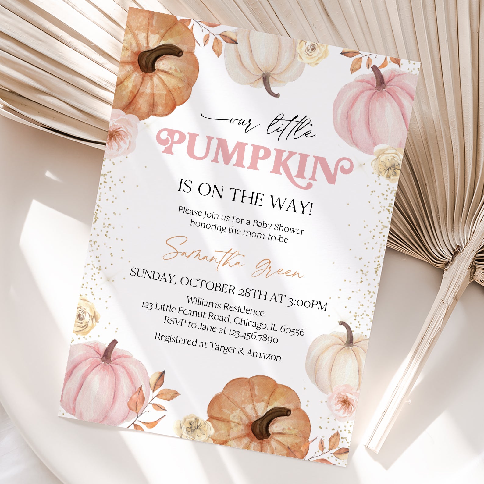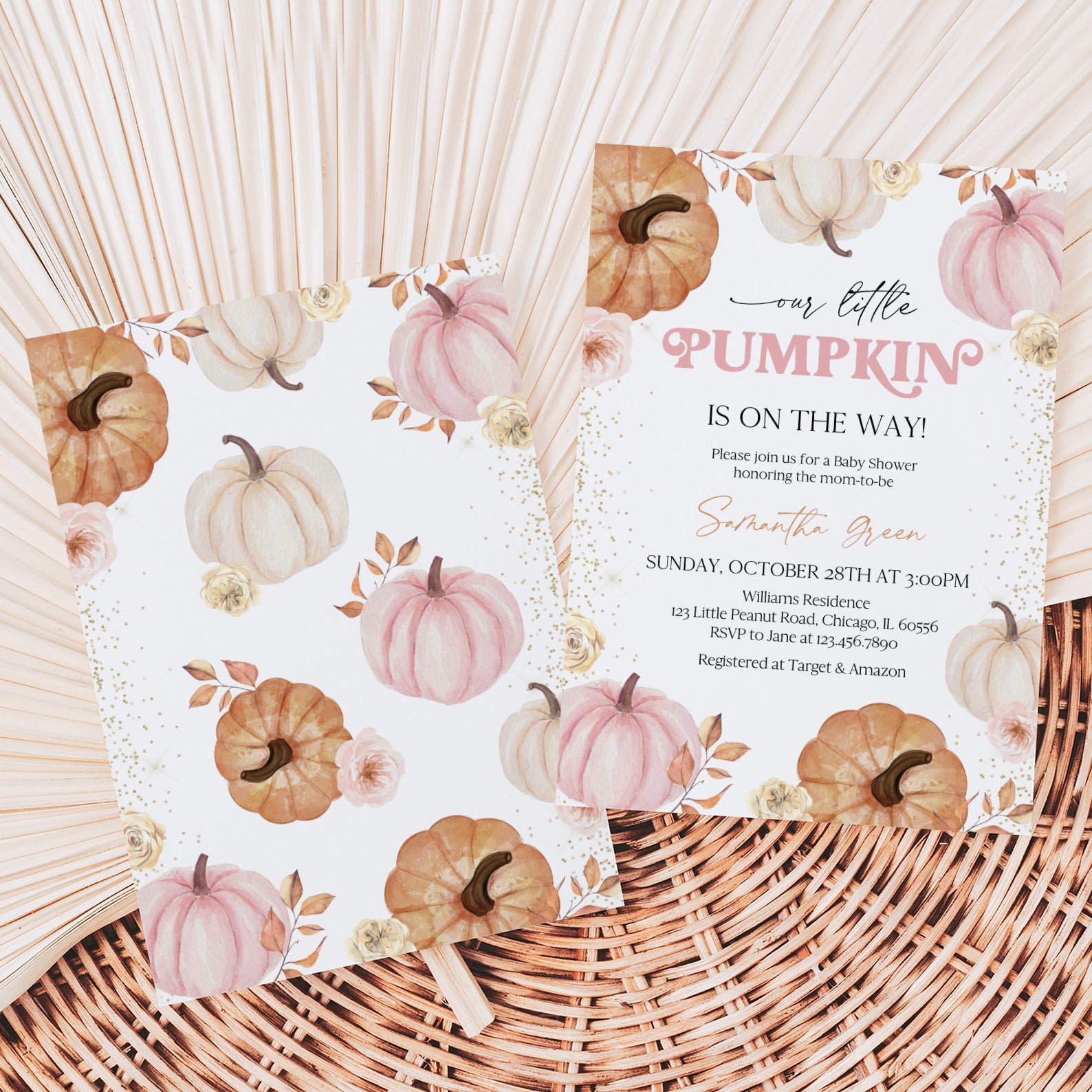 - Purchase this Little Pumpkin Baby Shower Invite: Watercolor Pumpkins & Gold template